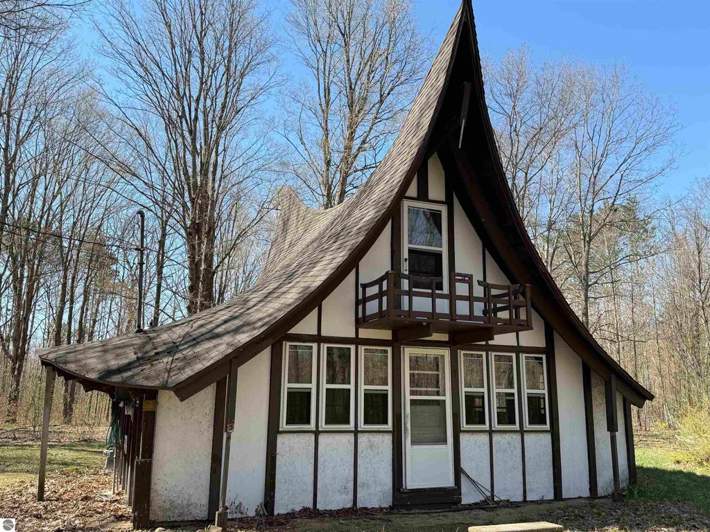 Fairytale Inspired Architecture! The attributes of this structure will set you apart from any "cookie-cutout" cottage. Taken down to the studs, this unique house is a blank slate awaiting your creativity to transform it into a personalized haven. Tap into your whimsical side to design and create an experience on the interior OR opt for chic touches and finishes for a cozy masterpiece. Either way, enjoy shared access to Starvation Lake, perfect for boating, fishing, and water activities. Utilities, including natural gas and Spectrum are already in place. Idiyllic location near skiing, snowmobiling, golf, ORV trail (side-by-side adventures await) and charming nearby towns. This property puts you in reach of year round adventure. Don't miss out"”see it today!