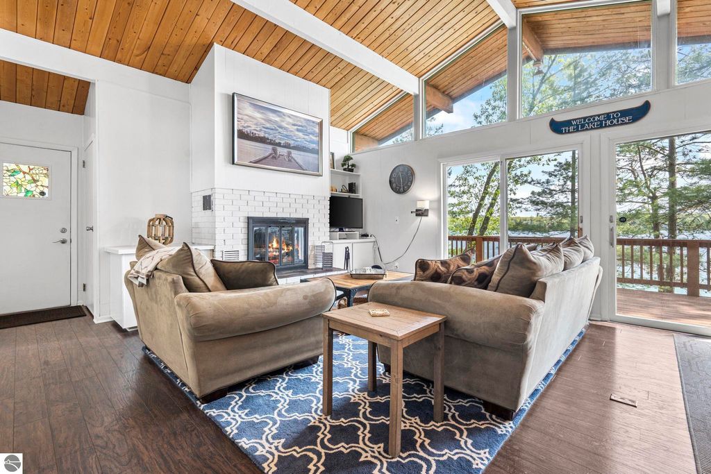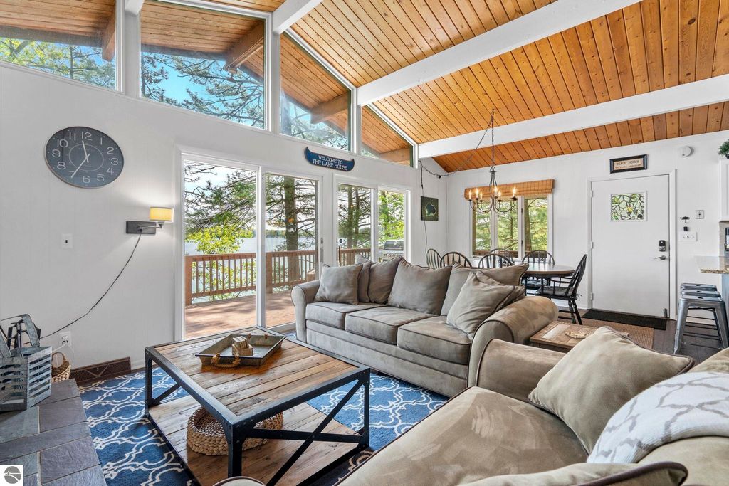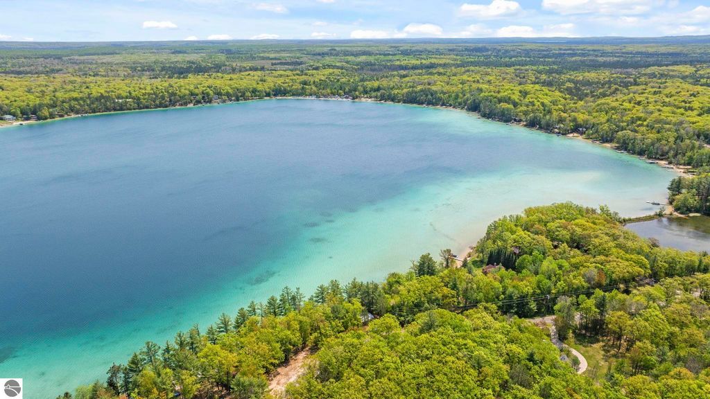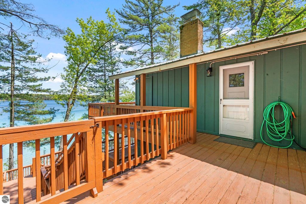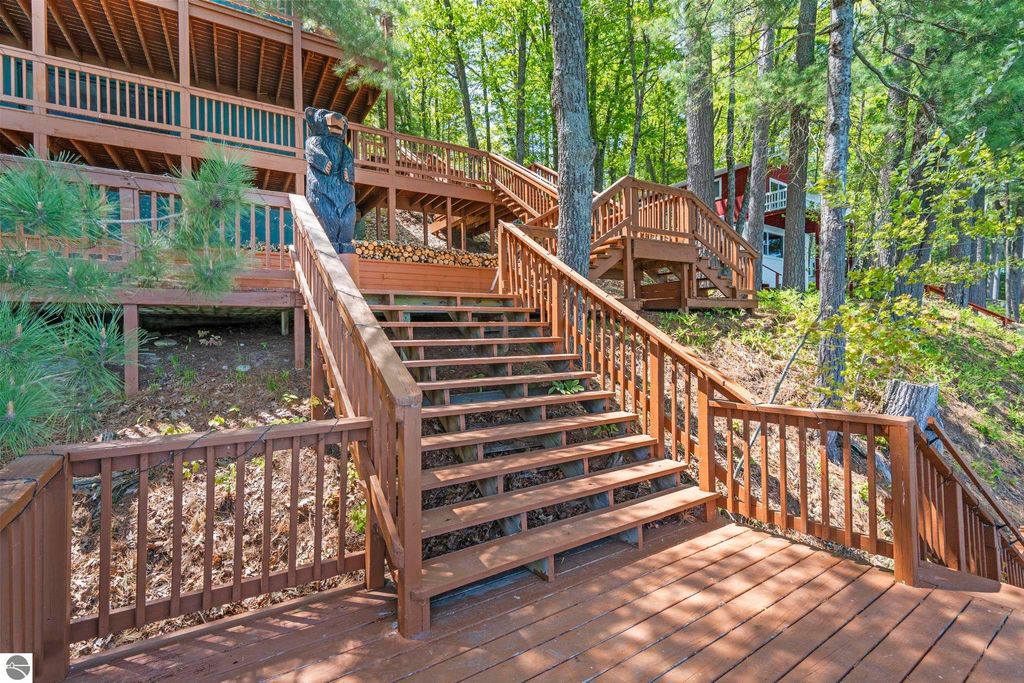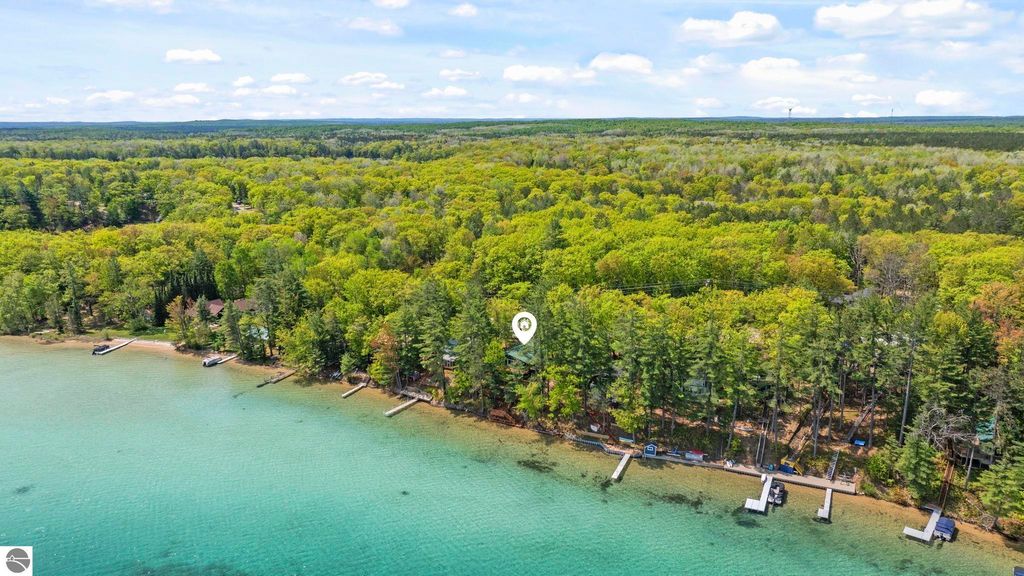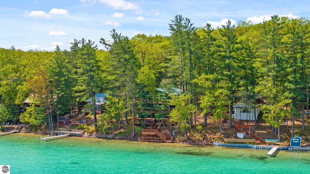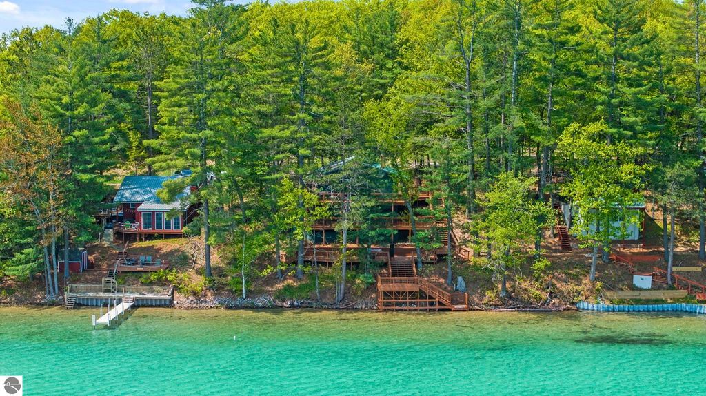 Welcome to Bear Lake in Kalkaska, Michigan! One of Northern Michigan's most coveted all-sports lakes, affectionately known as "Little Torch Lake" for its Caribbean-blue, crystal-clear water, hard sandy bottom & gradual walkout. It is a 316-acre, spring-fed hidden treasure, free of weeds & invasive species thanks to regular monitoring. Limited public access helps preserve its serenity. Nestled on 100 ft of private frontage, this beautifully updated home offers panoramic lake views from a massive 4-tier, 2,000+ sq ft deck system with locking gates for family & pet safety. The exterior and deck were freshly repainted in 2025. Watch the sunrise w/morning coffee, kayak during no-wake hours, enjoy waterskiing & wakeboarding, & anchor at the sand bar. Evenings are for boat cruises, barbeques, cocktails by the fire & incredible sunsets. This turnkey, furnished home has nearly 1,600 sq ft of living space w/abundant natural light, 3 bedrooms & 2 baths, sleeps 12+, vaulted pine ceiling & a wall of windows with walkout to deck. The modern kitchen has granite counters & stainless appliances & the well water tastes amazing! A spacious lower level offers bonus sleeping & recreation space, laundry area & walkout door wall to deck. Extras include central A/C, gas furnace, large capacity hot water tank, wood-burning fireplace, washer/dryer, new remote access smart features such as security system & thermostat; ceiling fans, updated outside lighting & easy access circle drive w/ parking for 8. A 60 ft steel FLOE roll-in dock system with sundeck & accessories is also available. This listing includes a 0.5-acre wooded buildable lot across the street with 2-car garage and abundant parking space - perfect for a guest house or toy barn. Recreational ORV trail enthusiasts will love all-season access to the State-marked trail system just down the street plus M-72 Trailhead 1/4 mile away. Just 15 mins to Grayling & 35 to Traverse City. A rare chance to own a true up north, lakefront Paradise!