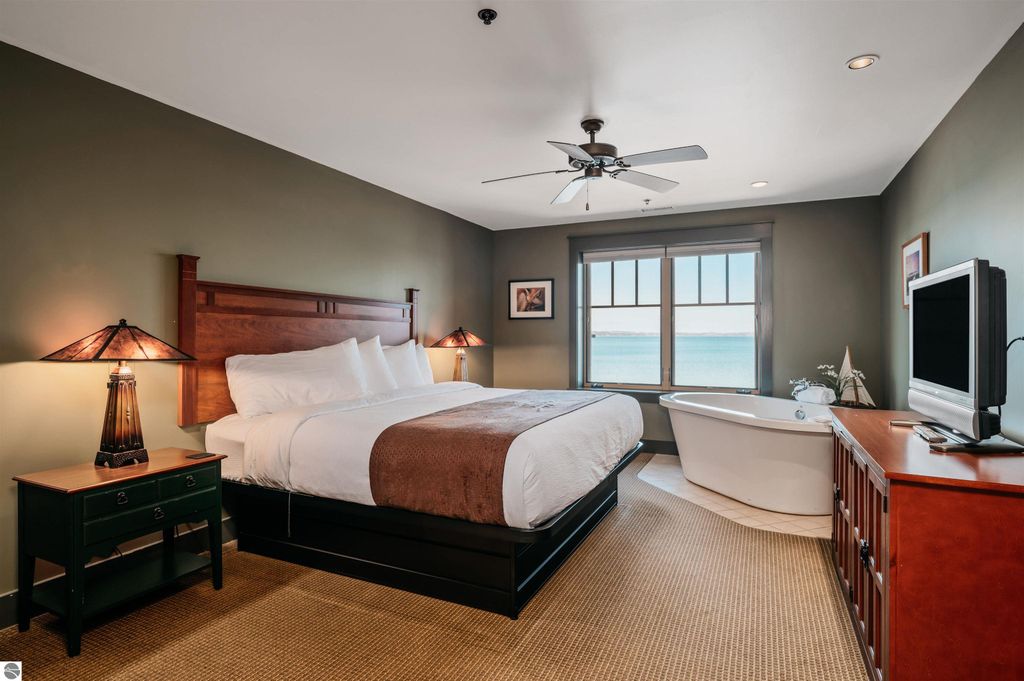 Tamarack Lodge! Fractional ownership. White Birch room 203 is a 1,420 sq ft, 2br 2ba second floor unit. Absolutely outstanding water views and the best sugar sand beach imaginable from this waterfront condo in Traverse City on Lake Michigan's East Grand Traverse Bay. This is a fixed week unit (week 1). $67 per month association dues cover pretty much everything except for room cleaning and property taxes. All furnishings and linens included, even the fully stocked kitchen (appliances, pots, pans, silverware, etc). The purchase price is a one time fee guaranteeing you week 1 year after year as long as you pay the monthly HOA, annual property taxes and cleaning fee. Get your piece of the North today!