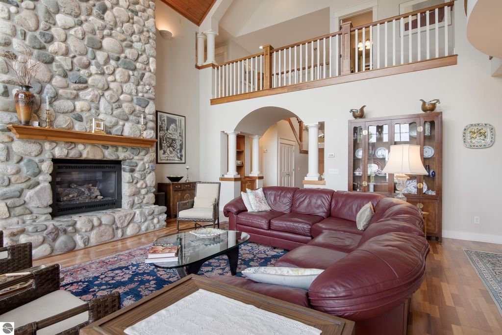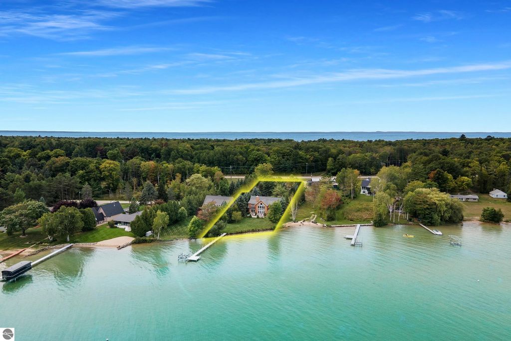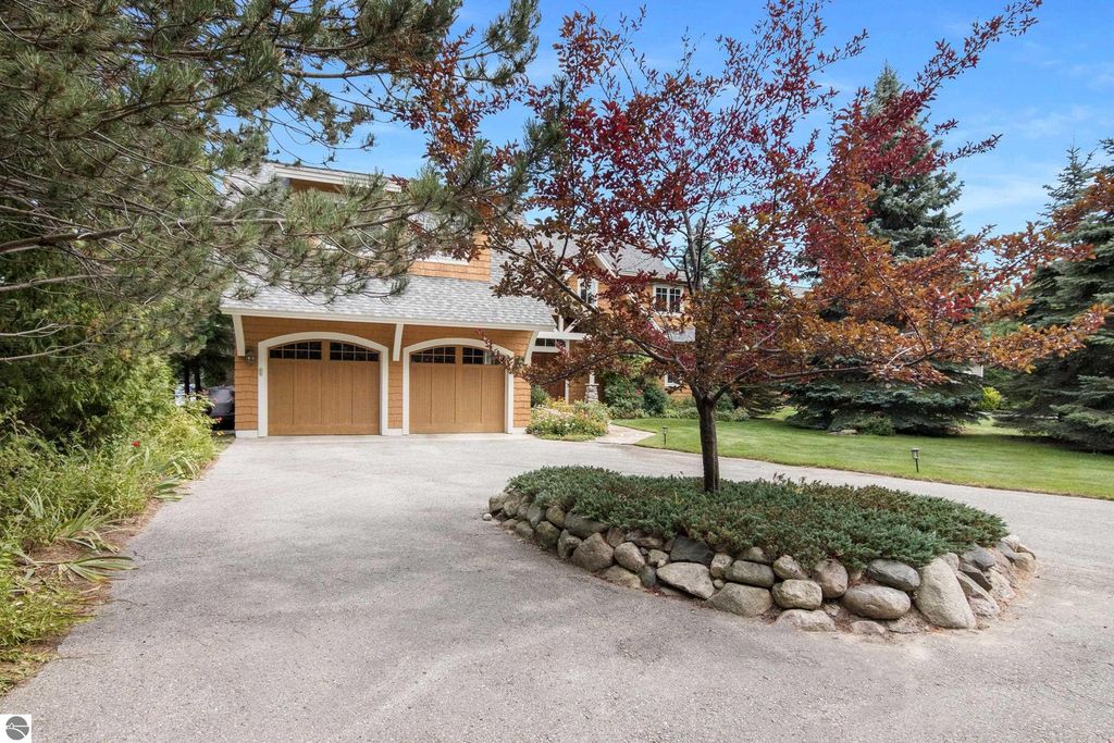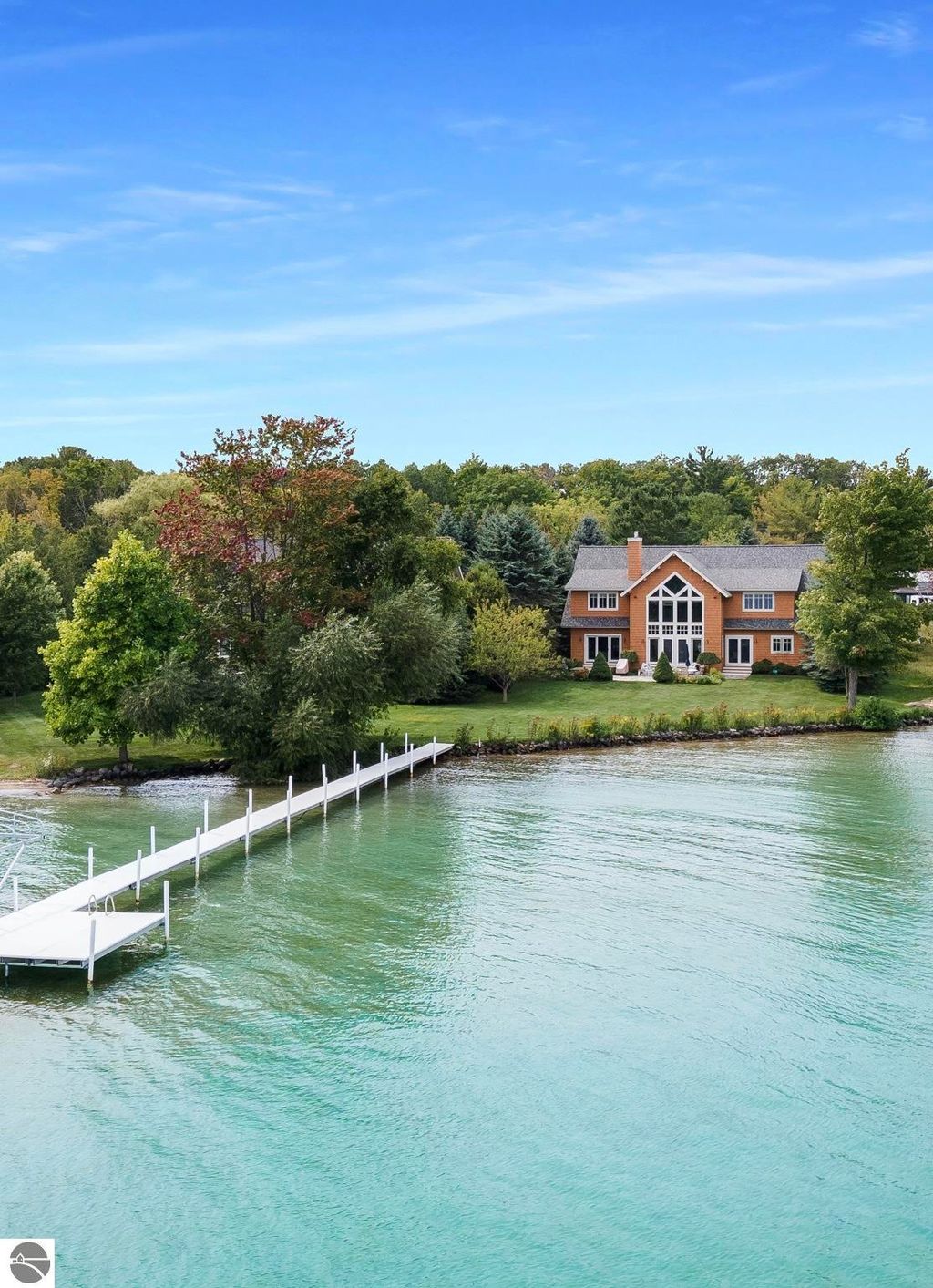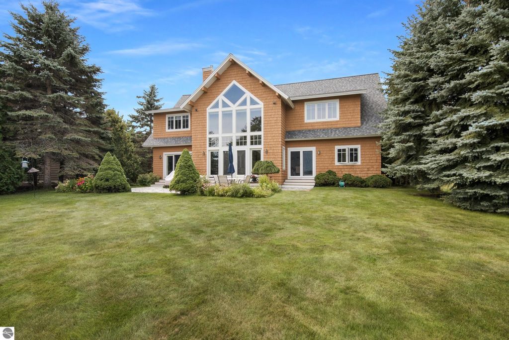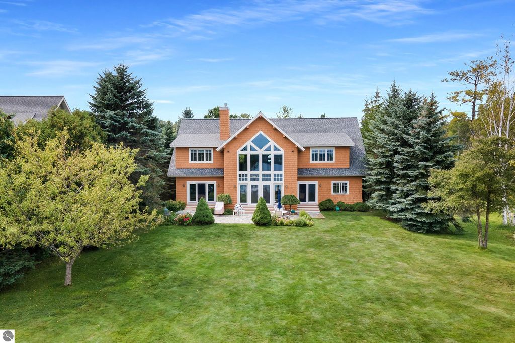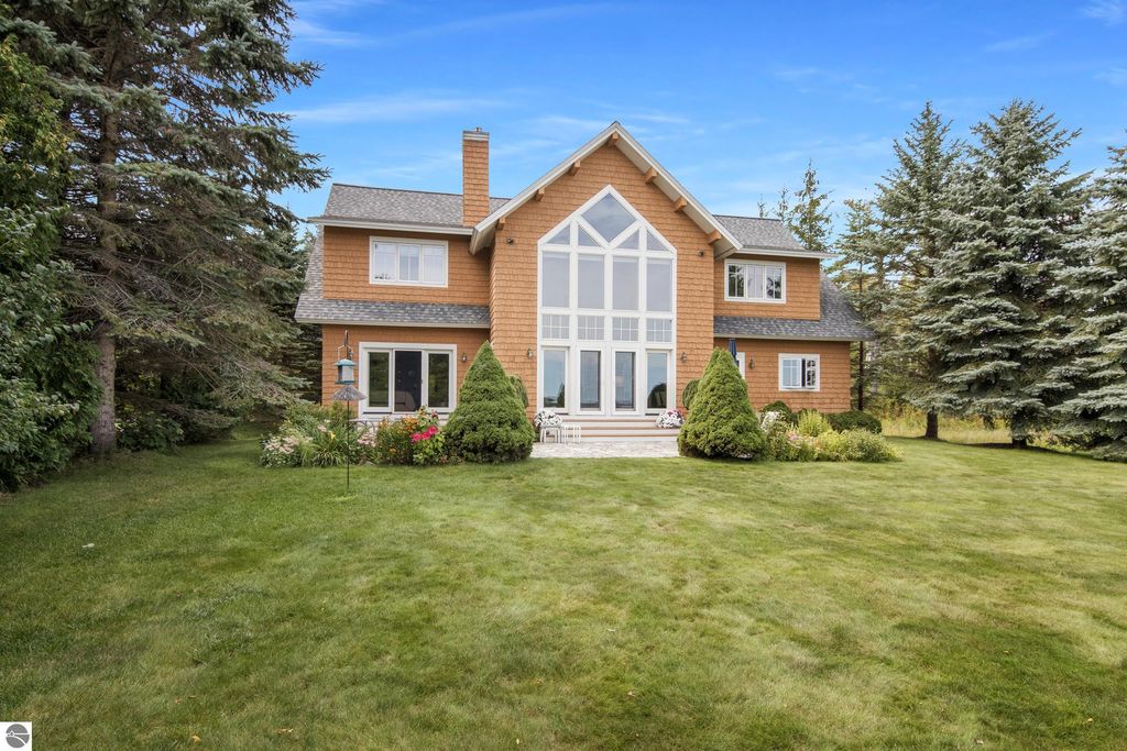 TORCH LAKE RARE SANDY PRIVATE FRONTAGE (100')!!!! Absolutely STUNNING 4BR, 3.5BA architecturally gorgeous design and details! This meticulous cedar shake home features a gourmet kitchen w/island, 2- story real stone fireplace, hardwood floors, first floor primary suite, den w/fireplace, 2nd floor suite, 2 additional bedrooms and bath, huge finished bonus room above garage plus "lofted" family room! Fabulous water views from nearly every room, extensive outdoor entertaining area with a perfectly level sprawling lawn to the water's edge! Secluded location with only one other beautiful home on this private dead-end drive.