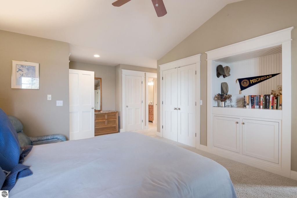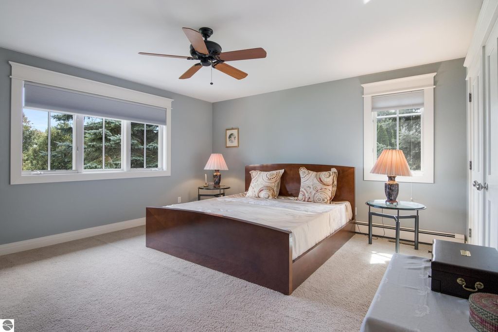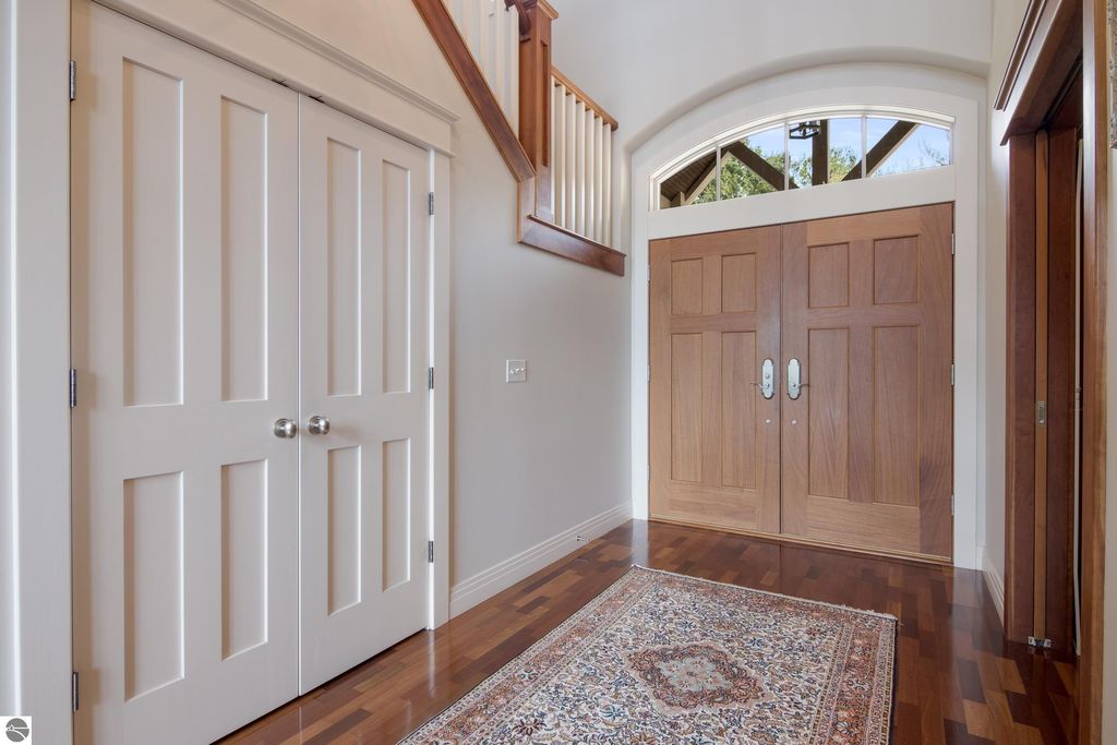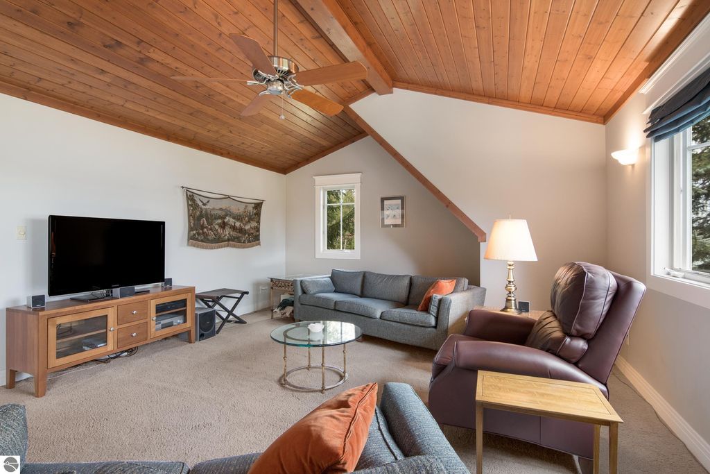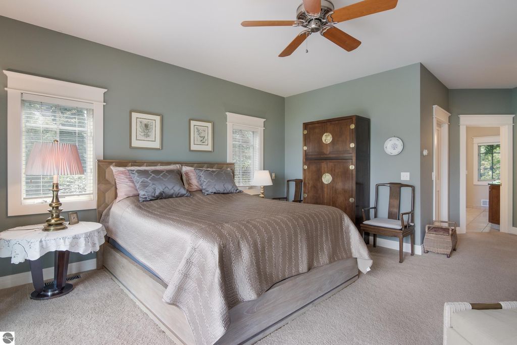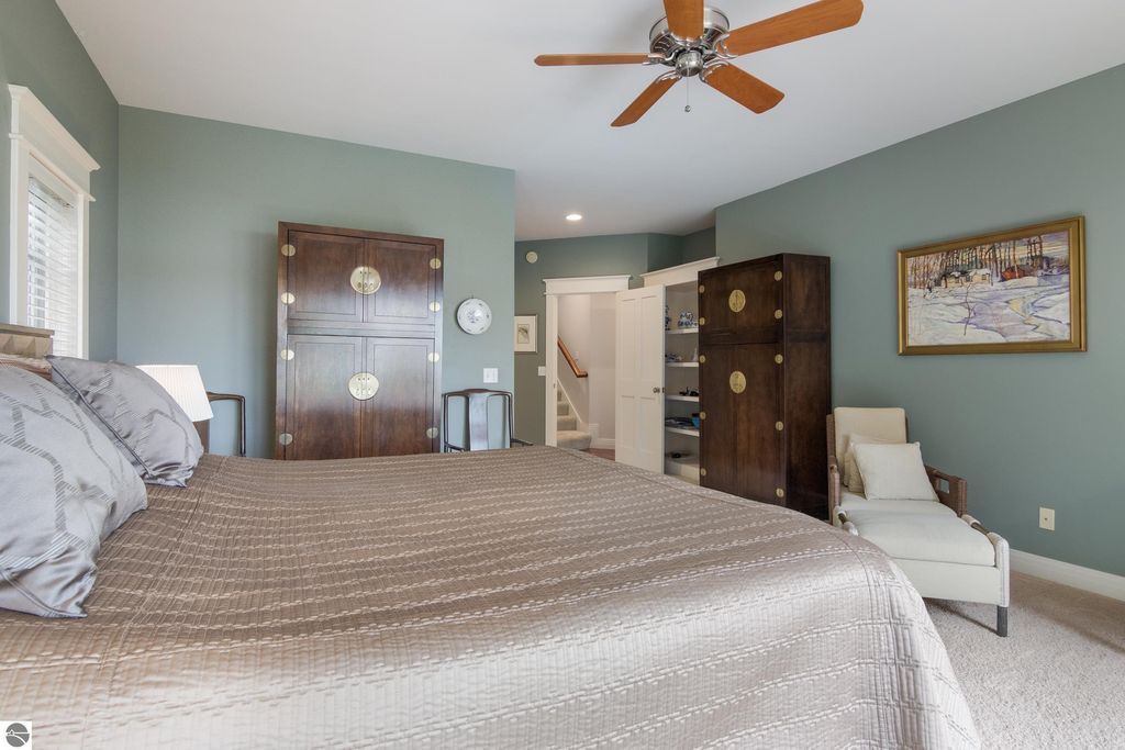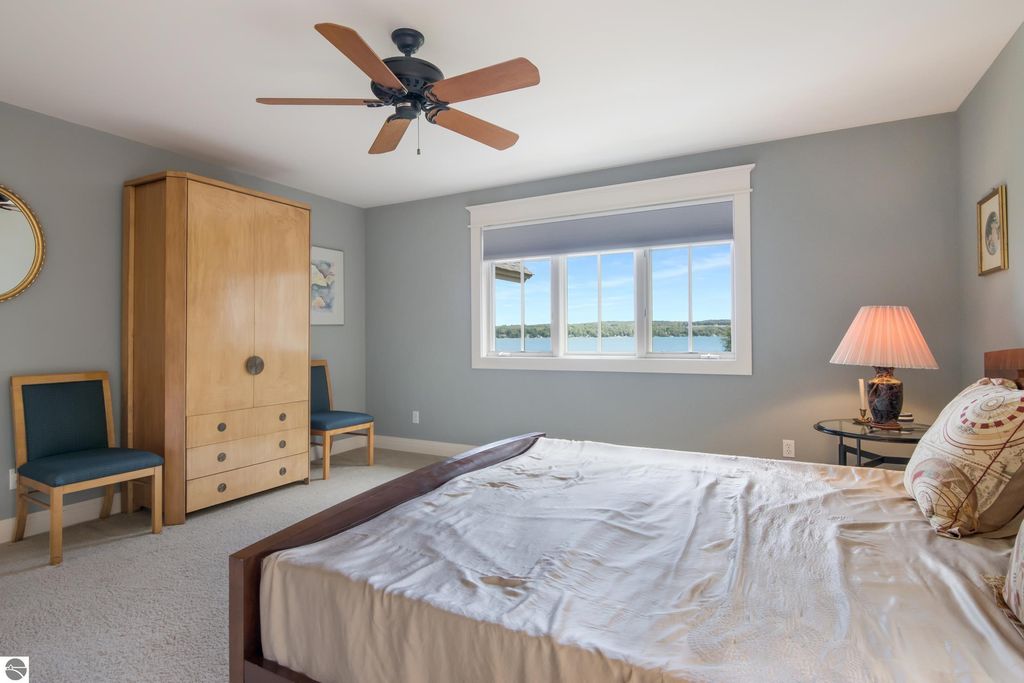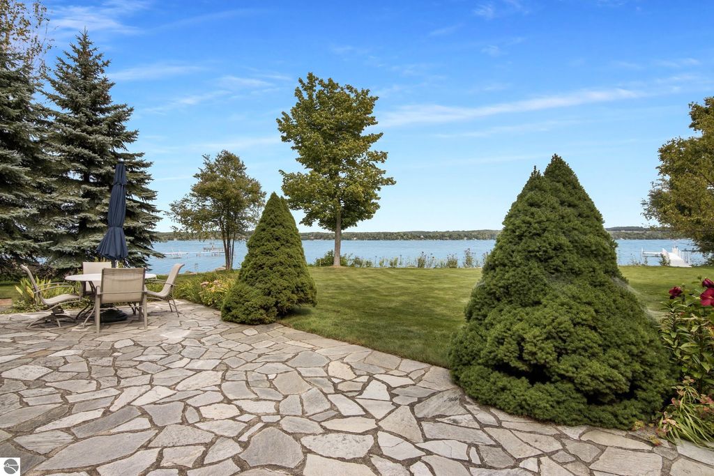 TORCH LAKE RARE SANDY PRIVATE FRONTAGE (100')!!!! Absolutely STUNNING 4BR, 3.5BA architecturally gorgeous design and details! This meticulous cedar shake home features a gourmet kitchen w/island, 2- story real stone fireplace, hardwood floors, first floor primary suite, den w/fireplace, 2nd floor suite, 2 additional bedrooms and bath, huge finished bonus room above garage plus "lofted" family room! Fabulous water views from nearly every room, extensive outdoor entertaining area with a perfectly level sprawling lawn to the water's edge! Secluded location with only one other beautiful home on this private dead-end drive.
