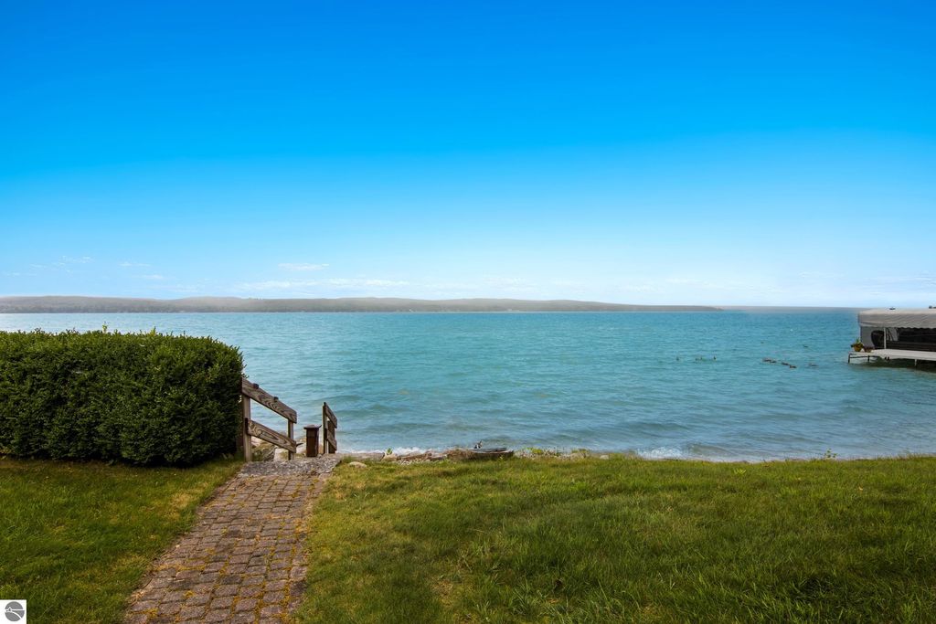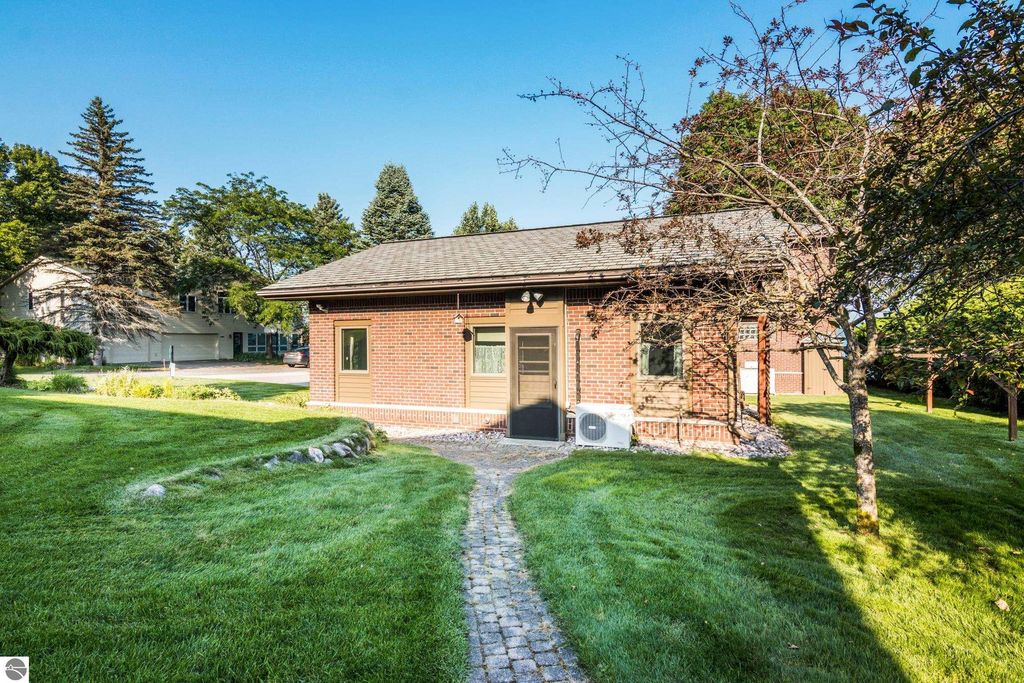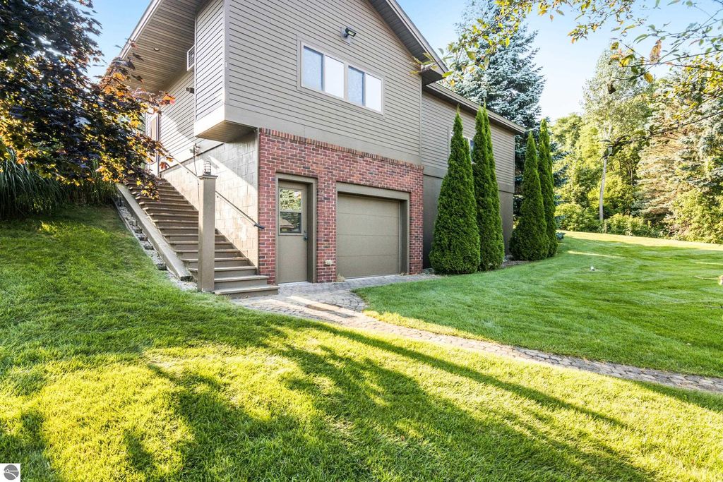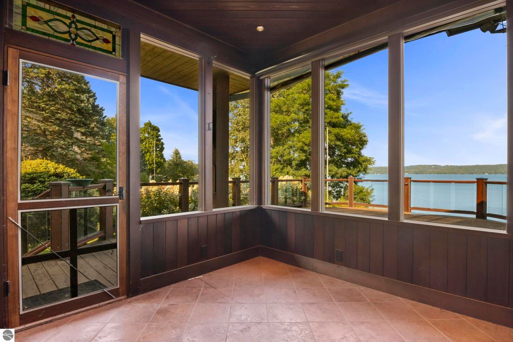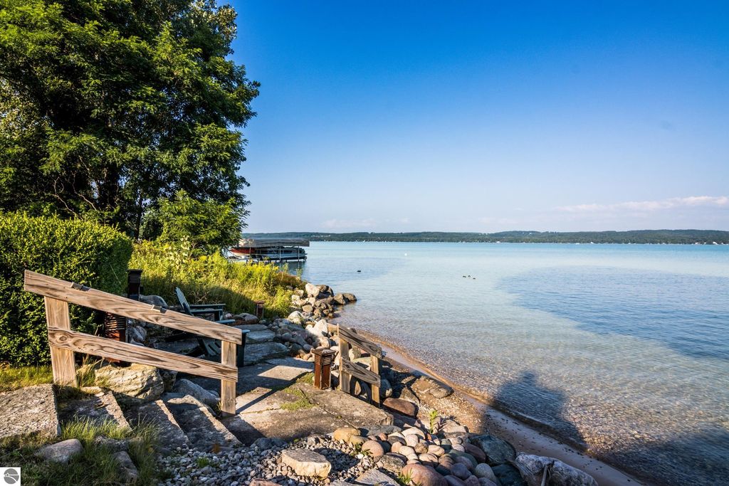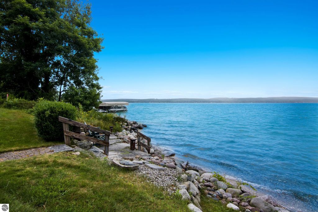 TORCH LAKE CRAFTSMAN STYLED HOME! A stone walkway leads you to the custom front door of your new waterfront brick home, with Frank Lloyd Wright inspired stain glass accents. Enter the foyer and take in the substantial design details considered when building this masterpiece. The living room features a custom brick fireplace, beamed ceilings, panoramic views of your Torch Lake paradise, sliding door walls leading to the deck, and gorgeous Maple hardwood floors. The cook in your family will delight in the kitchen with cherry cabinetry, granite counter tops, professional stainless appliances, large pantry with built-ins and more. Grab your favorite book or sit down for a game night on the screened in porch and listen to the waves lap the shoreline. Wake up to the sun rising over the lake in the primary suite enhanced by a large private bathroom with jetted soaking tub, separate shower; granite vanity; walk-in closet. You will appreciate the convenient main floor laundry room with plenty of cabinetry and built in desk area. Upstairs you will discover two additional bedrooms with a shared bath. The walkout lower level features a family room with a gorgeous stone fireplace, custom built-ins, slider to a patio; temperature-controlled wine cellar; mechanical room/workshop and best of all a Finnish sauna perfect after a day spent on the water. Your guests will appreciate the 2-bedroom guest quarters complete with living room, kitchenette and private bath. Outdoor entertaining opportunities abound with a large deck overlooking the lake and the glass paneled railing allows for unobstructed views. Professionally landscaped grounds with beautiful mature plantings and irrigation system. 2 car attached garage plus an additional detached heated garage with space for up to 4 cars, workshop area, and plenty of additional storage space. Experience lake living with family and friends and explore the miles of shoreline of the Chain-of-Lakes.