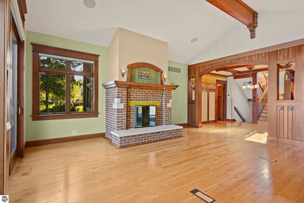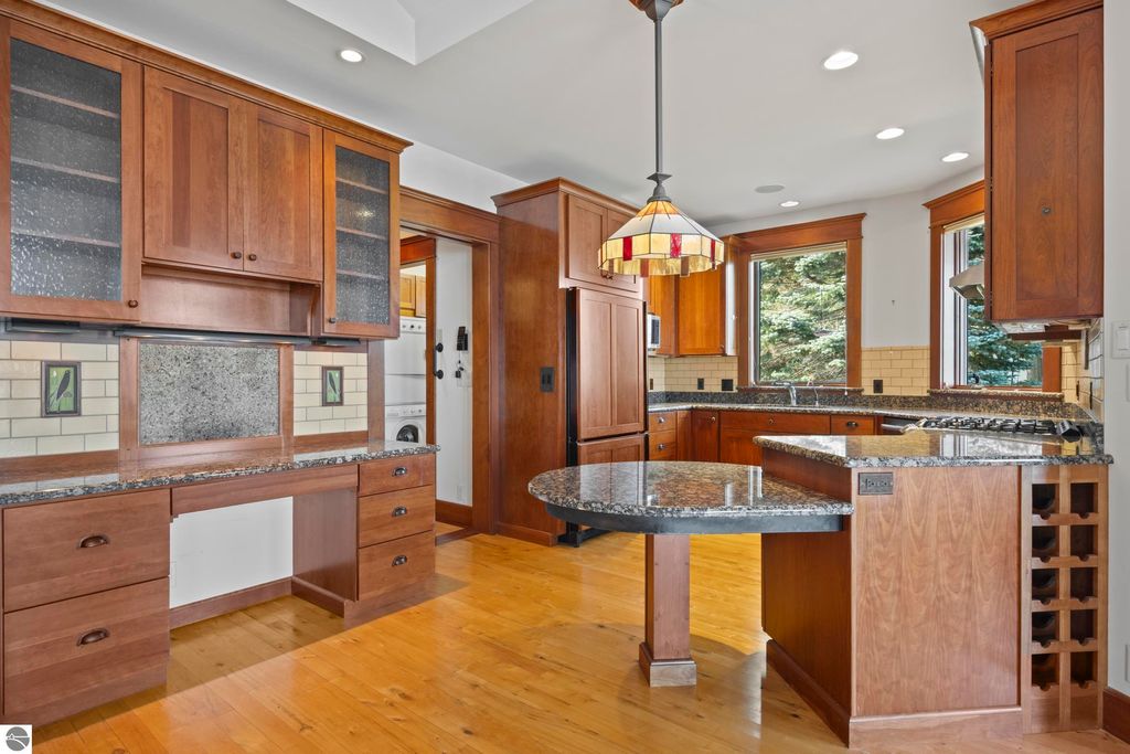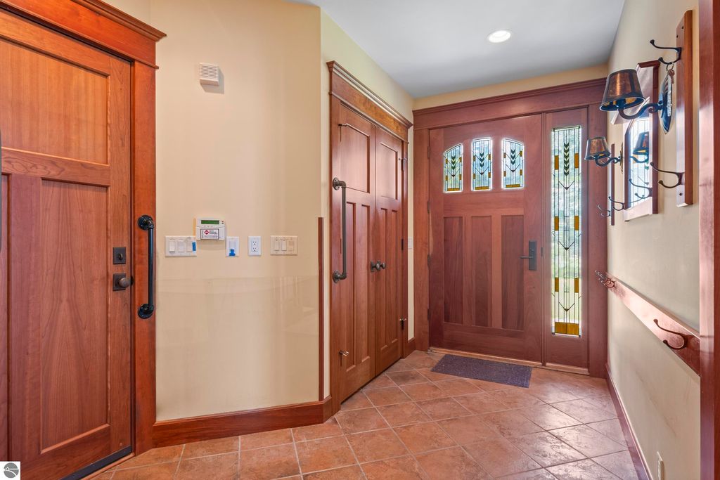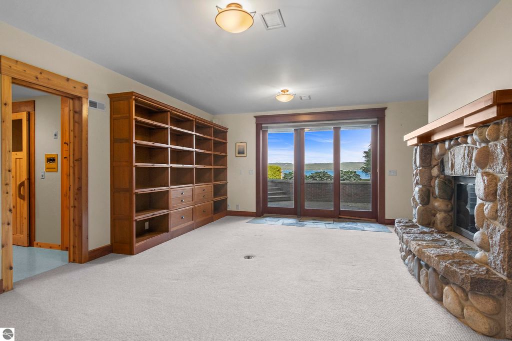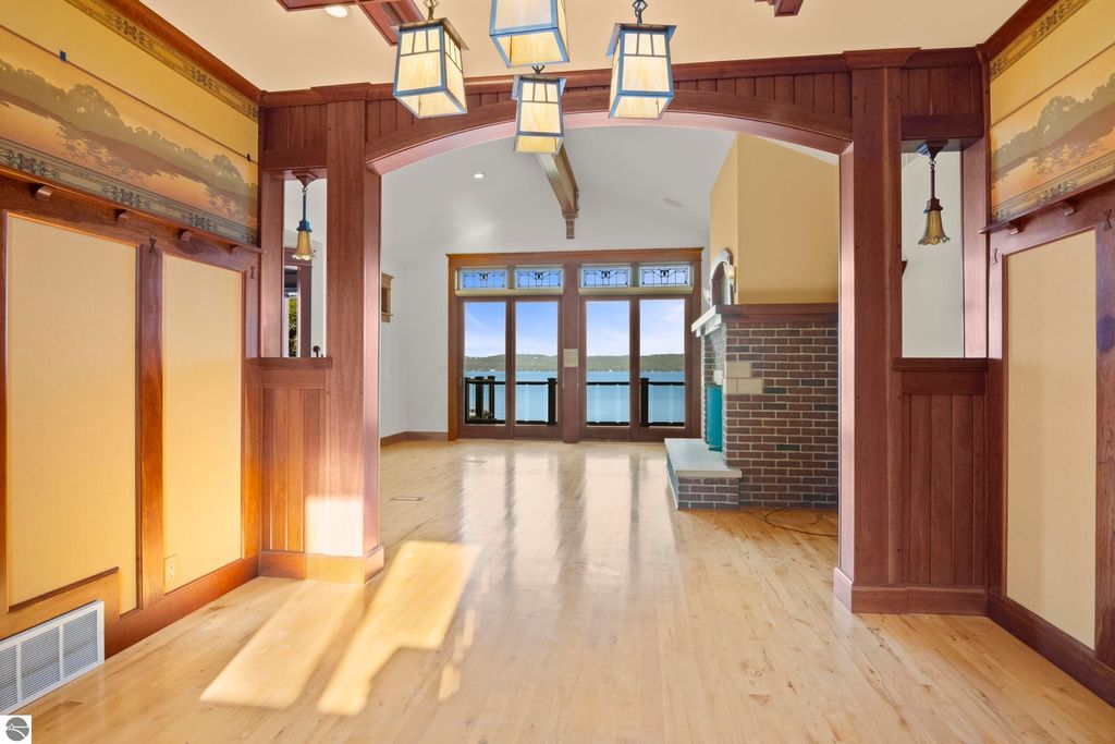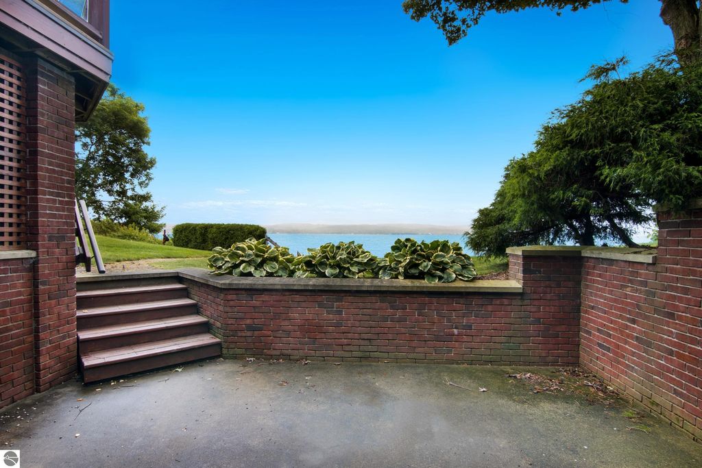 TORCH LAKE CRAFTSMAN STYLED HOME! A stone walkway leads you to the custom front door of your new waterfront brick home, with Frank Lloyd Wright inspired stain glass accents. Enter the foyer and take in the substantial design details considered when building this masterpiece. The living room features a custom brick fireplace, beamed ceilings, panoramic views of your Torch Lake paradise, sliding door walls leading to the deck, and gorgeous Maple hardwood floors. The cook in your family will delight in the kitchen with cherry cabinetry, granite counter tops, professional stainless appliances, large pantry with built-ins and more. Grab your favorite book or sit down for a game night on the screened in porch and listen to the waves lap the shoreline. Wake up to the sun rising over the lake in the primary suite enhanced by a large private bathroom with jetted soaking tub, separate shower; granite vanity; walk-in closet. You will appreciate the convenient main floor laundry room with plenty of cabinetry and built in desk area. Upstairs you will discover two additional bedrooms with a shared bath. The walkout lower level features a family room with a gorgeous stone fireplace, custom built-ins, slider to a patio; temperature-controlled wine cellar; mechanical room/workshop and best of all a Finnish sauna perfect after a day spent on the water. Your guests will appreciate the 2-bedroom guest quarters complete with living room, kitchenette and private bath. Outdoor entertaining opportunities abound with a large deck overlooking the lake and the glass paneled railing allows for unobstructed views. Professionally landscaped grounds with beautiful mature plantings and irrigation system. 2 car attached garage plus an additional detached heated garage with space for up to 4 cars, workshop area, and plenty of additional storage space. Experience lake living with family and friends and explore the miles of shoreline of the Chain-of-Lakes.