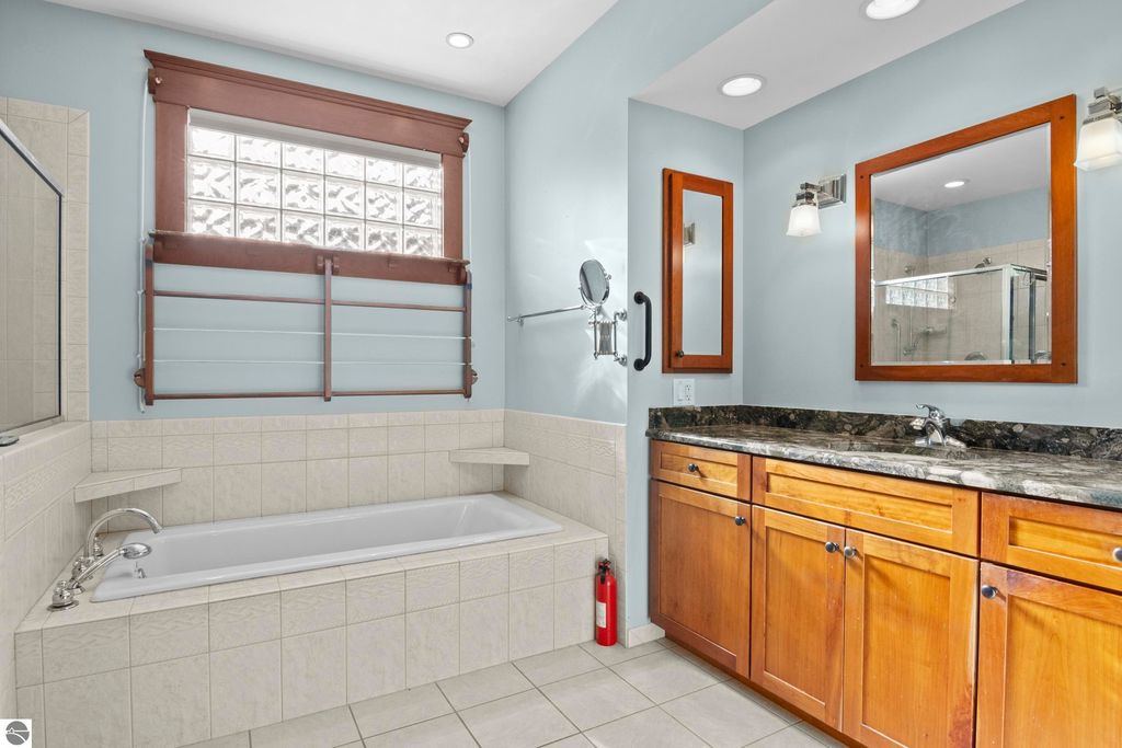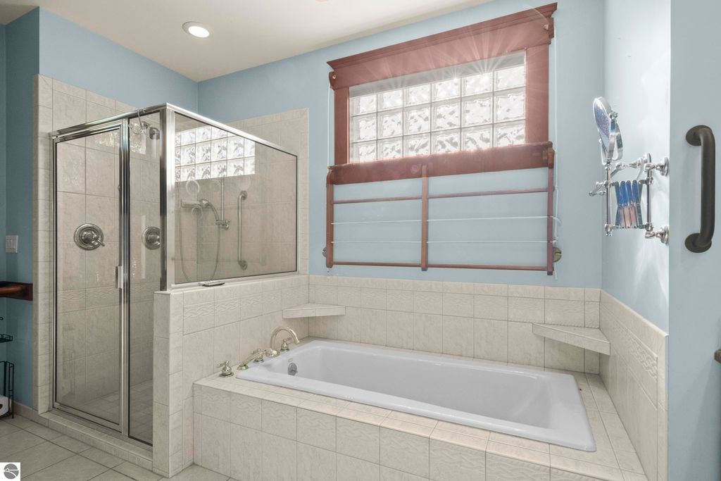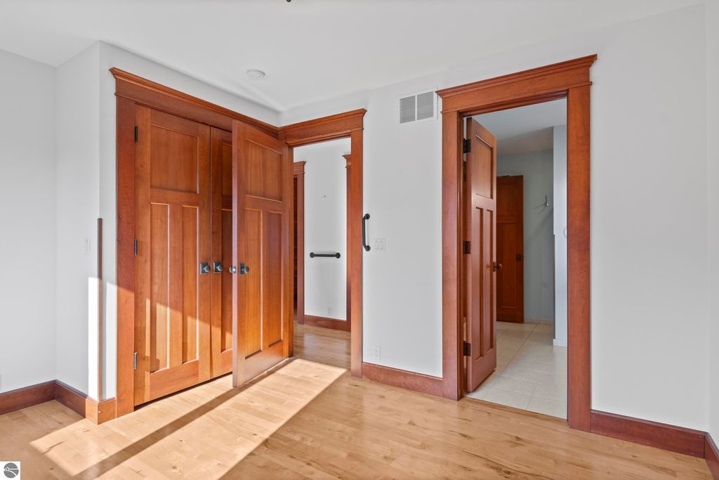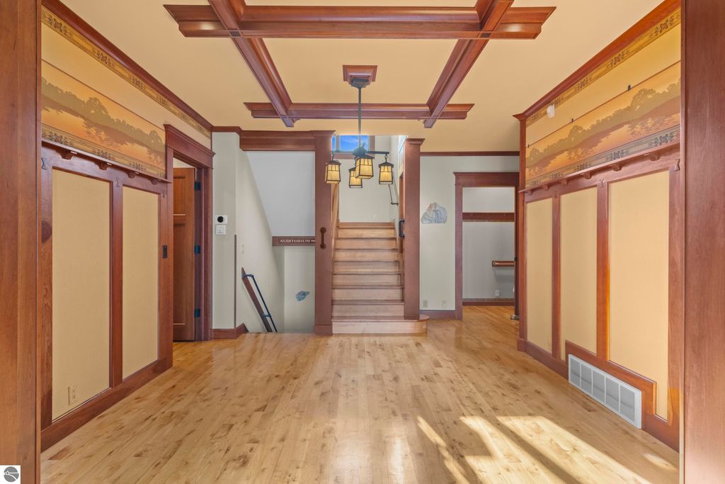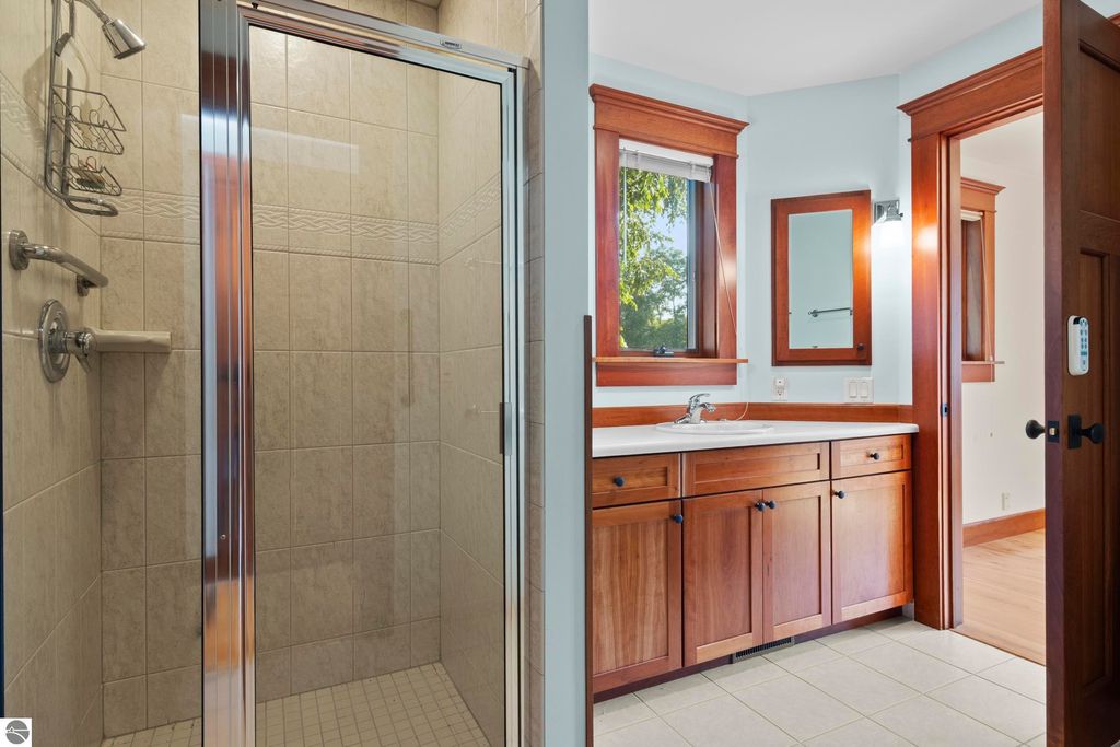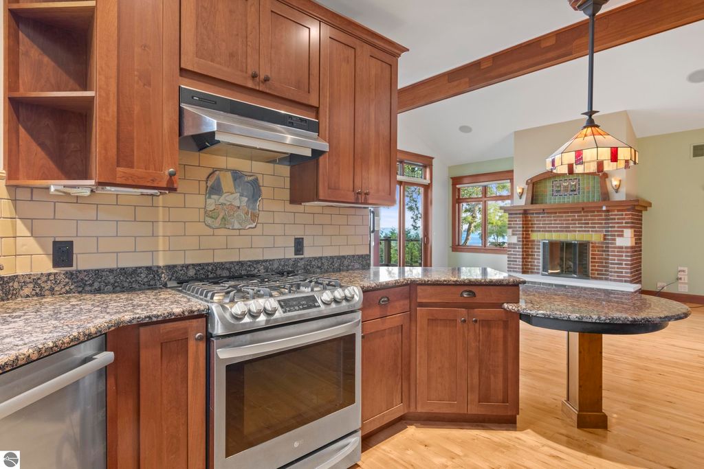 TORCH LAKE CRAFTSMAN STYLED HOME! A stone walkway leads you to the custom front door of your new waterfront brick home, with Frank Lloyd Wright inspired stain glass accents. Enter the foyer and take in the substantial design details considered when building this masterpiece. The living room features a custom brick fireplace, beamed ceilings, panoramic views of your Torch Lake paradise, sliding door walls leading to the deck, and gorgeous Maple hardwood floors. The cook in your family will delight in the kitchen with cherry cabinetry, granite counter tops, professional stainless appliances, large pantry with built-ins and more. Grab your favorite book or sit down for a game night on the screened in porch and listen to the waves lap the shoreline. Wake up to the sun rising over the lake in the primary suite enhanced by a large private bathroom with jetted soaking tub, separate shower; granite vanity; walk-in closet. You will appreciate the convenient main floor laundry room with plenty of cabinetry and built in desk area. Upstairs you will discover two additional bedrooms with a shared bath. The walkout lower level features a family room with a gorgeous stone fireplace, custom built-ins, slider to a patio; temperature-controlled wine cellar; mechanical room/workshop and best of all a Finnish sauna perfect after a day spent on the water. Your guests will appreciate the 2-bedroom guest quarters complete with living room, kitchenette and private bath. Outdoor entertaining opportunities abound with a large deck overlooking the lake and the glass paneled railing allows for unobstructed views. Professionally landscaped grounds with beautiful mature plantings and irrigation system. 2 car attached garage plus an additional detached heated garage with space for up to 4 cars, workshop area, and plenty of additional storage space. Experience lake living with family and friends and explore the miles of shoreline of the Chain-of-Lakes.