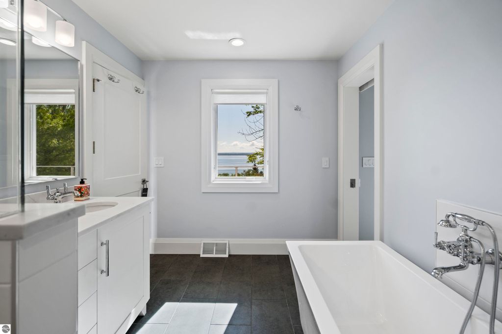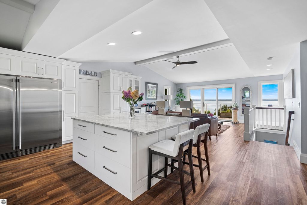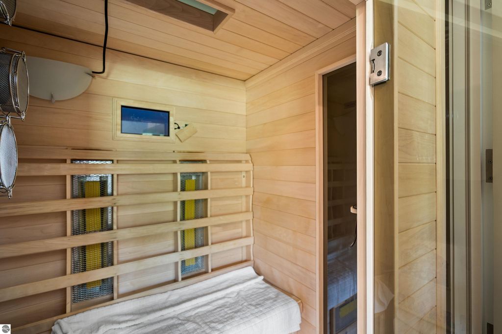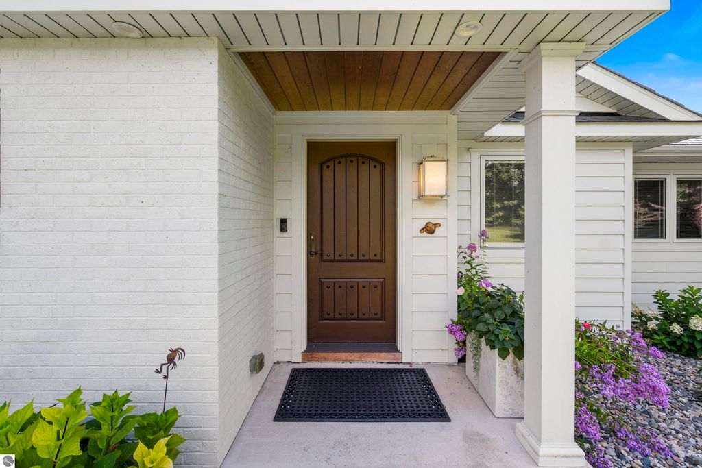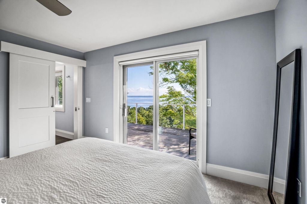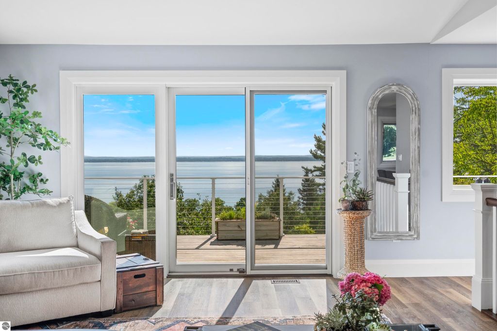 Old Mission Stunner! With expansive East Grand Traverse Bay views and shared beachfront this 3-bedroom, 2.5-bath hilltop haven is close to wineries, hikes, beaches, lighthouse, OMP restaurants and downtown Traverse City making it the ideal year-round residence or Up North retreat. So many extras! Enjoy heated bathroom floors, master suite laundry, heated/insulated 2-car garage, matching storage shed, ipe hardwood deck, custom stonework patio, infrared sauna, Viking hot tub, RainBird irrigation system, bloom-heavy garden design, synthetic slate 50-year roof, whole-house Kohler 25kw generator, open-plan design, Baldwin hardware and Kohler fixtures throughout and - the best part - a main level guest suite designed to the nines as an exact replica of Ritz Carlton Montreal's 5-star suite. This feel good residence was completely renovated down to the studs in 2017 with no expenses spared. The light-filled main floor showcases a chef's dream kitchen including massive natural quartzite stone counters, Thermador luxury kitchen appliances, oversized Electrolux refrigerator/freezer, ducted hood, built-in wine cooler, vaulted ceilings, and Pella windows & doors with built-in blinds. Outside, enjoy endless privacy in this quiet hide-away with spacious, front-facing mature woods and back-facing rolling hills, framed by water and White Pines. The low maintenance, professionally-designed landscape includes Michigan river rock with top-grade weed barrier in all planting beds, a full property Hunter irrigation system, and plenty of peonies, roses, hydrangeas, dogwood, Lily of the Valley and more providing season-long cutting blooms throughout every level of the exterior. Inside or out, this pretty property is ready for quiet sunrise coffee moments or grand gatherings - and everything in between!