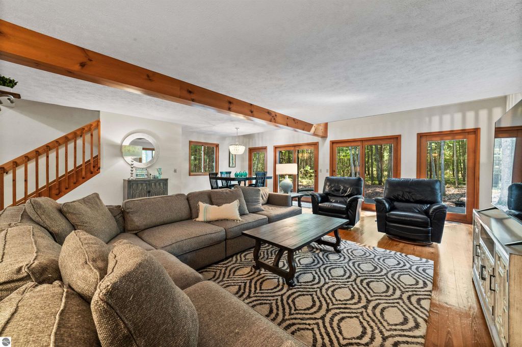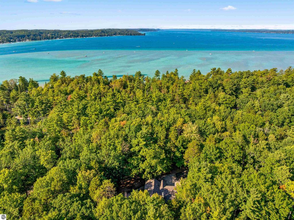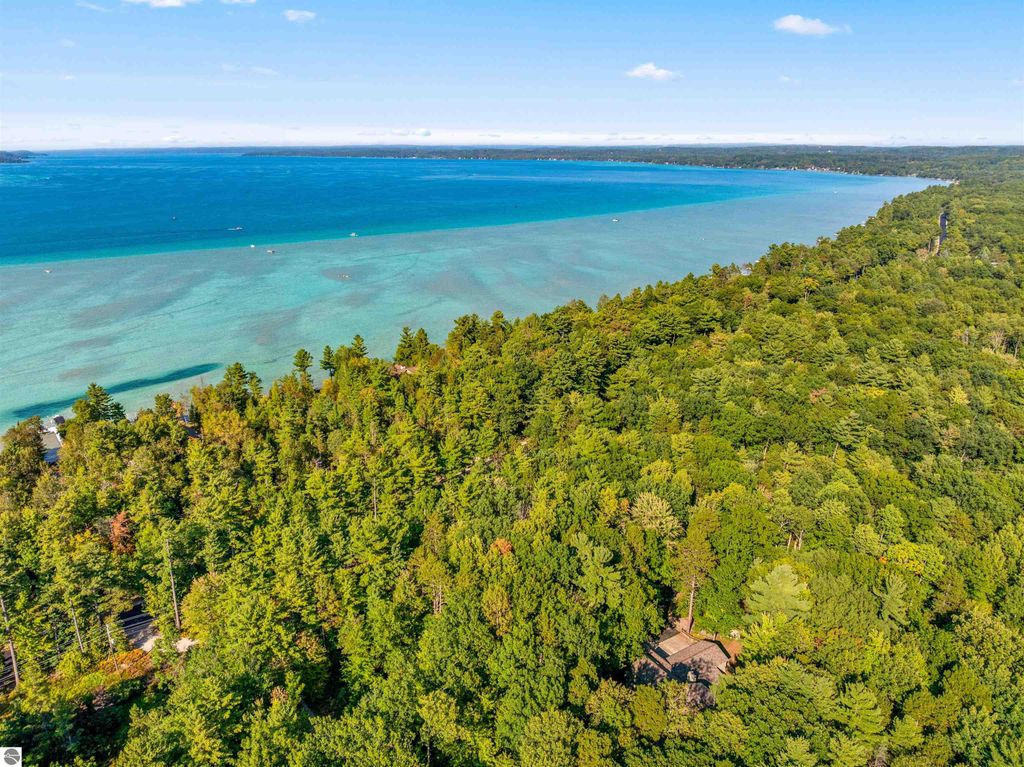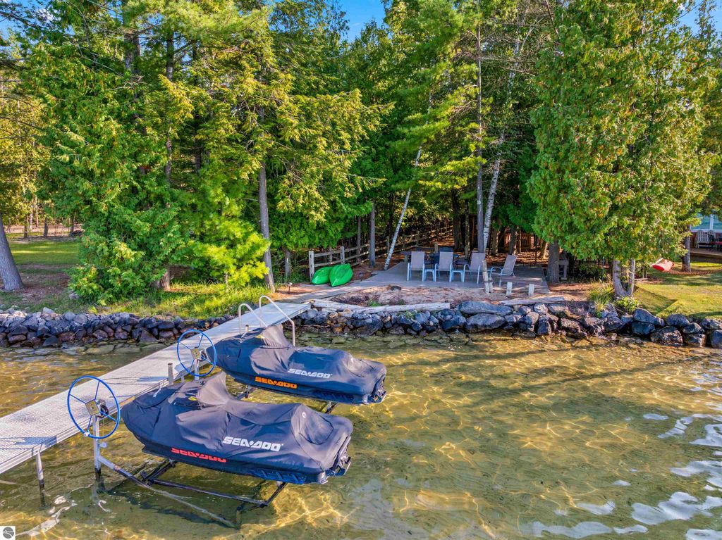 TORCH LAKE PRIVATE WATERFRONT! This stunning, spacious home featuring an oversized family room with a beautiful stone fireplace, perfect for cozy evenings or entertaining. The main master suite offers a window seat, walk-in closet, and a private bath with a jetted tub and separate shower. Upstairs, a guest suite includes its own private bath and walk-in closet. The unique floor plan also features two loft areas ideal for games or additional entertaining space. Nestled on just under four wooded acres, enjoy abundant wildlife right from your backyard. Take your golf cart across Crystal Springs to your private 30 feet of frontage on Torch Lake, complete with an Amish gazebo on the lake side for relaxing in style. This 3,554 sq. ft. home includes four bedrooms, three full bathrooms, a three-car attached garage. The roof was new in 2022, and the property is offered turnkey with furniture and dock"”everything you need to start enjoying Torch Lake living immediately. This home perfectly blends privacy, luxury, and lakefront enjoyment, making it ideal for entertaining while providing a peaceful retreat in the woods.