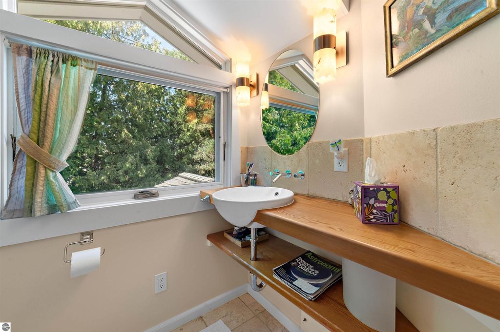 A waterfront sanctuary like no other!!! Suttons Bay 5-acre estate with 102' of sandy-bottom frontage. The 3-4BR/2BA ( note 4th is used as an office non conforming due to no closet) - main home was renovated for timeless comfort with maple floors, slate foyer, granite kitchen, and a main-floor suite with spa bath featuring Japanese soaking tub. Upstairs, the bedroom ensuite offers a sitting area and desk with bay views. Both the main home and carriage house showcase board-and-batten siding and sustainable shake-style roofs crafted from recycled tires, good for 100 years! The carriage house guest quarters feature a warm and inviting place for guests with hemlock wood repurposed from Suttons Bay's historic St. Michaels School, and a wood-burning fireplace. Additional structures include a stunning studio with half bath, a yoga platform adorned with St. Micheals cupola, a barn, and fenced dog park. Certified bird sanctuary with native plantings and waterscape. Walk or bike to Suttons Bay village, or simply stay home"”an invitation to decompress, reconnect, and embrace relaxed Suttons Bay elegance. A one of a kind you may be looking for with the rare combination for privacy and waterfront. A true rare find and hardly ever offered all in one!