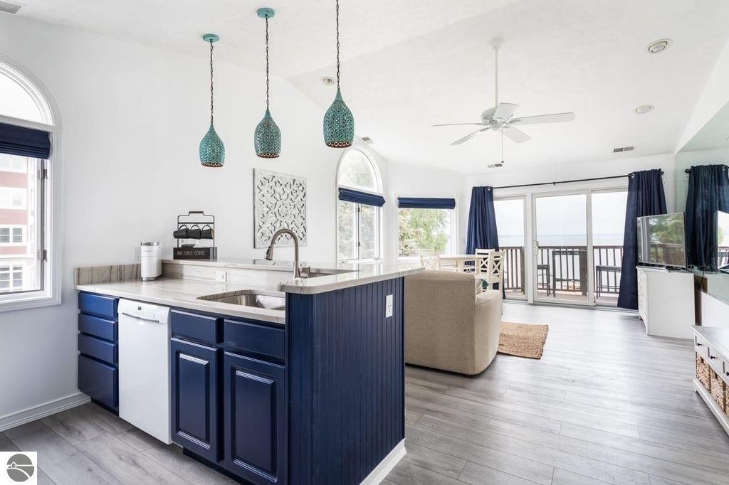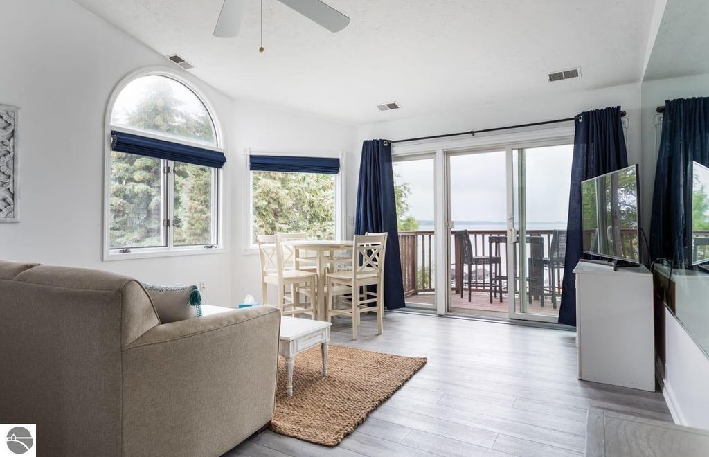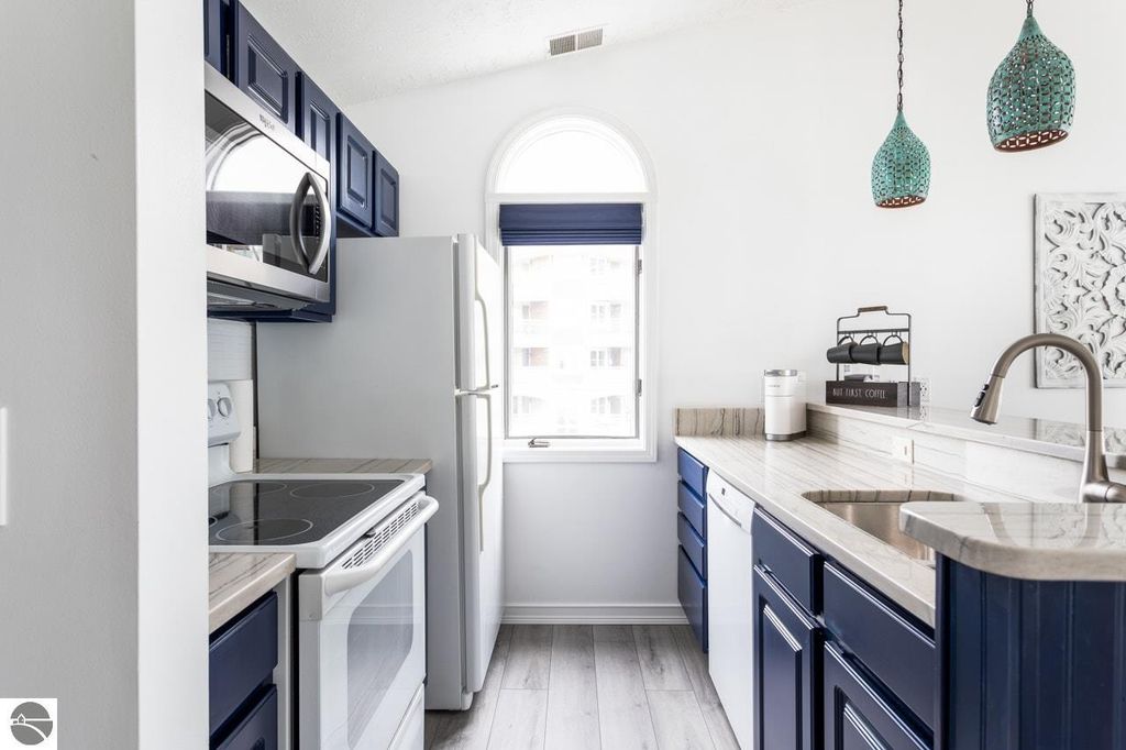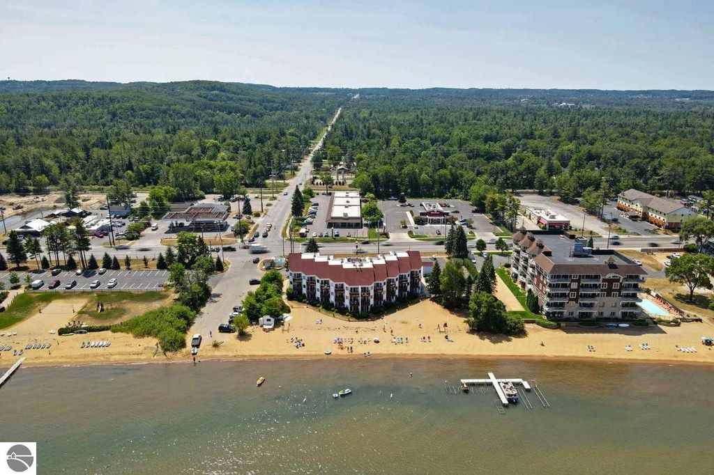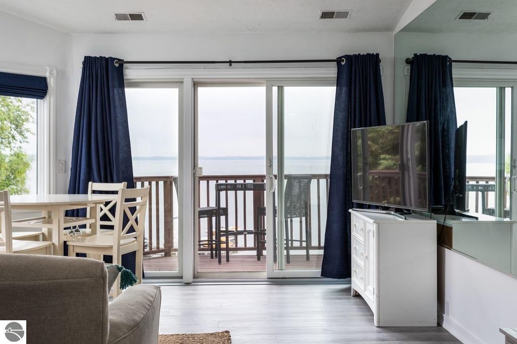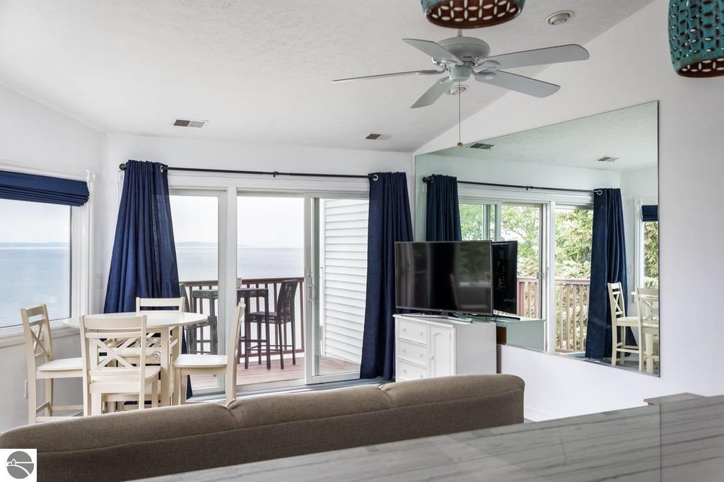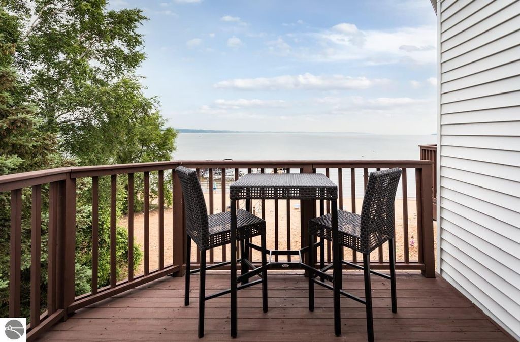 This fully furnished, beautiful beachfront condo at The Beach Condominiums is truly turn-key and ready for you to enjoy! Perfectly situated on the coveted shores of East Bay, this 3rd floor end unit offers the best sandy beaches in the Traverse City area and is directly adjacent to a convenient boat ramp"”ideal for water enthusiasts. With a proven history of great investment income, this condo is not only a relaxing retreat, but also a smart investment. Enjoy amazing views of the bay from your private balcony and take advantage of exclusive amenities including a private sandy beach, heated pool, hot tub, and elevator for easy access. This end unit boasts more quiet and privacy than others, featuring vaulted ceilings and extra half-moon windows that flood the space with natural light. The master suite includes a beautiful private bay window. Completely renovated from floors to ceiling in 2021, the condo features an updated bathroom with a large walk-in marble tile shower, a private water closet, and a brand new washer and dryer (2024) with a transferable extended warranty. Attention to detail is evident throughout: USB outlets are installed for modern convenience, unique lighting adds character, and blackout designer cloth blinds and curtains ensure restful nights. The kitchen is a chef's delight with updated appliances, granite countertops, a stylish tile backsplash, and a brand new stainless steel refrigerator being installed on October 5th! Located just 5 miles from downtown Traverse City, you'll have quick access to top-rated dining, shopping, and entertainment. Nearby businesses include Hopscotch Brick Oven & Taproom, Osorio Tacos y Salsas, and Grand Traverse Resort and Spa. This gorgeously decorated property won't last long! Don't miss your chance to own this exceptional slice of paradise in Traverse City's premier beachfront community"”where every day feels like a vacation!