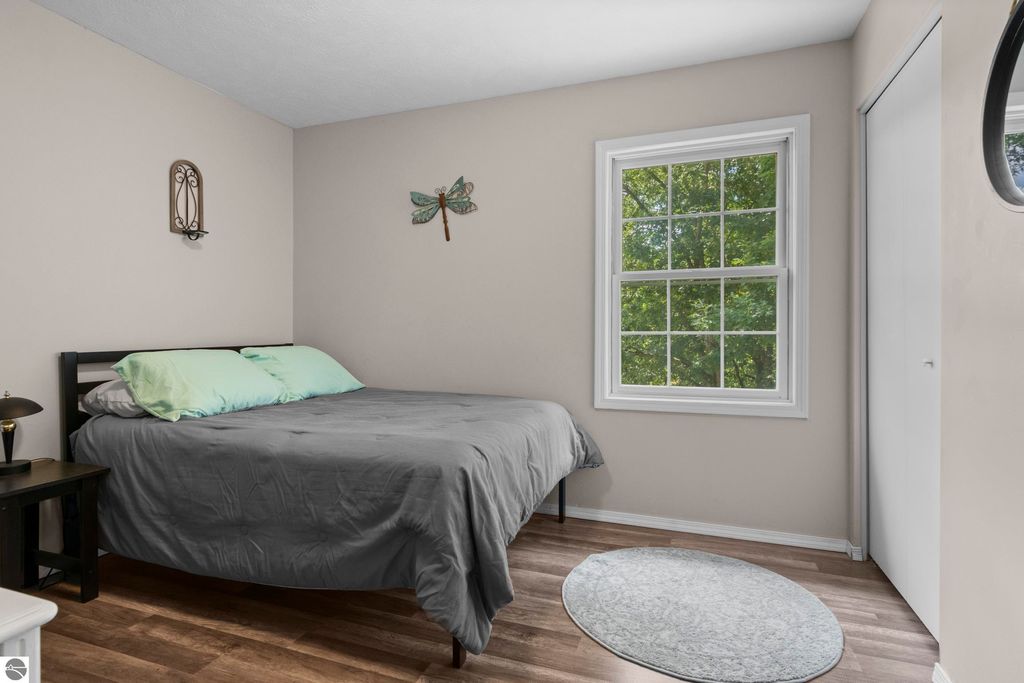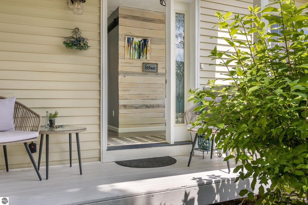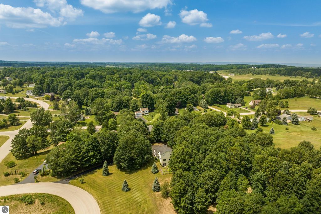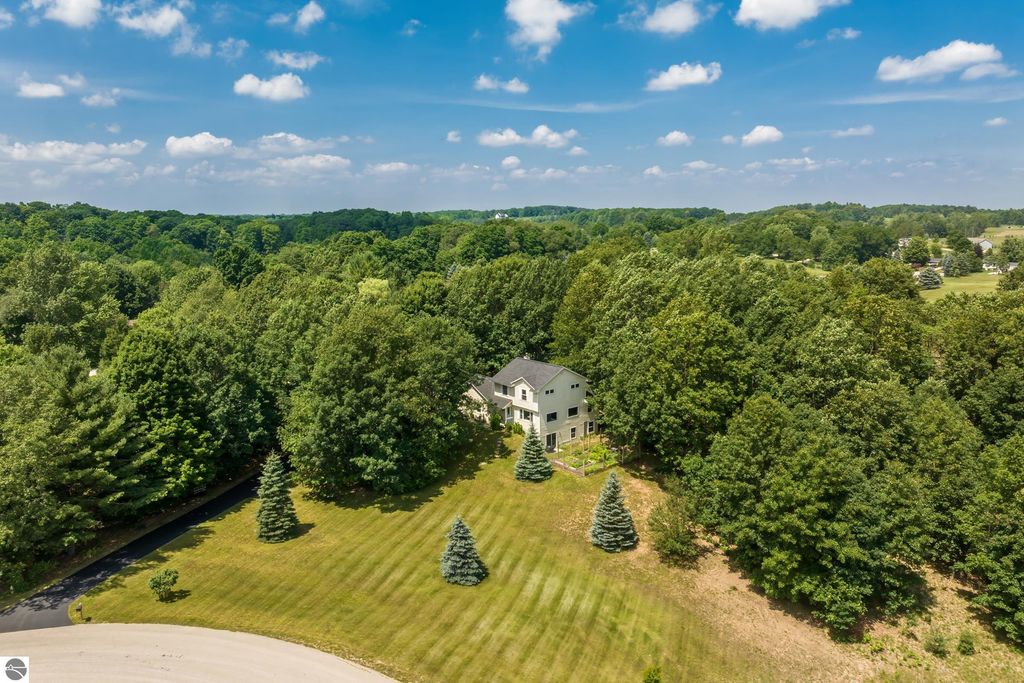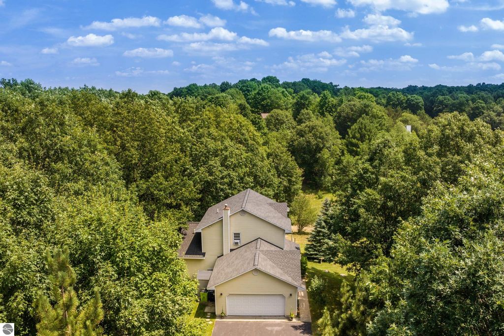 Stunning park-like setting for this fully updated 4 bedroom 2.5 bath home set on over an acre on a cul-de-sac. Updates include new roof 2024, full remodel in 2019 with new furnace, hot water heater, appliances & sliding glass doors and nearly all windows. Charming covered entry opens into a spacious living room with country side views out of all windows and flows beautifully into the dining and kitchen. Deck on the rear of the home overlooks the woods and is perfect for bbq'ing. Kitchen is fresh and clean with white cabinets, subway tile backsplash, stainless steel appliances and granite counter tops. A cooks delight! The darling powder room is tucked in under the stairs. Upstairs there are three bedrooms and a large bathroom. The lower level is a walkout with great light, the family room is currently used as workout space could also be a great place for movie night & game nights. There is addition bedroom and office as well as the laundry room and a full bath. Step outside and enjoy the garden area, fenced to keep the wildlife out of the veggies. There is an attached 2 car garage and a shed which has a full workshop. This home is an eastside gem, close to lakes, the VASA trail, the Boardman River, and just a few miles to downtown Traverse City.