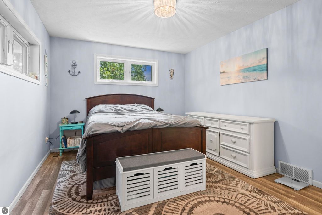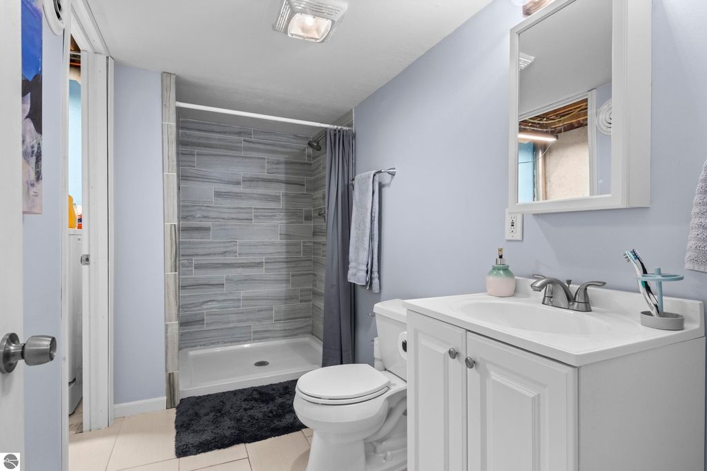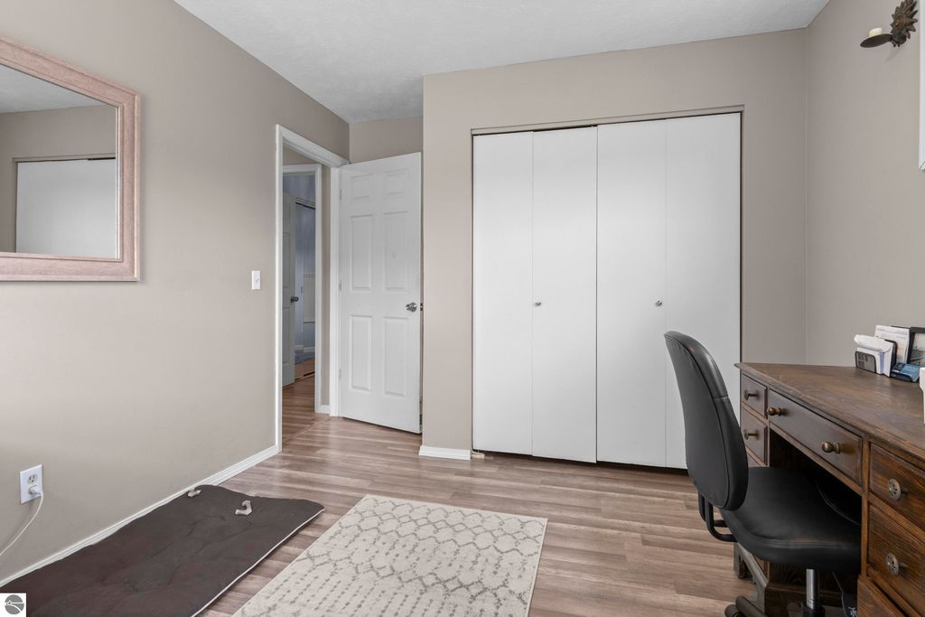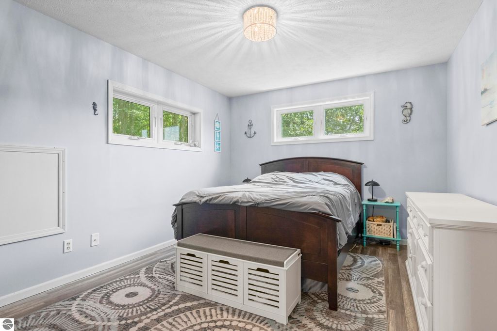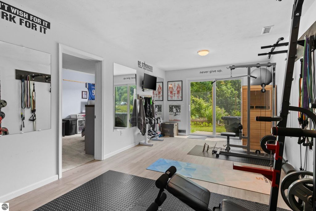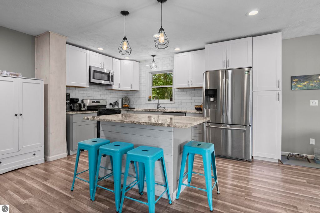 Stunning park-like setting for this fully updated 4 bedroom 2.5 bath home set on over an acre on a cul-de-sac. Updates include new roof 2024, full remodel in 2019 with new furnace, hot water heater, appliances & sliding glass doors and nearly all windows. Charming covered entry opens into a spacious living room with country side views out of all windows and flows beautifully into the dining and kitchen. Deck on the rear of the home overlooks the woods and is perfect for bbq'ing. Kitchen is fresh and clean with white cabinets, subway tile backsplash, stainless steel appliances and granite counter tops. A cooks delight! The darling powder room is tucked in under the stairs. Upstairs there are three bedrooms and a large bathroom. The lower level is a walkout with great light, the family room is currently used as workout space could also be a great place for movie night & game nights. There is addition bedroom and office as well as the laundry room and a full bath. Step outside and enjoy the garden area, fenced to keep the wildlife out of the veggies. There is an attached 2 car garage and a shed which has a full workshop. This home is an eastside gem, close to lakes, the VASA trail, the Boardman River, and just a few miles to downtown Traverse City.