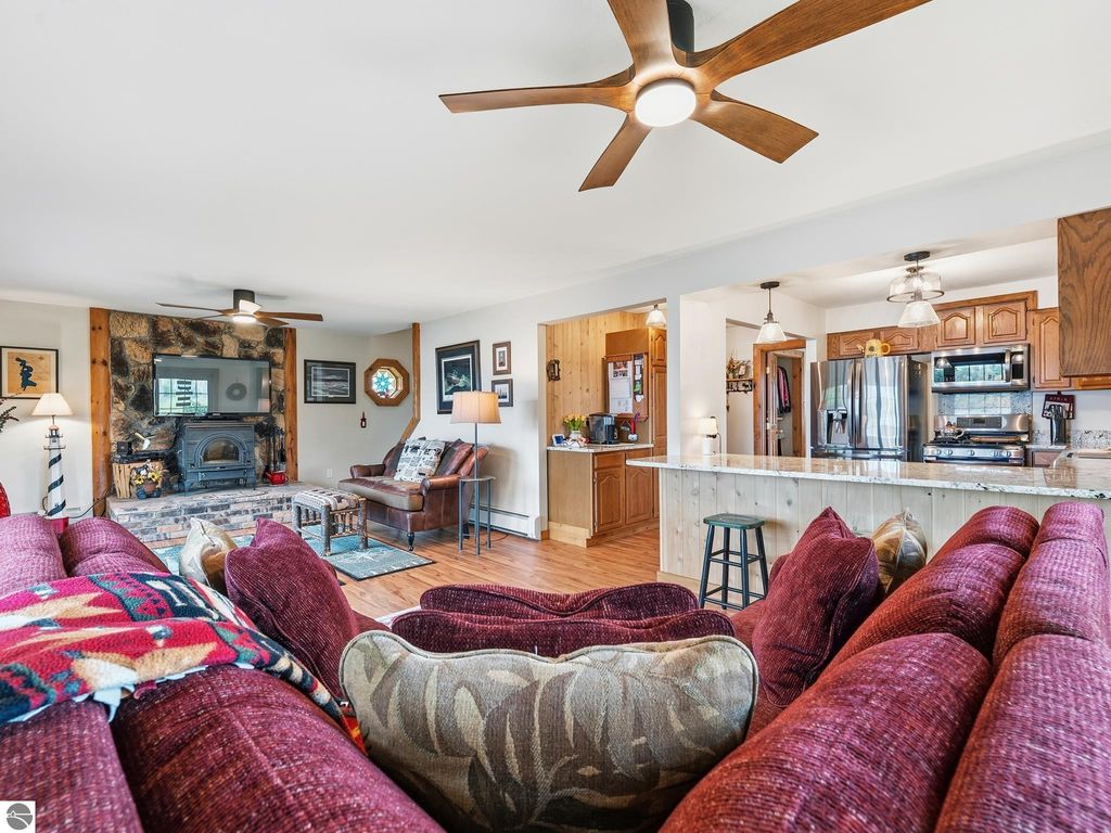 Ocqueoc Lakefront Retreat Discover the perfect blend of comfort, beauty, and recreation at this stunning lakefront home nestled on the quiet shores of Ocqueoc Lake. Enjoy direct water access with a meticulously manicured lawn leading right to the lake's edge, offering a peaceful and picturesque setting for relaxation or play. The Ocqueoc River runs alongside this immaculately maintained residence, further enhancing the natural surroundings, while the expansive State land across the river provides additional space for outdoor adventure and privacy. Step inside to a thoughtfully designed, flowing floor plan filled with natural light and panoramic views from windows at every turn. The inviting great room features a wood-fired stove, elegant flooring, and stately ceiling fans, all seamlessly opening up to a spacious deck. Nature lovers will appreciate the abundant wildlife that frequents the area and the 130-acre lake that reaches depths of up to 35 feet, offering unparalleled fishing opportunities. Situated on .46 acres at the end of a county-maintained drive, this retreat offers both privacy and convenience. The Artesian well ensures a reliable water source, and two sheds provide ample space for tools, gear, and storage. And your own private dock. The second-floor bedrooms feature finished knee-walls for additional storage, while charming dormers add character to this exceptional home. Recent updates include new flooring, furnace, iron filter with ultraviolet light, modern appliances, and more"”giving the home a fresh feel without sacrificing its timeless charm. Schedule your visit today and experience lakeside living at its finest!