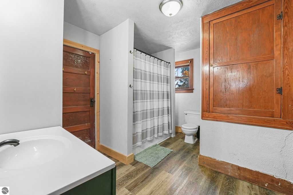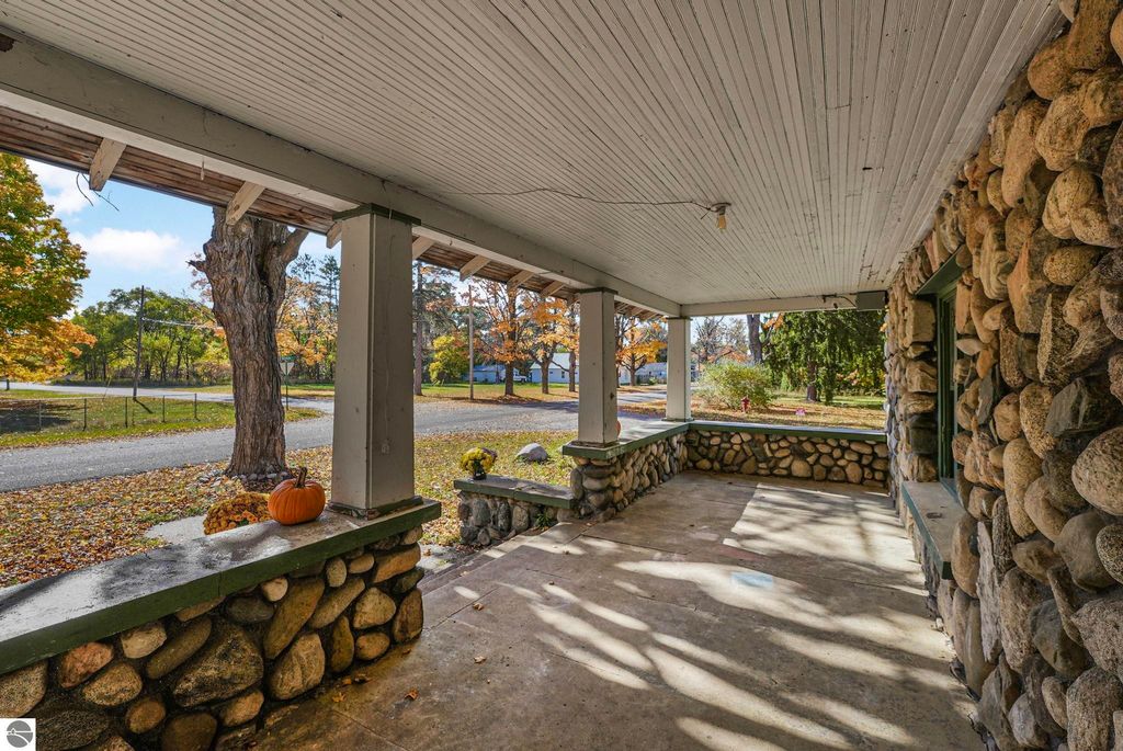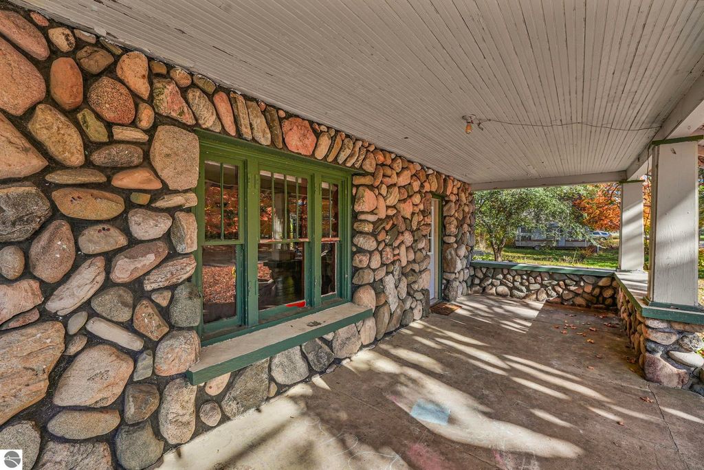 Steeped in 1930s charm but thoroughly updated for modern living in 2022, this unique stone house on a desirable corner lot is an absolute steal in the Village of Mancelona. You'll be captivated by the striking exterior, the beautiful steel roof, and the cozy allure of the interior's original stone fireplace and gleaming hardwood floors. Offering generous living space with five bedrooms and 1.5 baths, the home features a separate dining room with bonus space, a kitchen recently upgraded with newer cabinets, and a large front porch perfect for enjoying fresh air, rain or shine. All essential appliances are included. Don't miss this rare opportunity to own a piece of history with modern peace of mind!