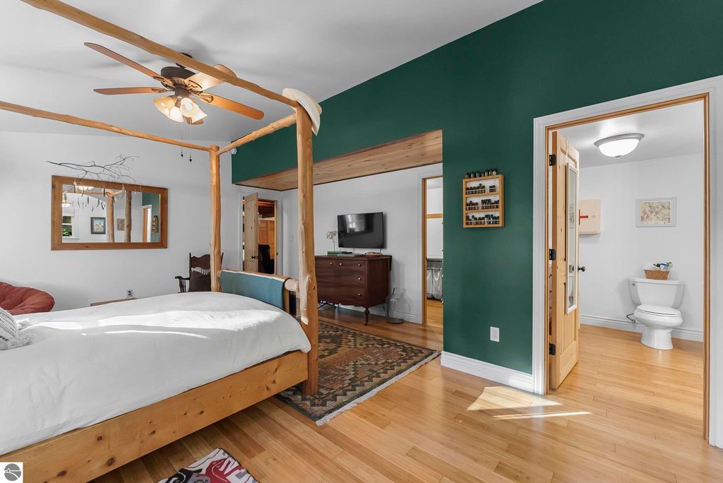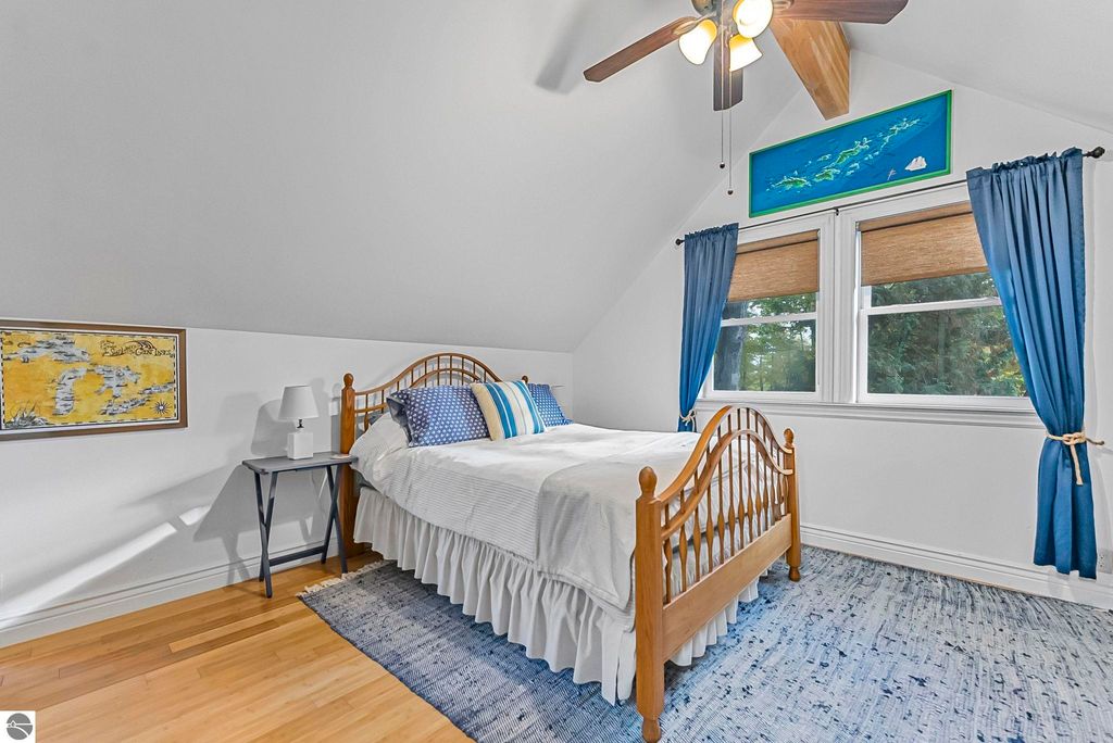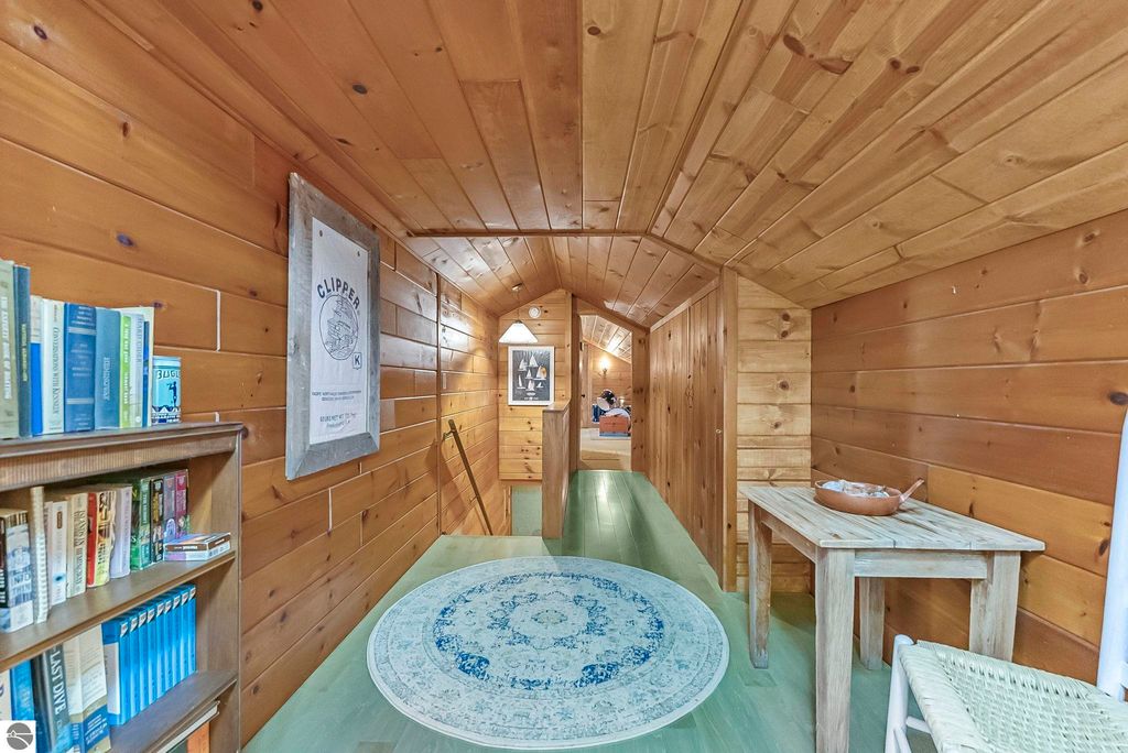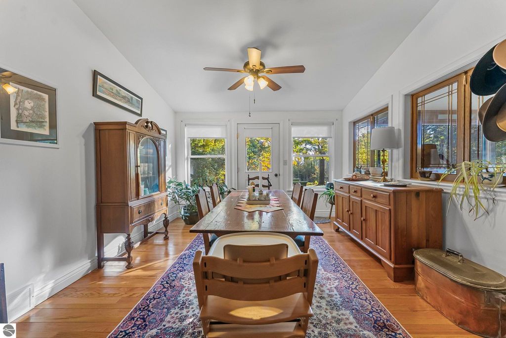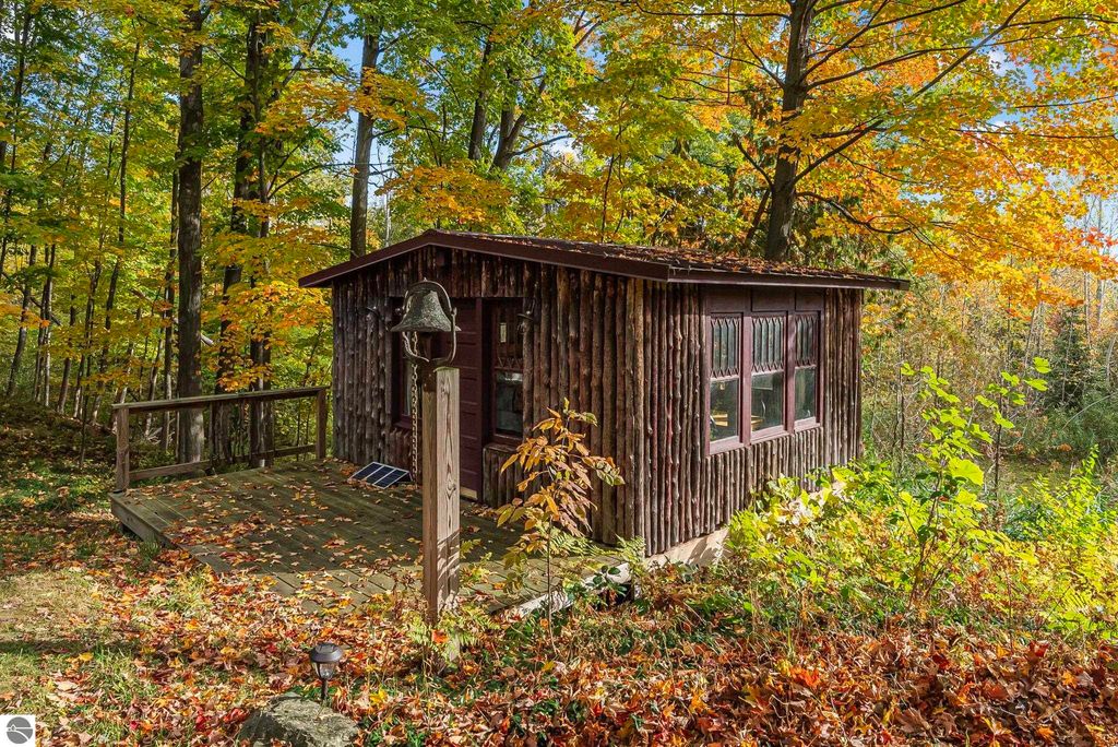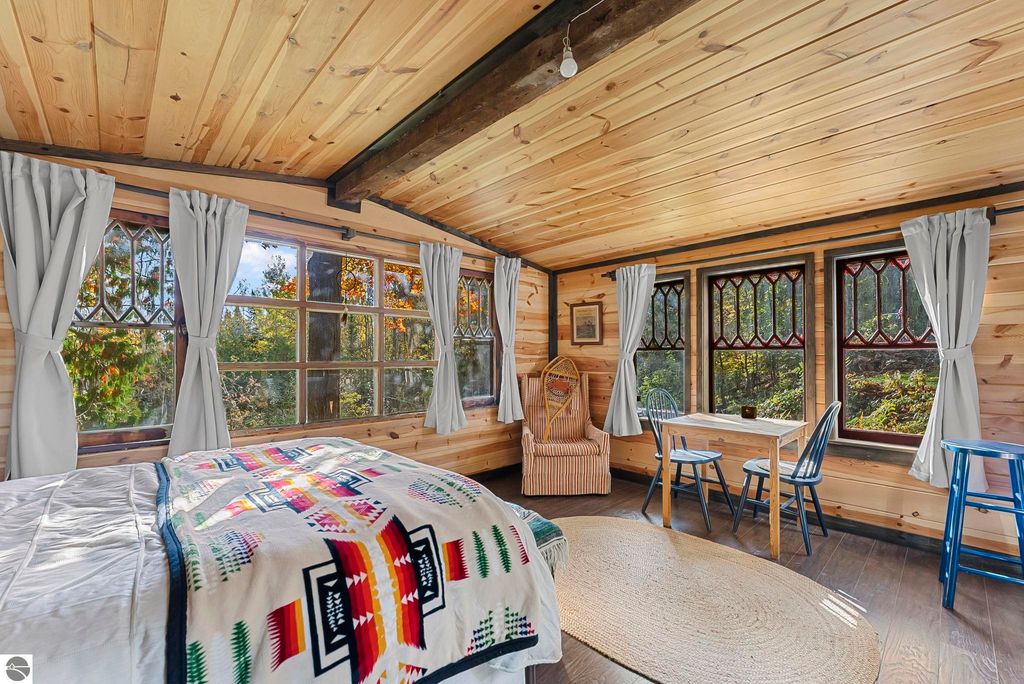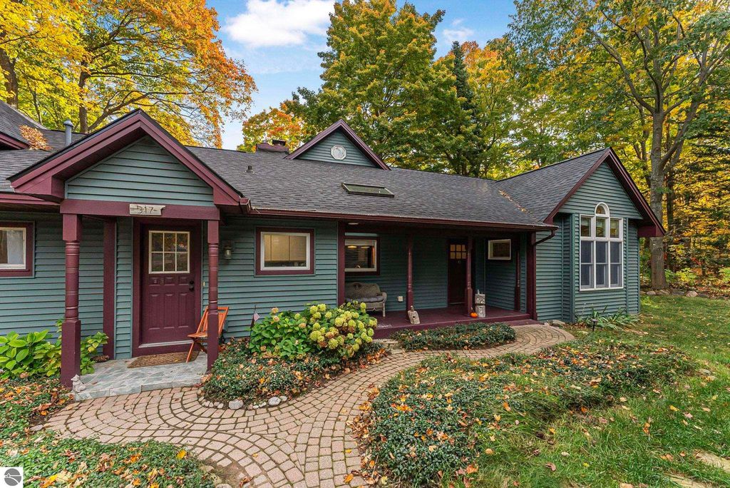One of Northport's true hidden gems. Village conveniences are just moments away"”walk or golf cart to beaches, grocery, the farmers market, boutiques, live music, and dining"”yet this 1.5-acre property feels worlds apart. Enjoy beautiful Grand Traverse Bay views (tree management under your control, enhancing your year-round views) and rare access to South Shore Drive, all while tucked away from road noise and activity. Designed for main-level living, the home features two ensuite bedrooms, two living areas, a vaulted great room with gas fireplace, and a bright sunroom off the dining area with brick fireplace, exposed beams, and oak floors. Character is not missed here"”you'll find wood-accented ceilings and floors, stunning closets with charming porthole details, unique rooflines, and oversized storage spaces that make this home both functional and full of personality. An oversized garage framed for expansion, matching garden building, and authentic log cabin add flexibility and charm. The cabin offers space for guests, an artist's retreat, or creative hideaway. Custom woodworking and vintage details throughout both the home and cabin make this a standout Northport property, blending village convenience with timeless Up North appeal.