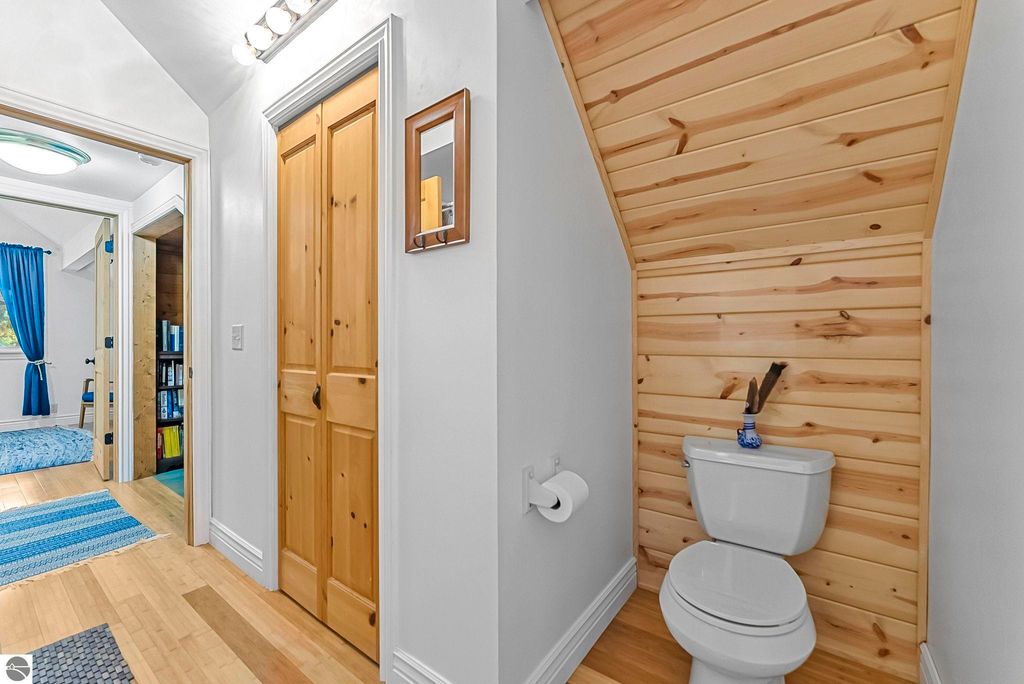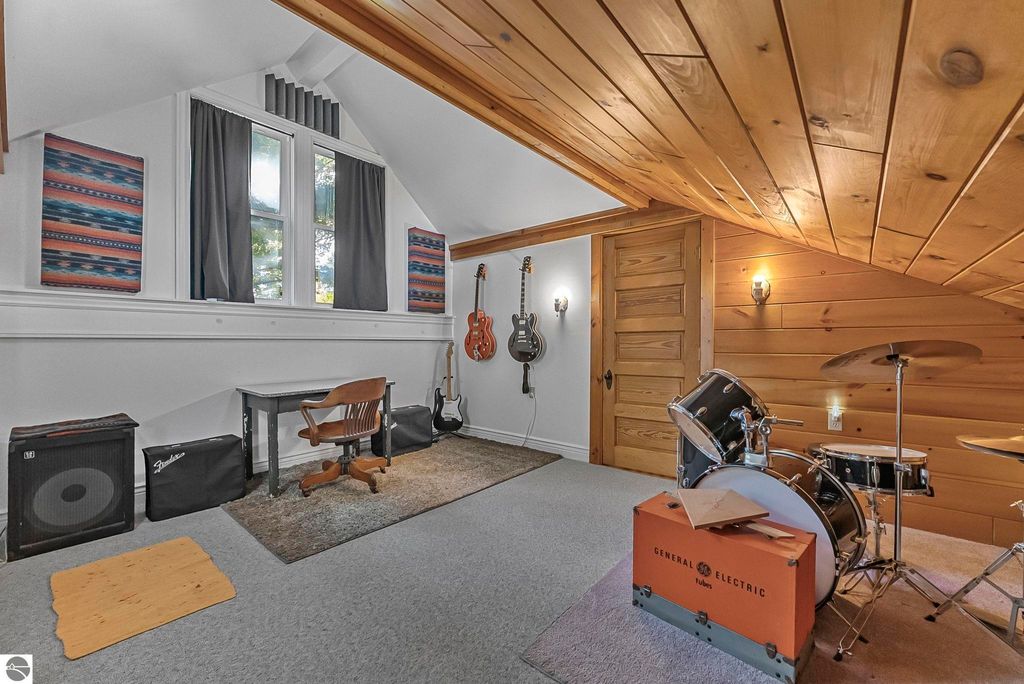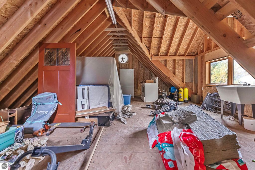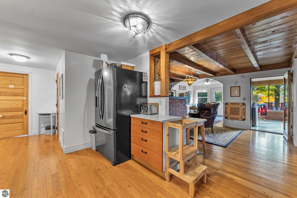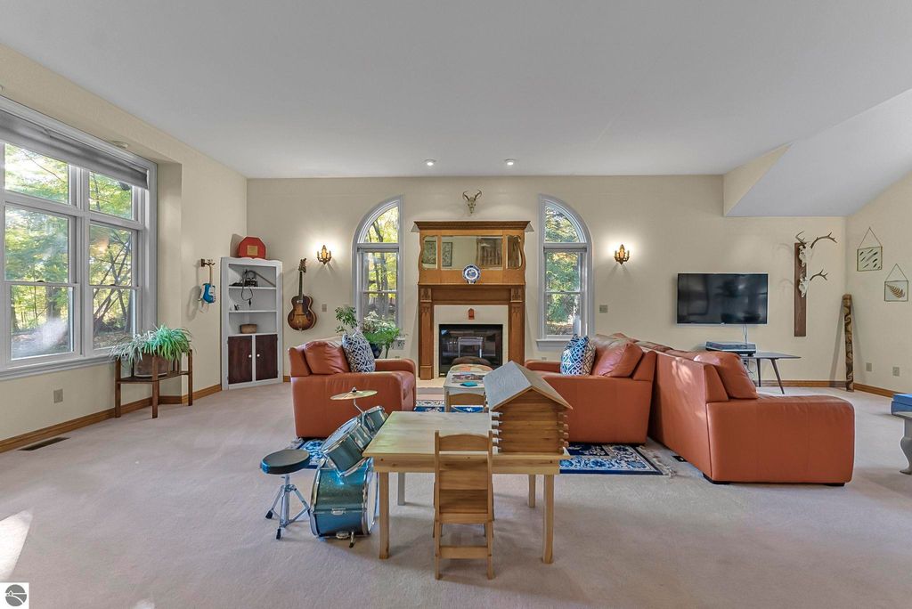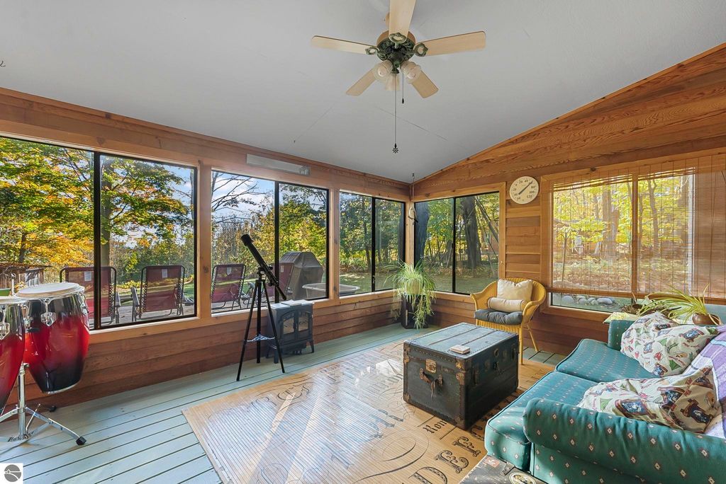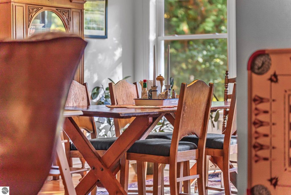 One of Northport's true hidden gems. Village conveniences are just moments away"”walk or golf cart to beaches, grocery, the farmers market, boutiques, live music, and dining"”yet this 1.5-acre property feels worlds apart. Enjoy beautiful Grand Traverse Bay views (tree management under your control, enhancing your year-round views) and rare access to South Shore Drive, all while tucked away from road noise and activity. Designed for main-level living, the home features two ensuite bedrooms, two living areas, a vaulted great room with gas fireplace, and a bright sunroom off the dining area with brick fireplace, exposed beams, and oak floors. Character is not missed here"”you'll find wood-accented ceilings and floors, stunning closets with charming porthole details, unique rooflines, and oversized storage spaces that make this home both functional and full of personality. An oversized garage framed for expansion, matching garden building, and authentic log cabin add flexibility and charm. The cabin offers space for guests, an artist's retreat, or creative hideaway. Custom woodworking and vintage details throughout both the home and cabin make this a standout Northport property, blending village convenience with timeless Up North appeal.