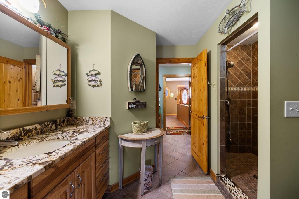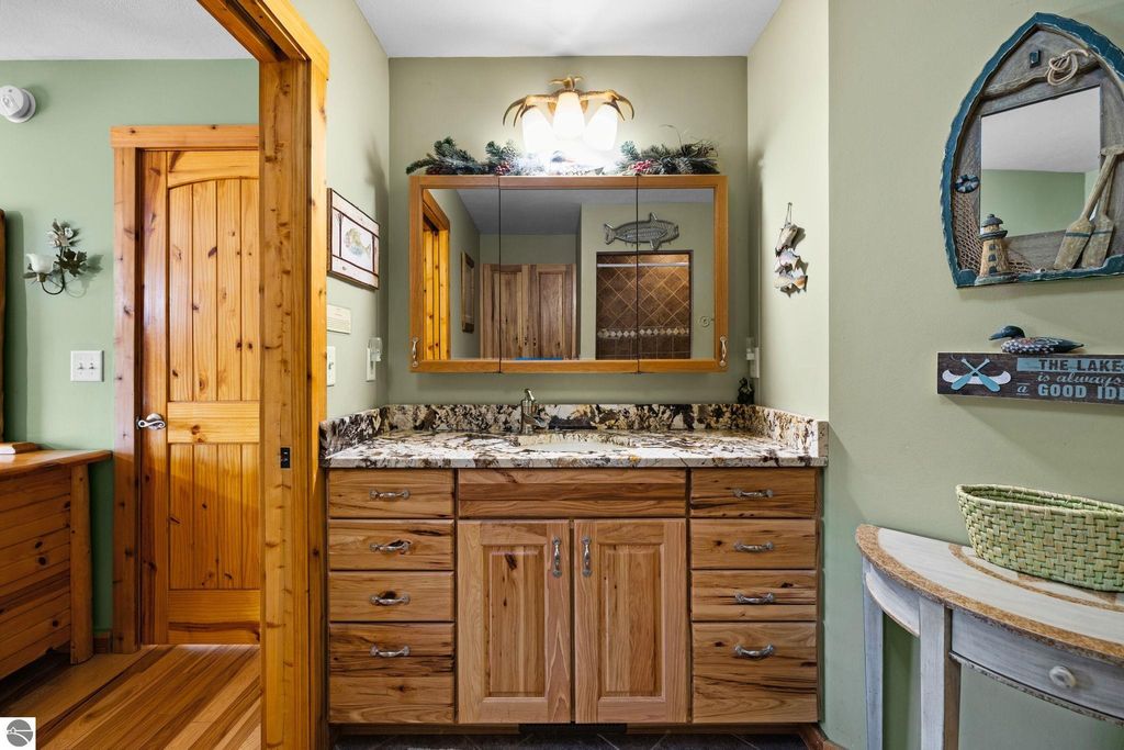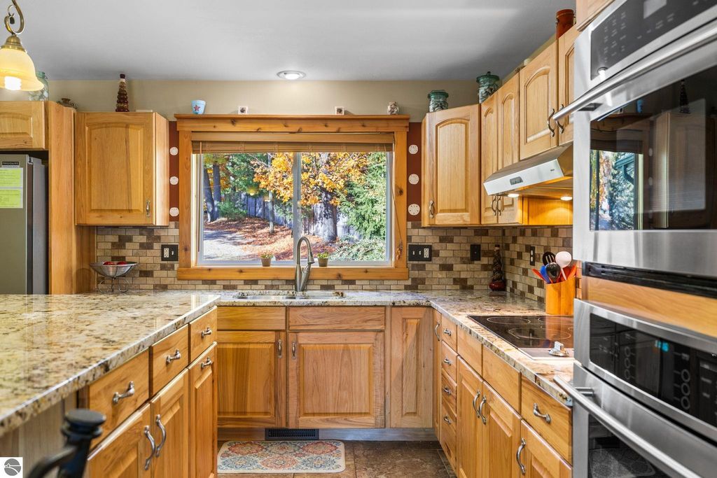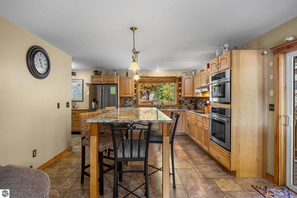 Where lake days linger and memories come easy - this handcrafted family lodge on High Lake offers 100 feet of sandy shoreline and room for everyone to unwind. Designed with flexibility and connection in mind, the main level features two independent living spaces, each with its own well-appointed kitchen, living area, bedroom, and bath. Custom tilework, solid wood doors, granite countertops, and fine cabinetry reflect quality craftsmanship throughout. The walkout lower level adds even more room to gather, with a spacious family area, additional kitchen, and full bath - ideal for hosting extended family and friends. Outside, two private docks and a soft-sand beach invite endless days on the water, while a detached two-car garage provides plenty of space for boats, snowmobiles, and all your Up North toys. Just minutes from downtown Traverse City and walkable to Peegeo's, this property is surrounded by thousands of acres of state land for snowmobiling, hunting, and trail riding. High Lake Family Lodge blends laid-back lakeside living with four seasons of Northern Michigan adventure.