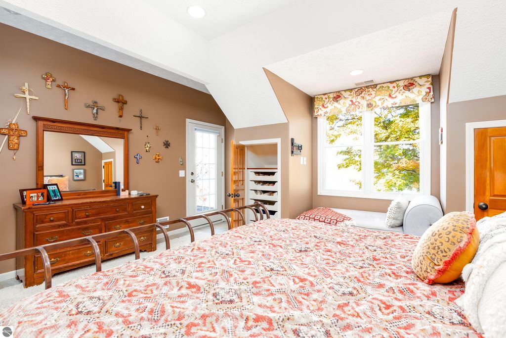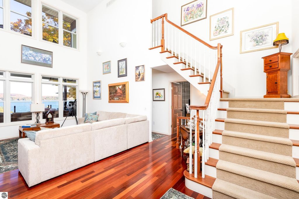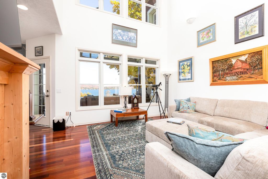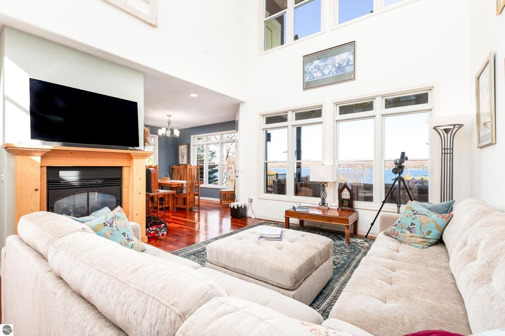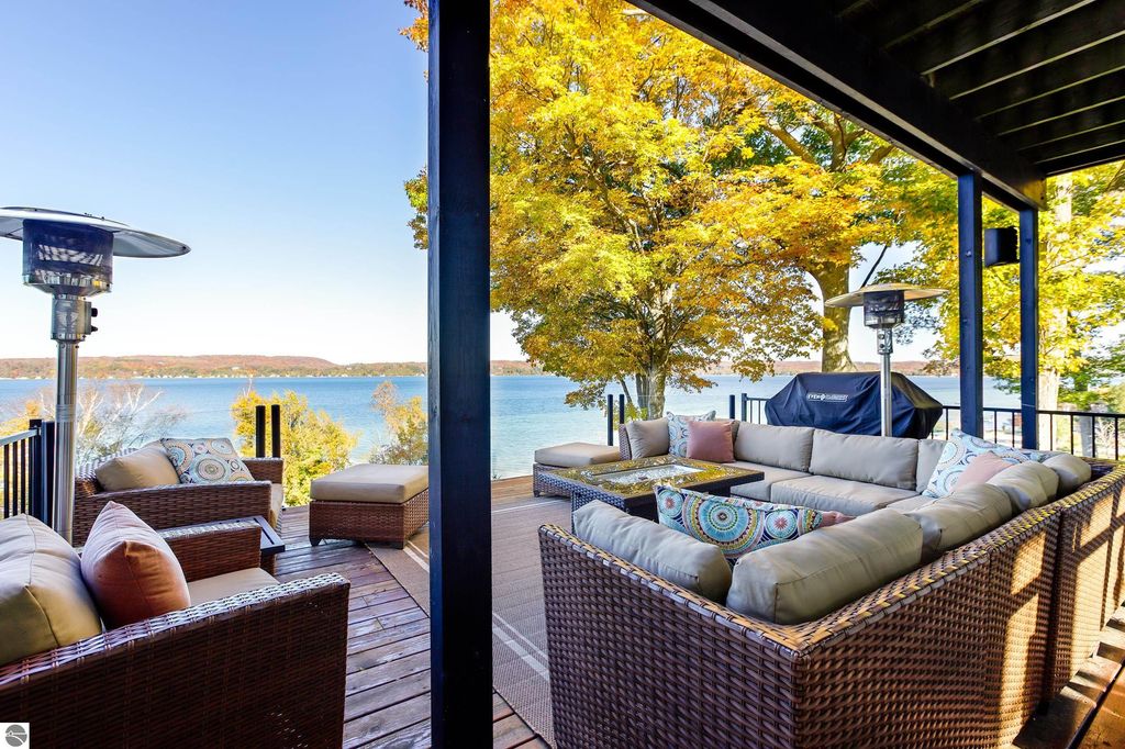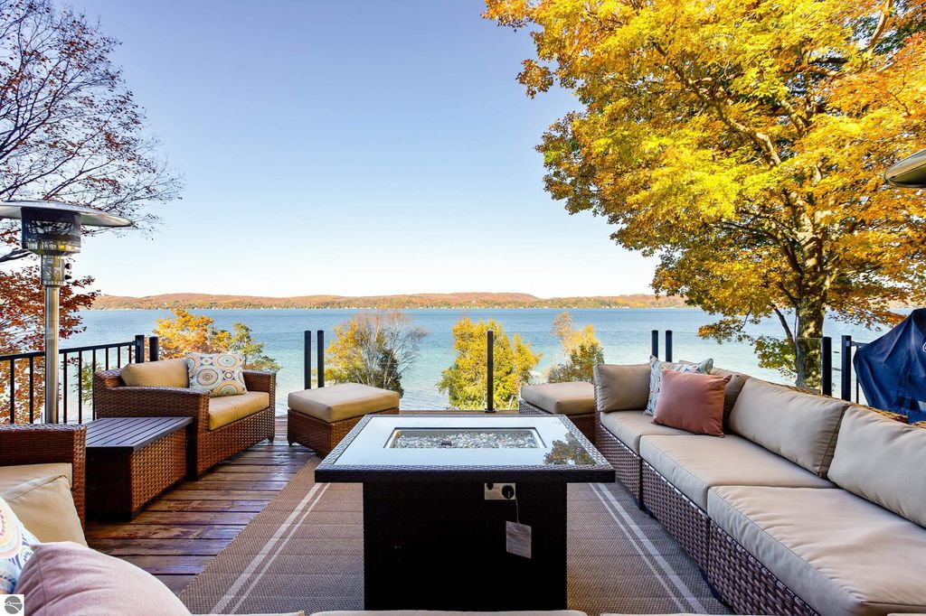 Experience the best of Crystal Lake living with this beautifully designed and updated waterfront home, nestled on nearly an acre with 100 feet of pristine, sandy, private lake frontage. Located on a peaceful stretch of the lake's south shore, this property offers serenity and privacy yet it's just a pleasant stroll or bike ride down the Betsie Valley Trail leading you to the charming Village of Beulah. A short drive or bike ride to the City of Frankfort and access to stunning Lake Michigan beaches. Step inside to discover three levels of panoramic lake views from this 5-bedroom, 3-bath home. The upper-level master suite is a true retreat, featuring a soaking tub, walk-in closet, and private deck. The light-filled main floor boasts vaulted ceilings, cherry-wood floors, and expansive lake-view windows that open onto raised decks with glass rails, ensuring unobstructed views of the sparkling water. A gas fireplace anchors the inviting living area, while kitchen delights with sustainable cork flooring, stainless appliances, custom cabinetry, a generous island, and a walk-in pantry. The newly updated finished lower level offers space for relaxation and entertaining, complete with a wet bar with hickory cabinetry, two bedrooms, a full bath and a walkout patio overlooking the lake. Outdoors, the property is professionally landscaped and irrigated, featuring two patios, a firepit, and your very own Tiki Hut complete with 240 electrical service, internet, wireless TV and speaker system creating the ultimate lakeside entertaining space. Many electrical improvements include a whole house generator, patio and deck spaces all zoned for speaker systems and home communication system is centrally wired. With nearby golf courses, ski resorts, and bike trails promise year-round recreation. Whether you're seeking a year-round residence or a four-season retreat, this Crystal Lake gem captures the essence of Northern Michigan lakefront living"”elegant, comfortable, and perfectly located.