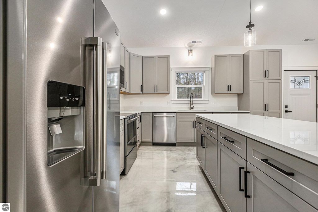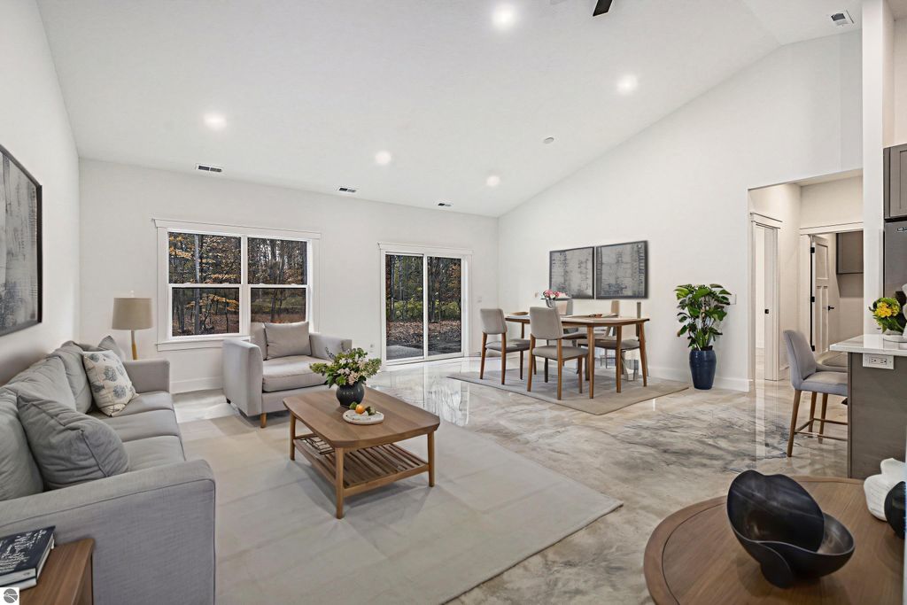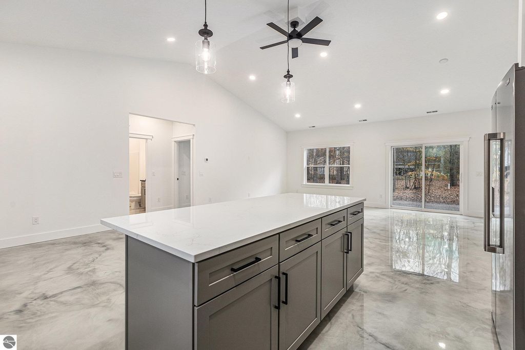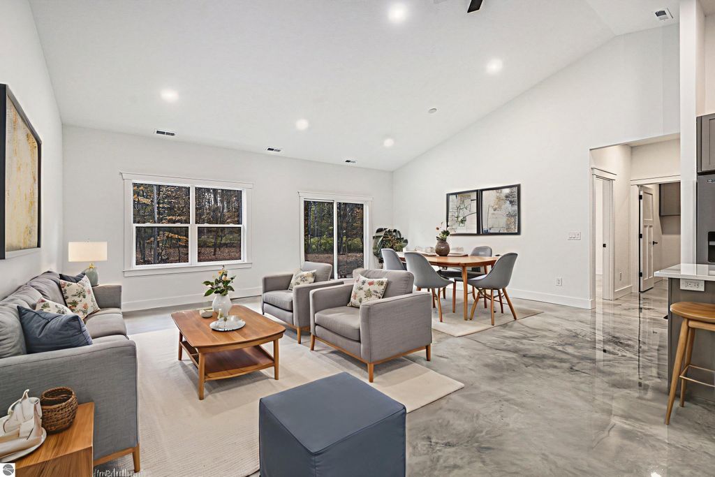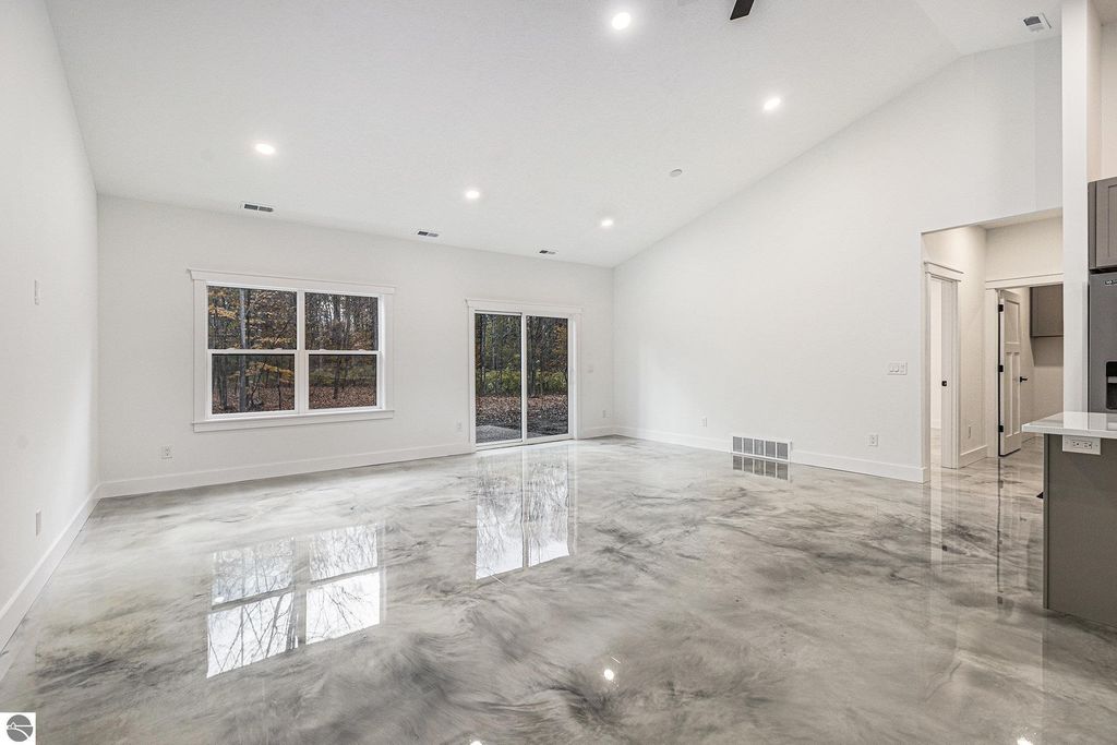 Built in 2025, this custom main-floor living home sits on a private lot in the Crimson King Subdivision between Lake Ann and Interlochen. Designed for comfort and efficiency, it features radiant in-floor heat, thermal mass construction, an ultra-efficient natural gas boiler, and forced-air A/C. The heated slab is finished with durable metallic epoxy throughout. The open layout includes a quality-built kitchen with custom soft-close cabinetry, maple dovetail drawers, quartz countertops, and Maytag appliances. Three comfortable bedrooms include a private primary suite, with bathrooms and laundry finished in Granite Steel Rock. A large exposed aggregate patio offers peaceful outdoor living surrounded by mature trees. The oversized garage provides excellent storage and workspace. The subdivision adds to the appeal with a community park, ball field, and trails. Located near Lake Dubonnet State Forest and minutes from golf, skiing, and the amenities of Lake Ann and Interlochen, this home delivers efficiency, quality, and a welcoming community lifestyle.