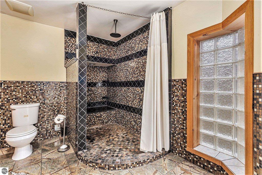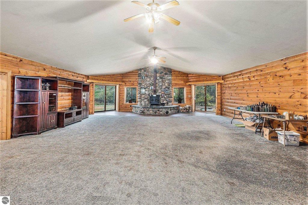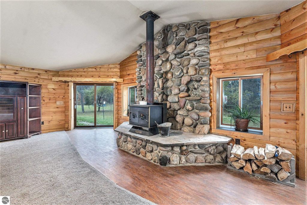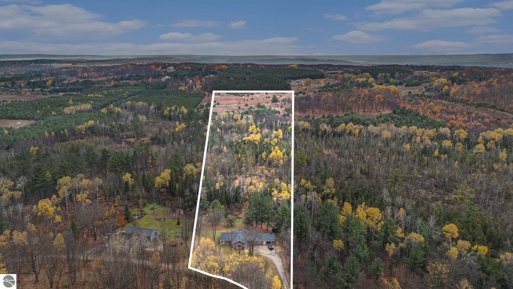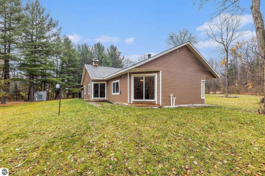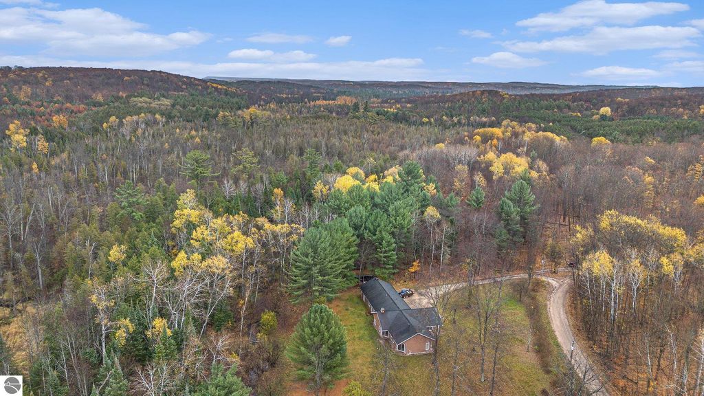 Discover this impressive nearly 3,000 sq. ft. ranch home nestled just minutes from Alden. Set on almost 4 wooded acres with 200 feet of frontage on Spencer Creek, this property offers the perfect blend of privacy and natural beauty. Built in 2006 with insulated concrete form construction, this home is built to last and designed for comfort. The expansive living room features a stunning floor-to-ceiling stone surround and wood-burning stove, ideal for cozy Northern Michigan evenings. The primary suite is a private retreat with a spa-like bath, complete with a multi-head shower and built-in bench. The east wing offers two additional bedrooms, a full bath, two sitting areas, and laundry for added convenience. Additional highlights include wide 4-ft hallways, multiple sliders leading to the serene backyard, and an oversized attached garage with ample storage. Located on a seasonal road, this property offers peaceful seclusion and easy access to all that Torch Lake and Alden have to offer.