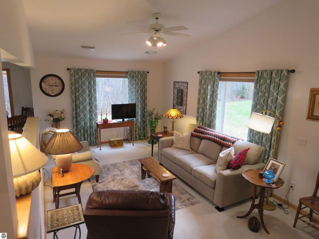 This lovely 3-bedroom 2 bath condo offers a comfortable, low-maintenance lifestyle with fantastic updates and access to Lake Cadillac. This desirable end unit offers exceptional privacy. The property backs up to a wooded area and features an expansive open area on the side, providing a quiet and scenic setting. The home features an open-concept layout complemented by newer cupboards and attractive quartz countertops. You'll find quality touches like solid 6-panel doors, updated light fixtures, and newer paint and some carpeting throughout. All appliances are included, including a microwave that is just two months old. Important recent updates include a new hot water heater and garbage disposal in 2024, and the main floor shower was replaced in 2023. Enjoy the versatile four-season room or relax by the beautiful gas fireplace. The bedrooms offer generous storage with walk-in closets. Living here means a maintenance-free lifestyle"”no more worrying about lawn care or snow removal. Best of all, residents have access to 100 feet of shared frontage on Lake Cadillac, just a short walk away. This condo provides the perfect blend of easy living, privacy, and lakeside enjoyment.