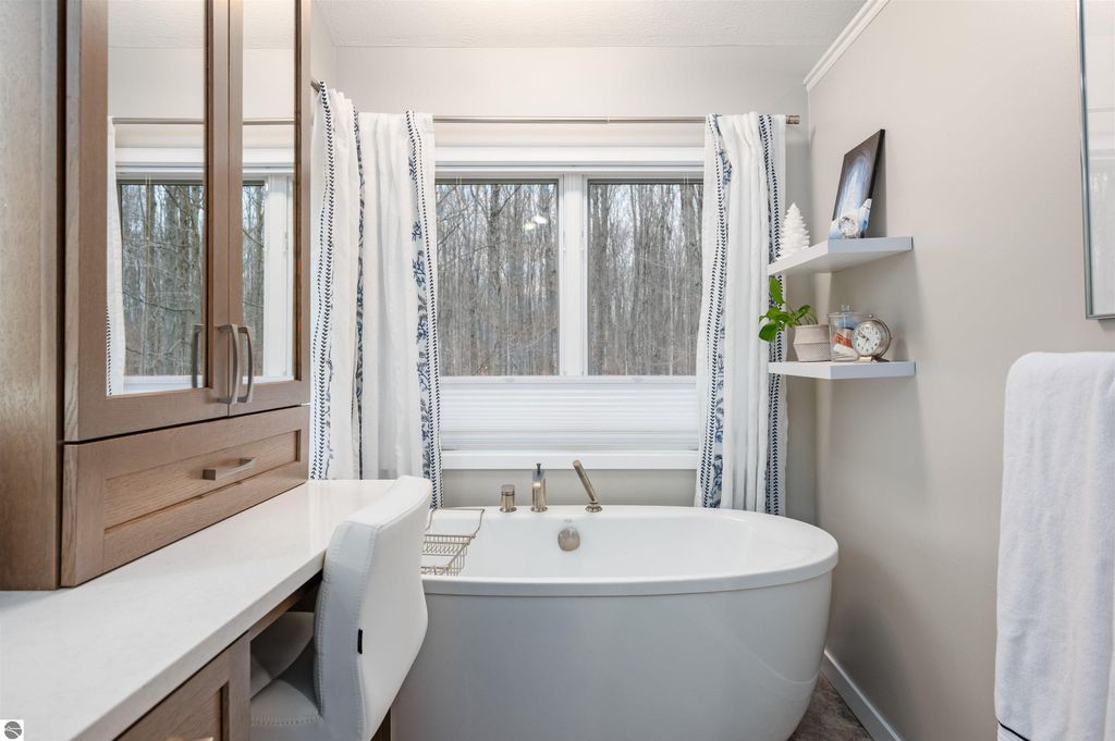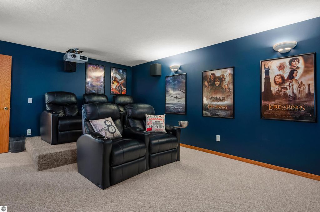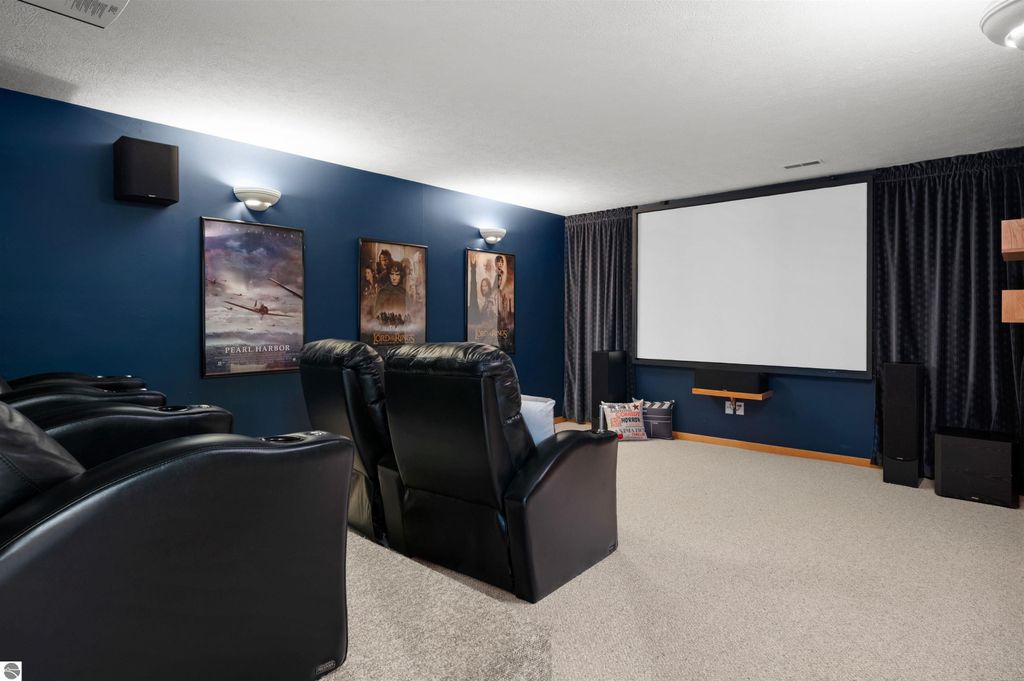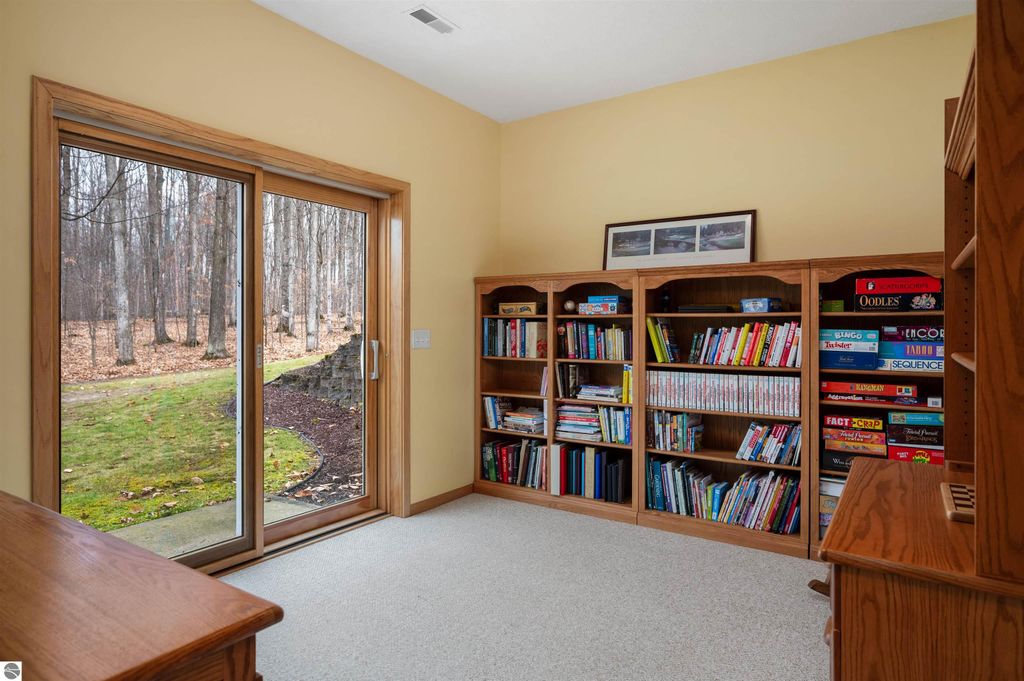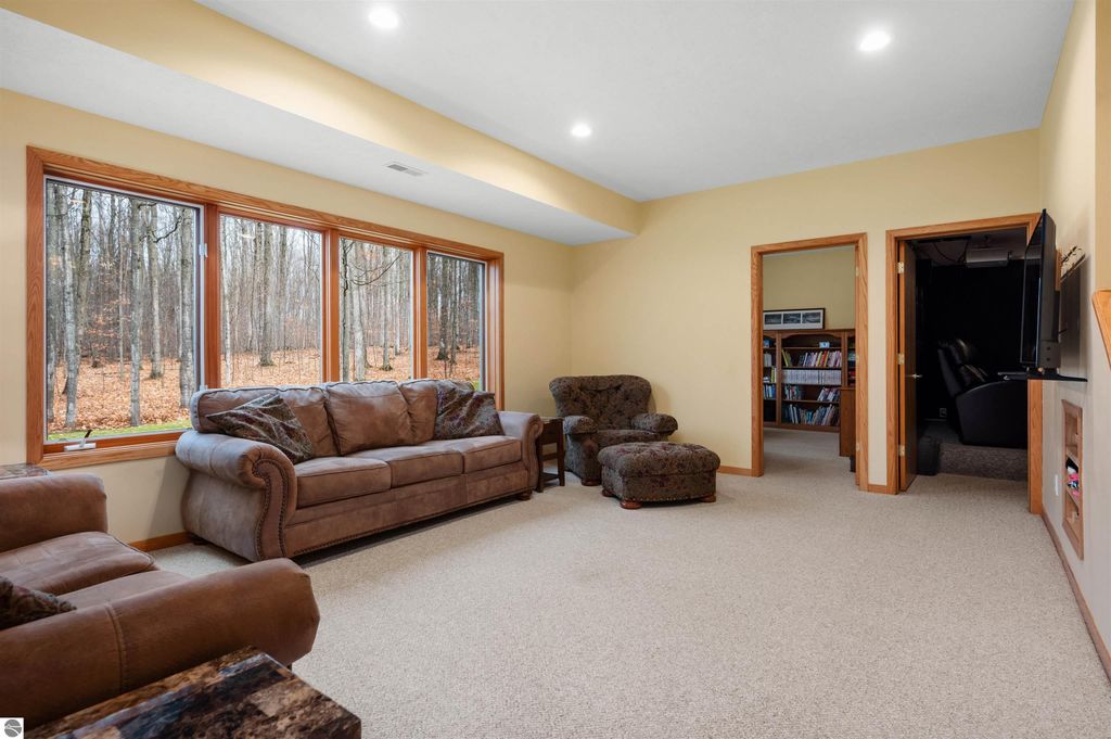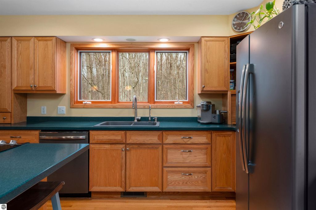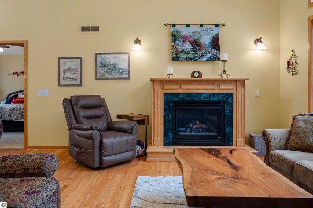 Welcome home to this beautiful, well-maintained 5-bedroom (plus an office), 3.5-bath home with 3,500 sq. ft. Set on 10 wooded acres at the end of a quiet cul-de-sac, this Leelanau County gem offers exceptional privacy and only 15 minutes to downtown Traverse City. Entering the front door, you'll be welcomed into the living room with a soaring two story ceiling and a cozy fireplace, looking out over a serene wooded setting. The spacious island kitchen features newer appliances and a large wall pantry. A convenient main-floor laundry and mudroom with built-in cubbies and a half bath sits just off the heated three stall garage, which includes a new storage system and access to a bonus room above, ready for your finishing touches. The main floor primary suite offers a large walk-in closet and a newly updated luxury bath. Upstairs you'll discover two generously sized bedrooms and another full bath. Additional living spaces, perfect for entertaining, include a formal dining room and a finished walkout lower level with two additional bedrooms, an office, and a dedicated theater room. Outside, enjoy beautiful landscaping, a large custom patio with firepit, an adorable playhouse, and even a maple syrup making sugar shack. Energy-efficient geothermal heating and cooling keep utility costs impressively low. See associated documents for a full list of updates. Don't miss this exceptional property!