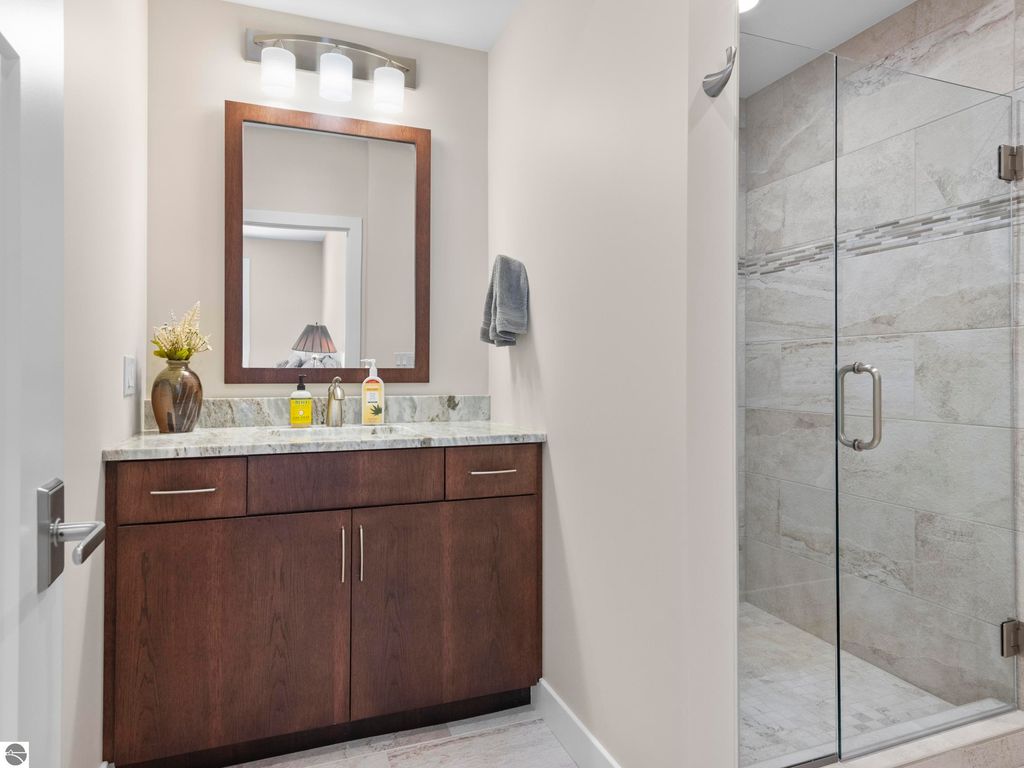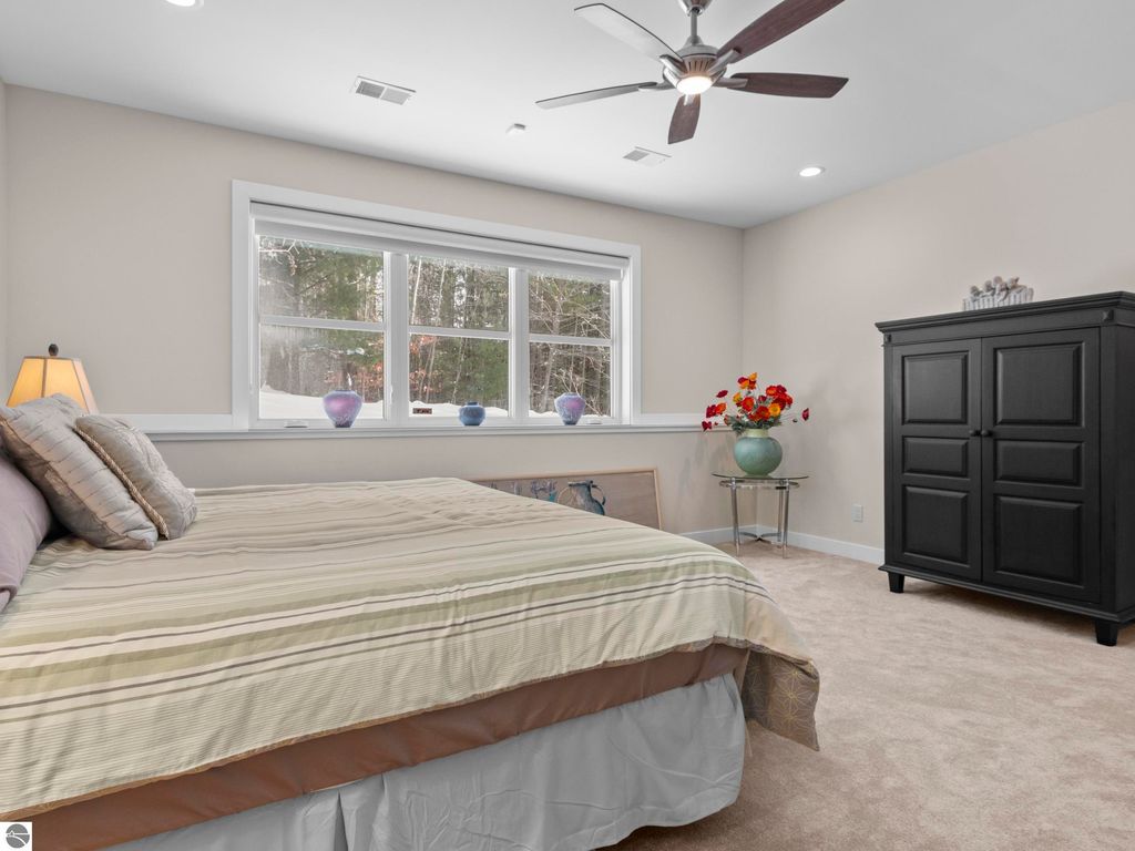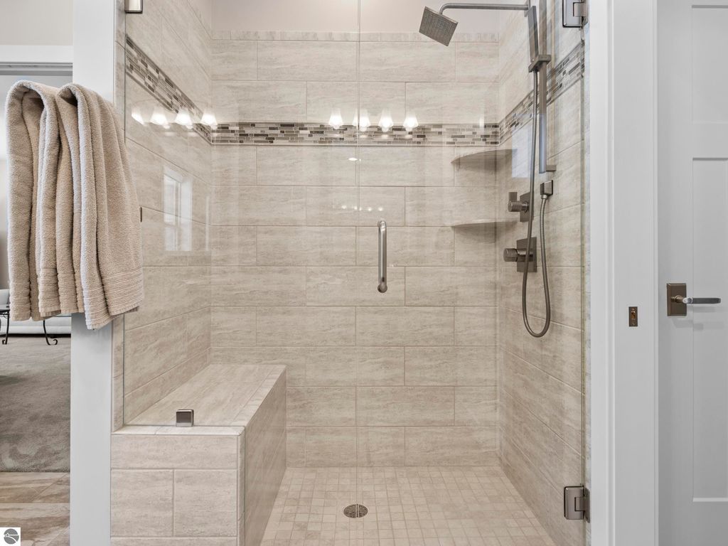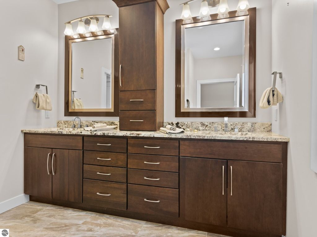 Welcome to this well maintained ten year old five bedroom, four bath Craftsman style raised ranch in Long Lake Township. Set on a private acre, the home is only a mile from two public beaches and a boat launch on Long Lake. The open and light filled floor plan features granite countertops, tray ceilings, and gas fireplaces that creates warm and welcoming living spaces. Two large primary suites set this home apart. The main floor suite offers privacy and convenience with a beautifully tiled shower and thoughtful finishes. The lower level suite is ideal for multigenerational living or guests who appreciate their own space (both levels include gas fireplaces for added comfort). The lower level is fully finished with a wet bar, generous living space, and plenty of room to relax or entertain. Additional highlights include a three car garage with substantial storage above, abundant closet storage throughout, a whole house generator, in-floor heat in the main floor primary bathroom, and a location that keeps you close to downtown Traverse City while giving you the peace and privacy of Long Lake Township.