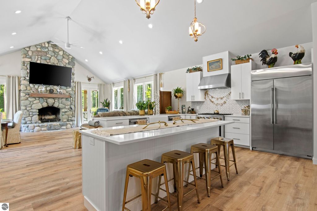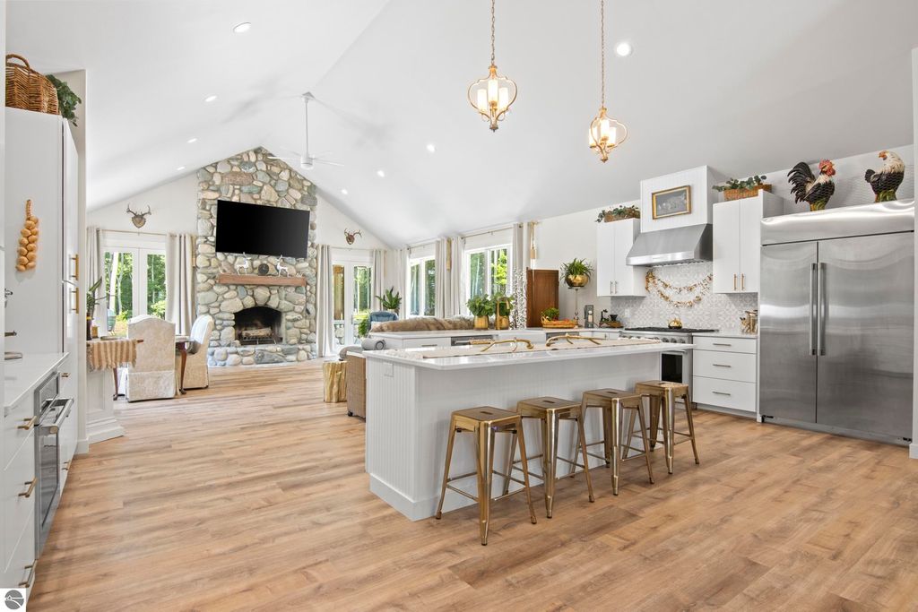 NEWLY BUILT CUSTOM HOME on 4.3 acres in a premier Alden Meadows location. The moment you see the stunning entrance you will be impressed with stone accents and wood beams. This picture-perfect home is enhanced by an open floor plan with over 2,300 sq. ft. of one floor living; high end details and finishes throughout; 3 bedrooms, 2 baths; spacious foyer; gorgeous in-floor heat flooring; heated 3-car garage and so much more. The great room is enhanced by vaulted ceilings, plenty of natural light from the expansive windows; a spectacular stone fireplace flanked by French doors leading you outside to your patio. The gourmet in your family will love the thoughtfully-designed kitchen featuring professional grade stainless appliances; an island with bar seating; gorgeous tile backsplash, large farmhouse style sink; plenty of cabinets and delightful amenities. The primary suite will offer a serene escape with a fireplace, french doors leading you to the gardens and swim spa; luxurious bath with soaking tub, dual vanities; and a large walk-in closet. The den/office offers a convenient space to work from home. Entertaining will be a breeze on the outdoor patio, get ready to host family and friends while enjoying this peaceful wooded setting. A crushed stone pathway leads you to the garden where your green thumb will thrive growing you own vegetables, fruit and flowers. Minutes from downtown Alden and a short drive to all that northern Michigan has to offer for four seasons of fun! Move in ready and waiting for you!