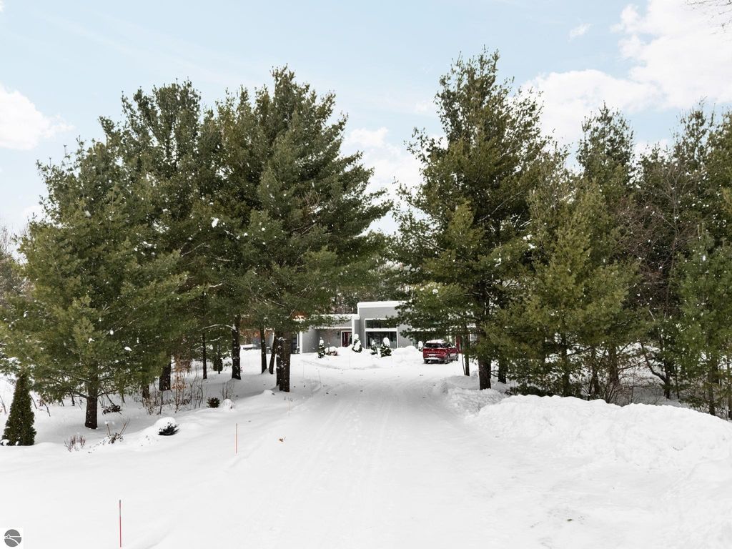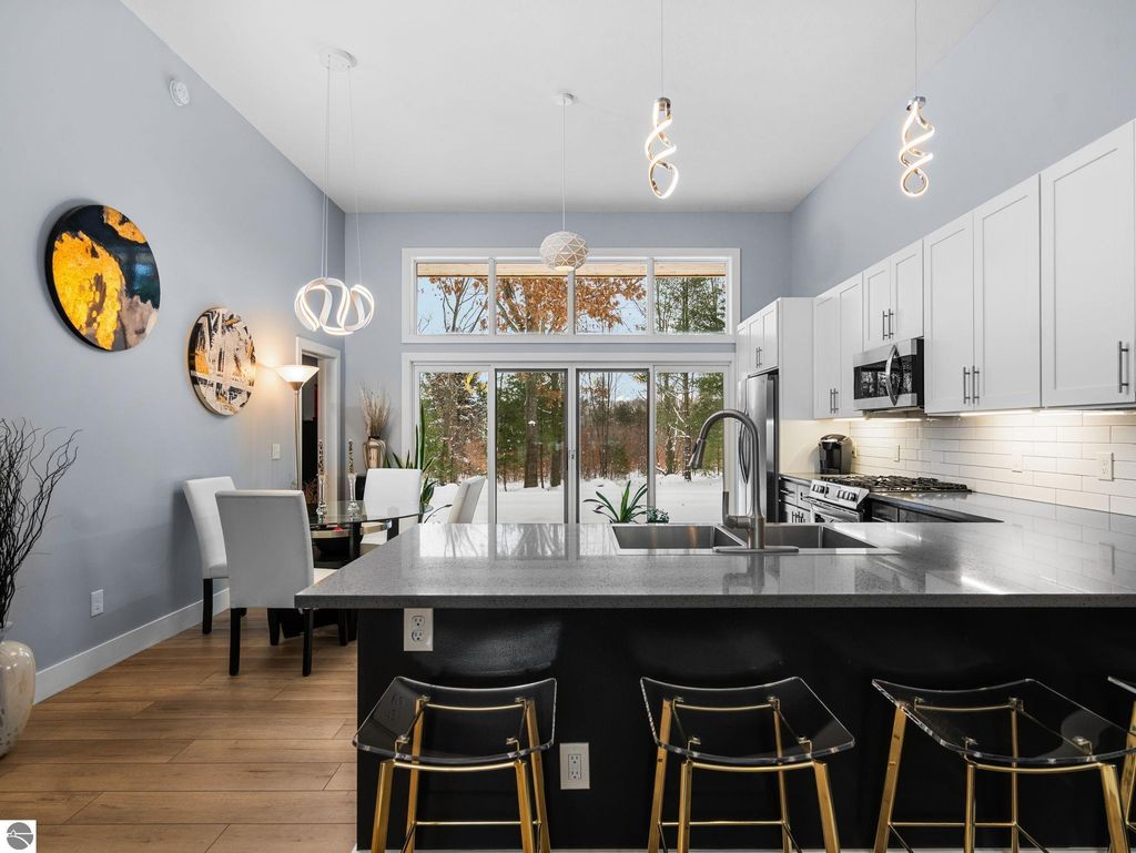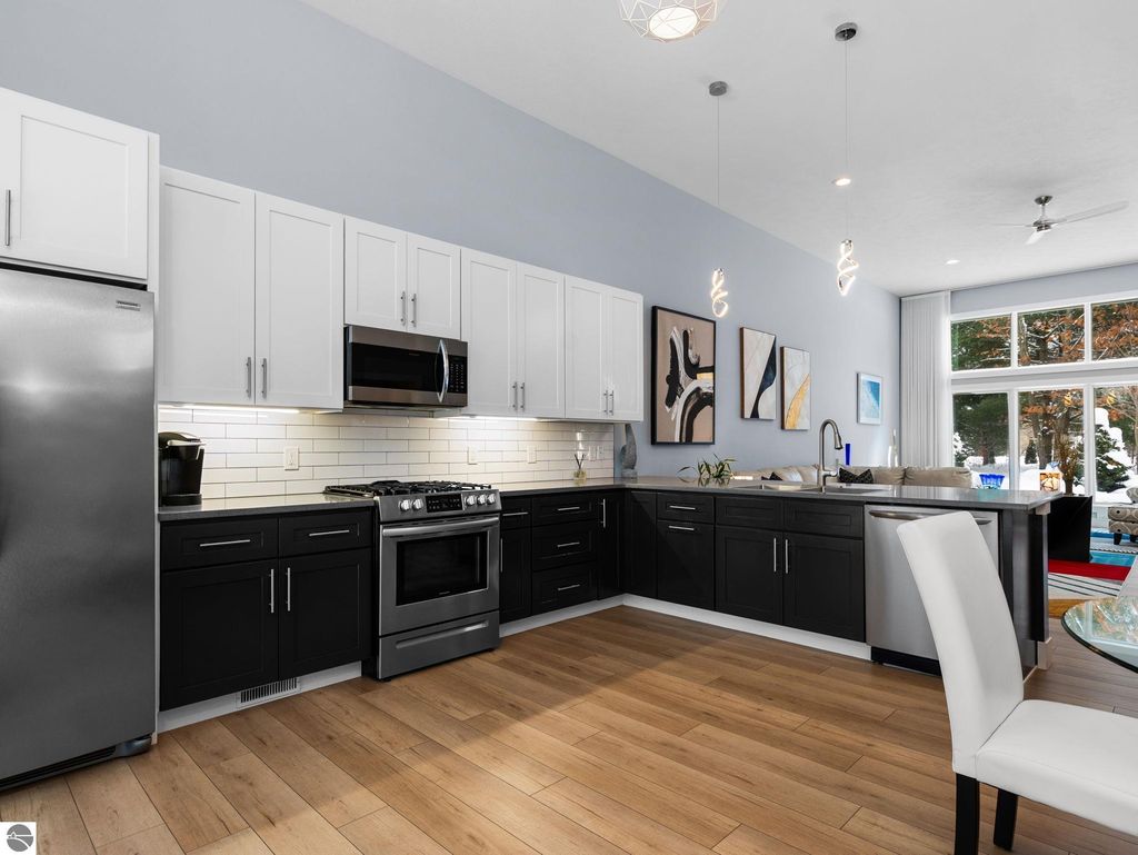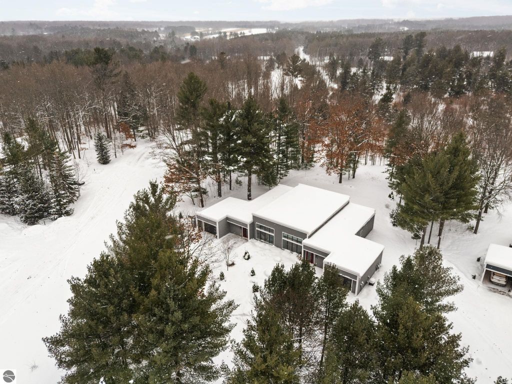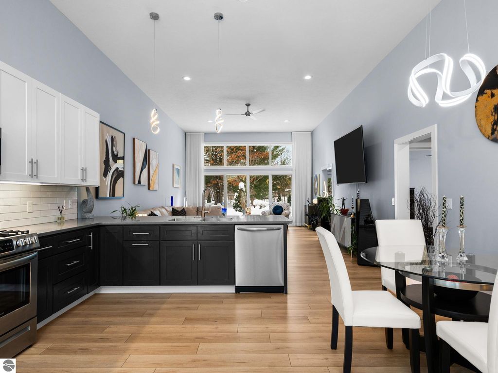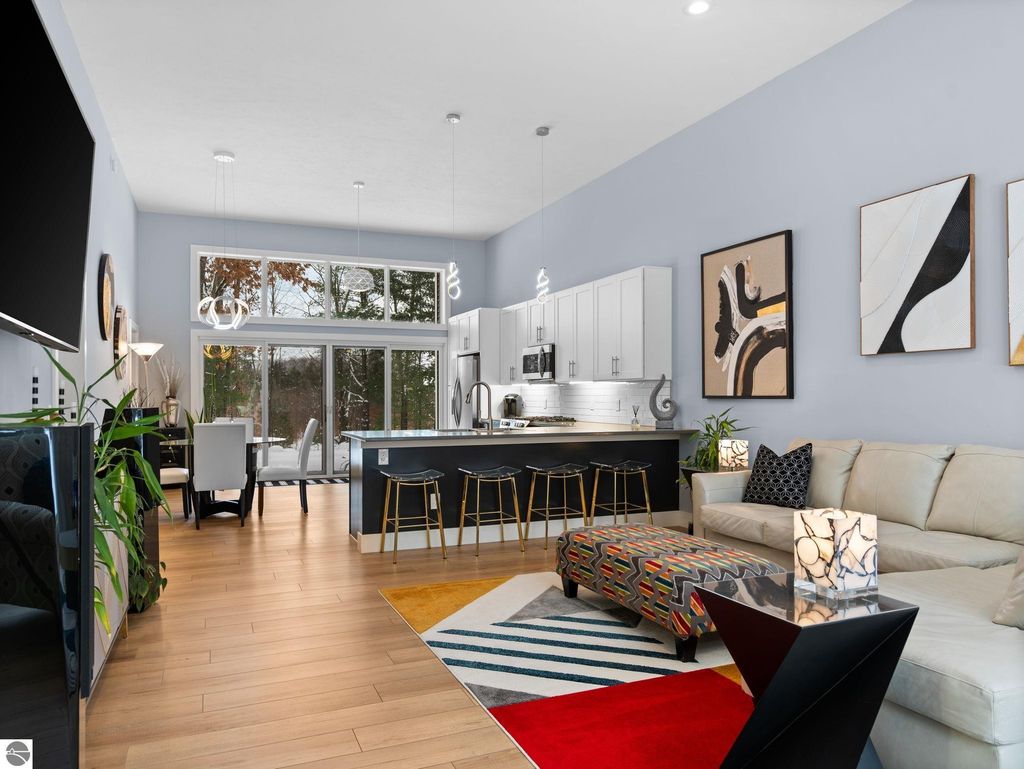 Welcome to 8906-A Manhattan North, a custom-built 2-bed, 2-bath condo with a 1-car garage, offering modern design, privacy, and a nature-filled setting just 10 minutes from downtown Traverse City. Located in a quiet, low-traffic community, this home backs to wooded views, direct access to hiking trails and is a quick drive to Long Lake's public beach and boat launch. Inside, 14-foot walls of windows flood the open-concept living space with natural light. The gourmet kitchen features premium cabinetry, quartz countertops, and high-end appliances. Thoughtful construction includes double shaft walls for added sound separation. Low-maintenance exterior amenities include LeafGuard gutters, irrigation, professional landscaping, and fenced utility areas"”making this an easy-living retreat in a truly special location.