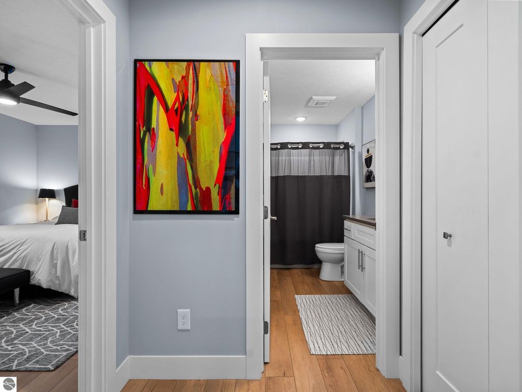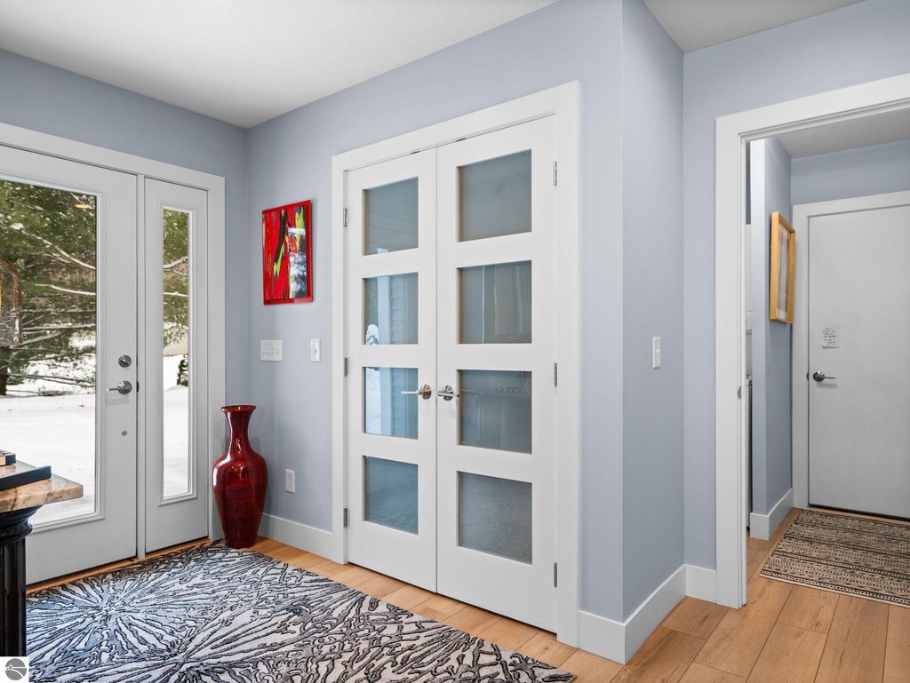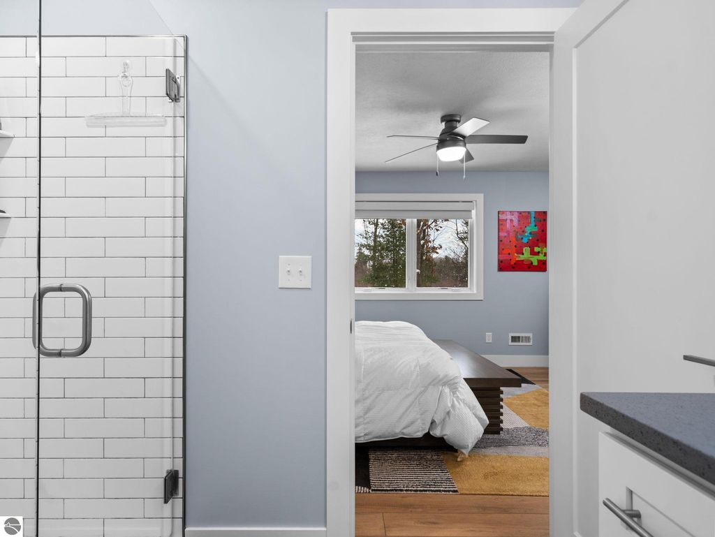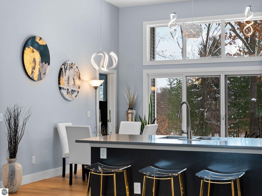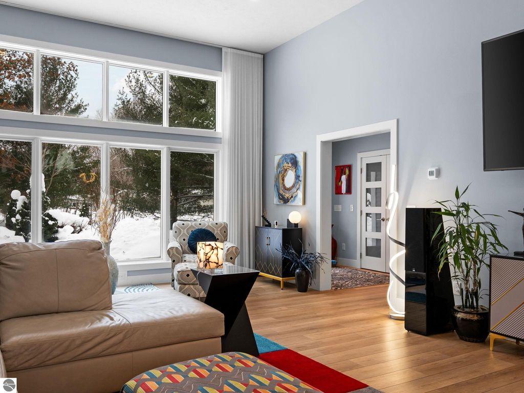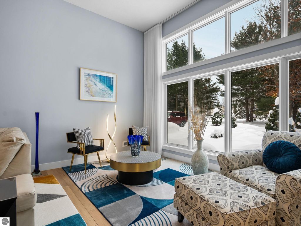 Welcome to 8906-A Manhattan North, a custom-built 2-bed, 2-bath condo with a 1-car garage, offering modern design, privacy, and a nature-filled setting just 10 minutes from downtown Traverse City. Located in a quiet, low-traffic community, this home backs to wooded views, direct access to hiking trails and is a quick drive to Long Lake's public beach and boat launch. Inside, 14-foot walls of windows flood the open-concept living space with natural light. The gourmet kitchen features premium cabinetry, quartz countertops, and high-end appliances. Thoughtful construction includes double shaft walls for added sound separation. Low-maintenance exterior amenities include LeafGuard gutters, irrigation, professional landscaping, and fenced utility areas"”making this an easy-living retreat in a truly special location.