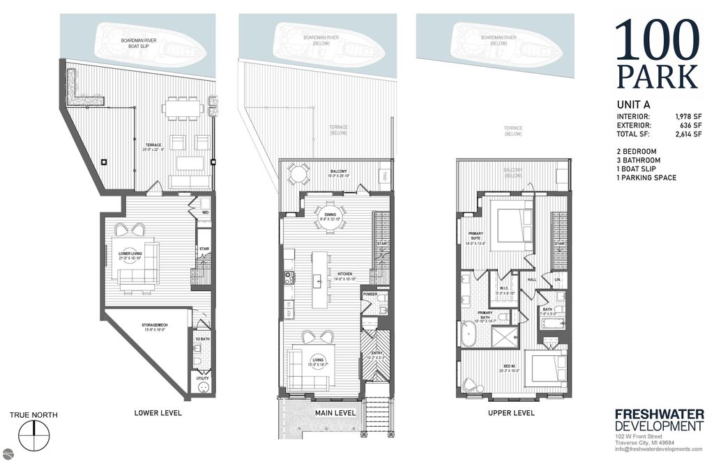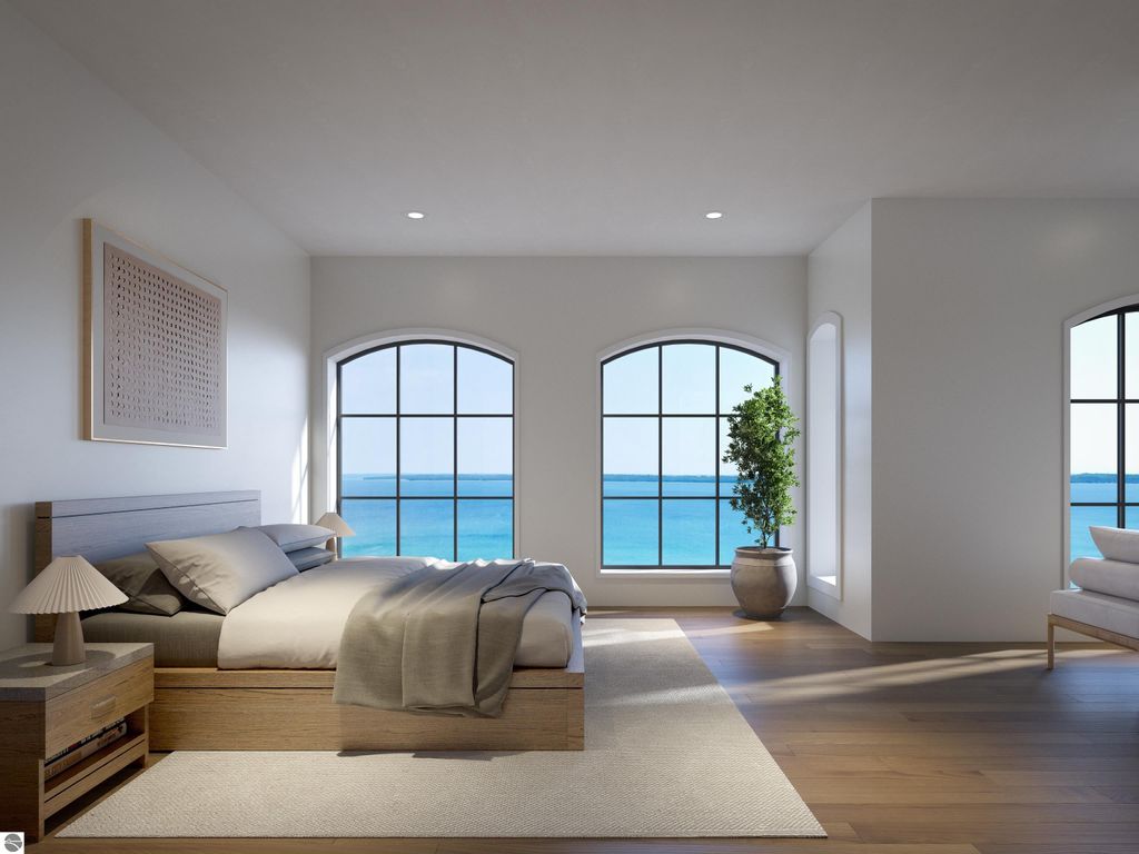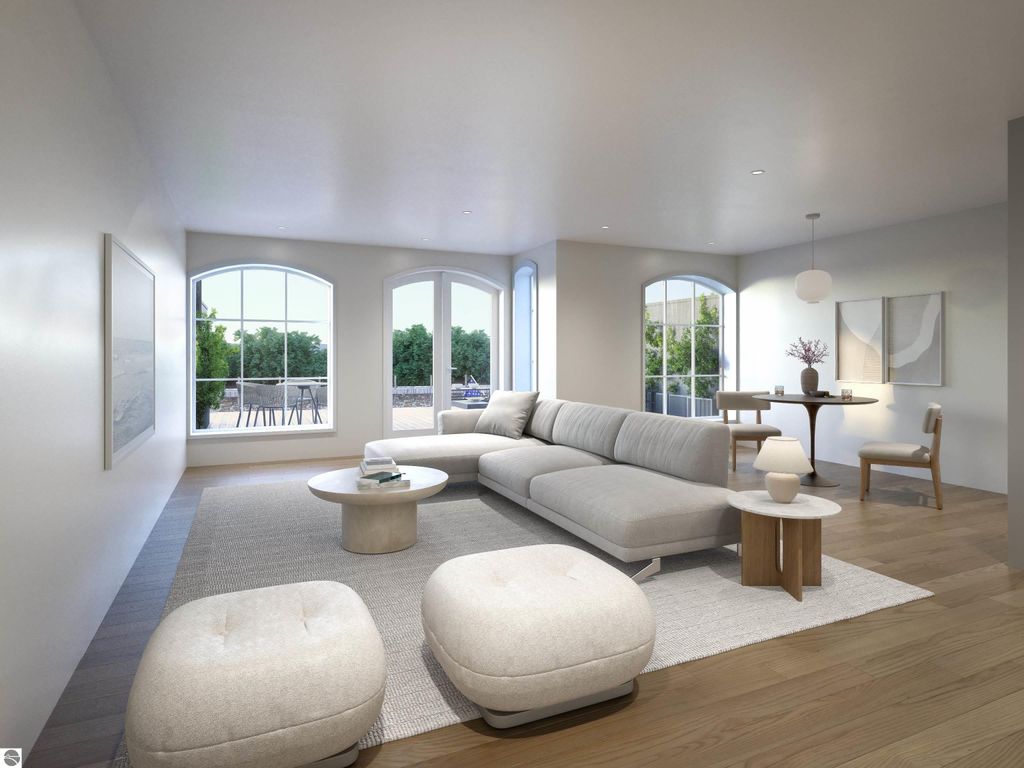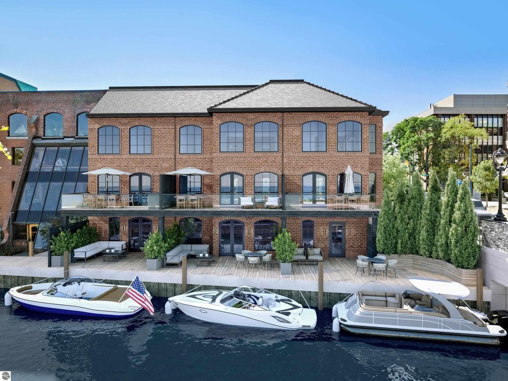 Only one residence remains at The Brownstones at 100 Park, downtown Traverse City's first and only residential waterfront development offering private boat slips. This landmark project by Freshwater Development features three custom brownstone homes with panoramic water views, direct Boardman River frontage, and effortless boating access to West Grand Traverse Bay. The final available residence will be fully completed and move-in ready in June 2026, presenting a rare opportunity to own a finished waterfront home of this caliber in the heart of downtown, just in time to enjoy summer in Traverse City. The home includes a private boat slip for a 22-foot boat and two parking spaces within a gated private courtyard. Interiors are thoughtfully designed to maximize natural light and water views, with open-concept living spaces, private balconies off the main level, and a lower level entertainment space that opens to a private terrace and boat slip. Finishes have been professionally curated and executed to the highest standard, including integrated Miele appliances, deVOL fixtures, white oak flooring throughout, Taj Mahal quartzite countertops and backsplashes, and spa-like bathrooms clad in marble. This premier corner brownstone features three sides of custom arched windows, creating an exceptional sense of light, volume, and architectural distinction. Just steps from the waterfront, beaches, marinas, dining, and boutiques, the residence offers a seamless blend of privacy, luxury, and downtown convenience. Private showings are available by appointment during construction. Freshwater Development provides clients with concierge level service that extends well beyond closing. Visit freshwaterdevelopments.com for more information.