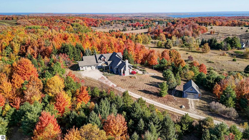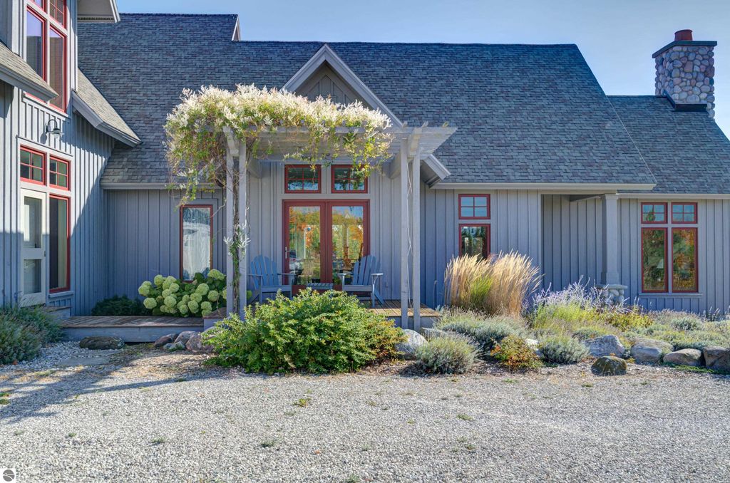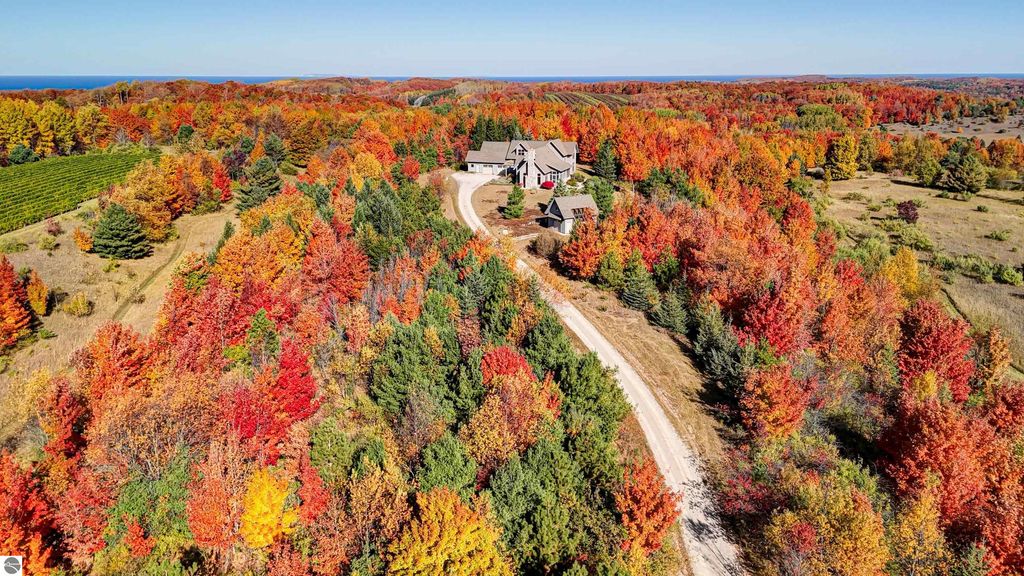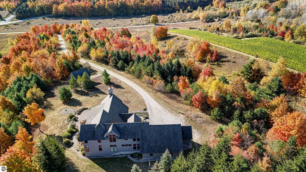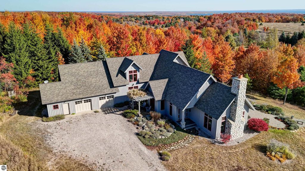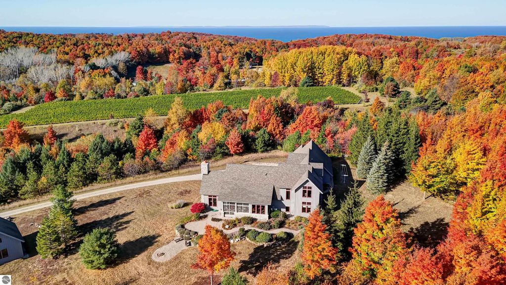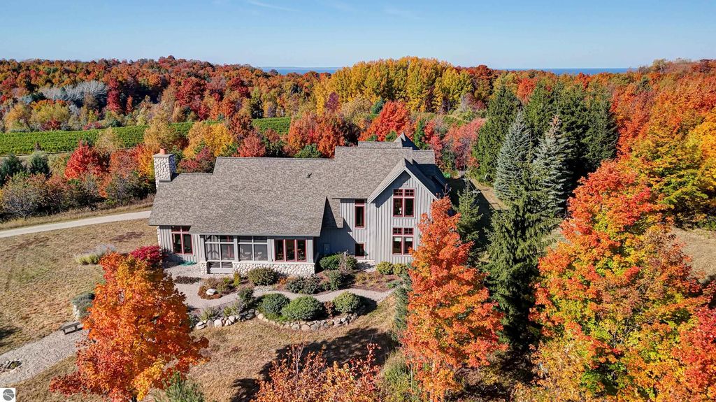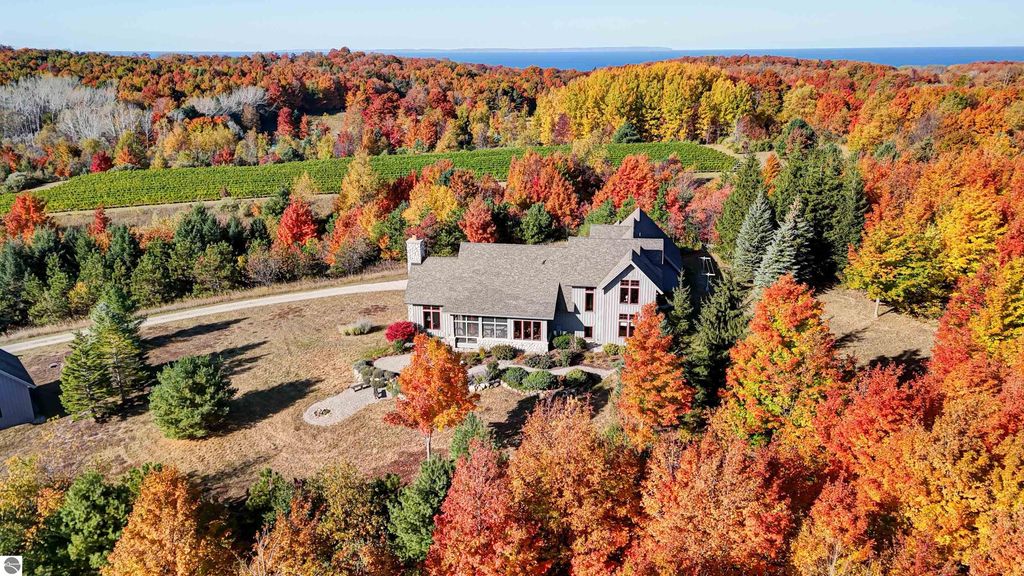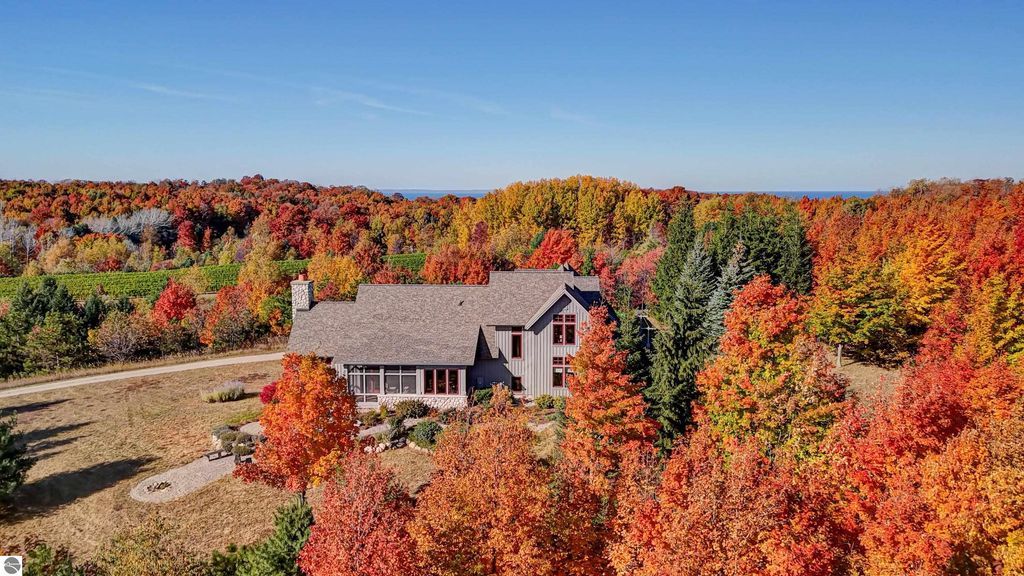 The Views! Wake each day to sweeping countryside vistas with peaceful views of Grand Traverse Bay in the distance, creating a serene and ever-changing backdrop to this thoughtfully designed home. Designed by architect Robert Holdman and built by Webster Construction, the residence reflects quality craftsmanship and timeless design throughout. Inside, the main level offers comfortable one-level living with a primary bedroom suite, laundry room, and an open, inviting layout accented by beautiful maple hardwood flooring. The very spacious living room features a wood-burning stone fireplace, providing a warm and welcoming space for everyday living and entertaining. The kitchen is both functional and inviting, offering a spacious walk-in pantry with exceptional additional storage, and opens to a charming screened porch "” the perfect place to start or end the day while enjoying the surrounding natural beauty and the flower filled garden. Upstairs, two additional bedrooms, a light-filled and airy office space, and a 3/4 bath provide flexibility for guests, work-from-home needs, or creative pursuits. The lower level adds yet another special feature with a dedicated wine room, ideal for collectors and entertainers alike. Outside, the property continues to impress with naturally inspired landscaping, including a variety of wildflowers that are thoughtfully mowed once a year to allow for reseeding and seasonal blooms. A productive vineyard adds both character and charm to the land. The home includes a two-car attached garage, along with an additional detached one-car garage featuring an integrated greenhouse, offering unique space for gardening enthusiasts, hobbies, or storage. All of this is ideally located just minutes from the heart of Northport "” a truly charming town known for its boutique shops, New Bohemian Cafe, Tom's Market, gas station, (just to name a few) and small-town coastal appeal.