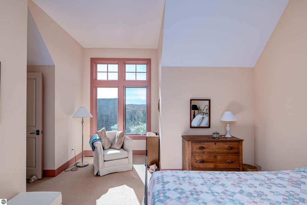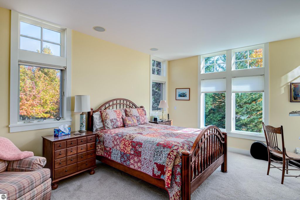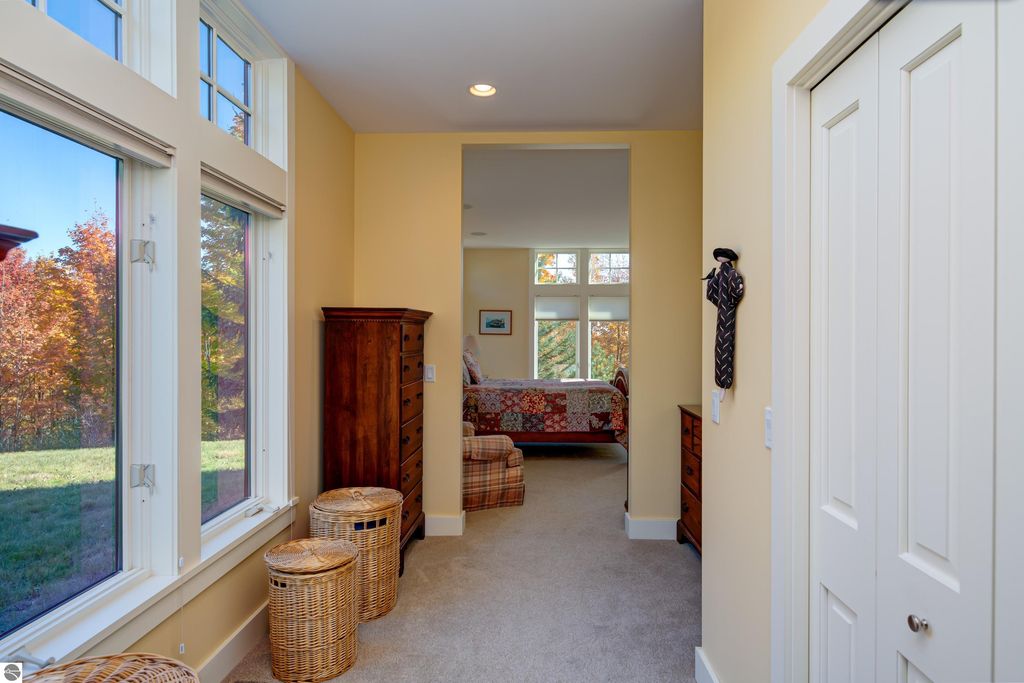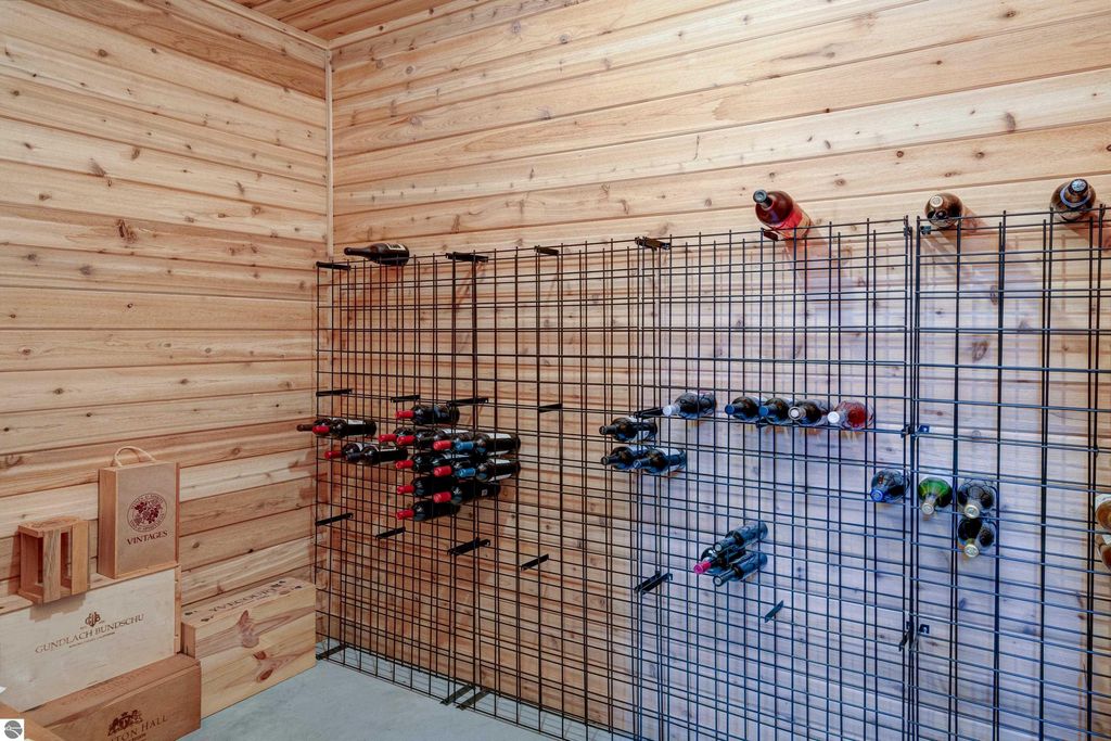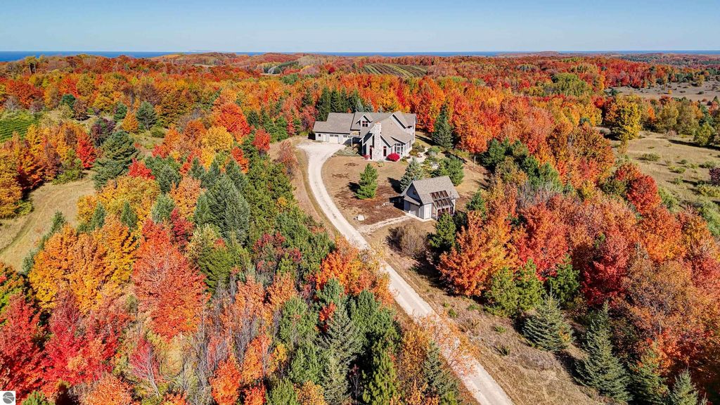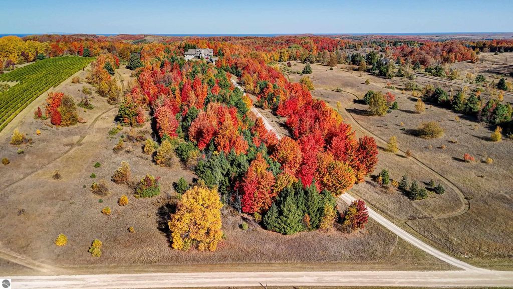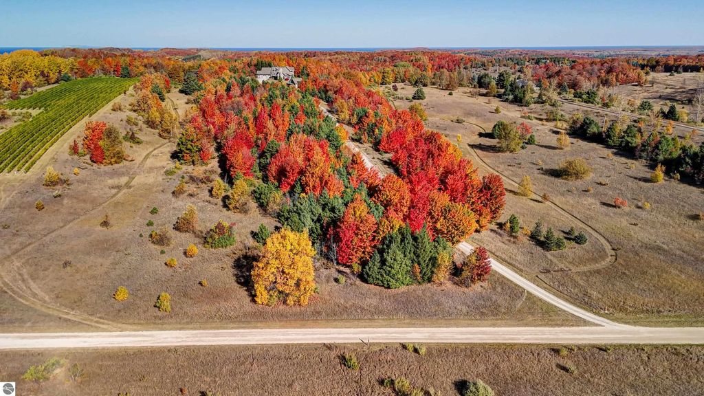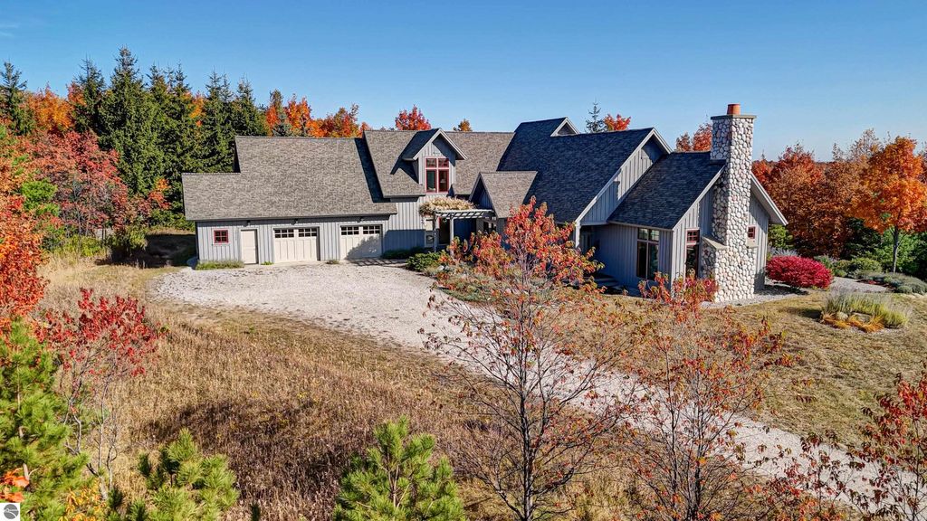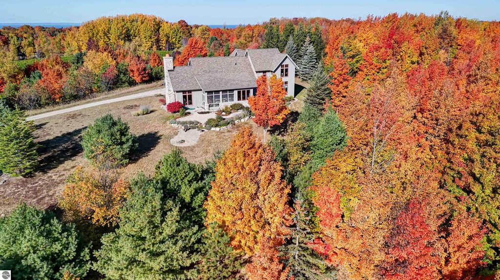 The Views! Wake each day to sweeping countryside vistas with peaceful views of Grand Traverse Bay in the distance, creating a serene and ever-changing backdrop to this thoughtfully designed home. Designed by architect Robert Holdman and built by Webster Construction, the residence reflects quality craftsmanship and timeless design throughout. Inside, the main level offers comfortable one-level living with a primary bedroom suite, laundry room, and an open, inviting layout accented by beautiful maple hardwood flooring. The very spacious living room features a wood-burning stone fireplace, providing a warm and welcoming space for everyday living and entertaining. The kitchen is both functional and inviting, offering a spacious walk-in pantry with exceptional additional storage, and opens to a charming screened porch "” the perfect place to start or end the day while enjoying the surrounding natural beauty and the flower filled garden. Upstairs, two additional bedrooms, a light-filled and airy office space, and a 3/4 bath provide flexibility for guests, work-from-home needs, or creative pursuits. The lower level adds yet another special feature with a dedicated wine room, ideal for collectors and entertainers alike. Outside, the property continues to impress with naturally inspired landscaping, including a variety of wildflowers that are thoughtfully mowed once a year to allow for reseeding and seasonal blooms. A productive vineyard adds both character and charm to the land. The home includes a two-car attached garage, along with an additional detached one-car garage featuring an integrated greenhouse, offering unique space for gardening enthusiasts, hobbies, or storage. All of this is ideally located just minutes from the heart of Northport "” a truly charming town known for its boutique shops, New Bohemian Cafe, Tom's Market, gas station, (just to name a few) and small-town coastal appeal.