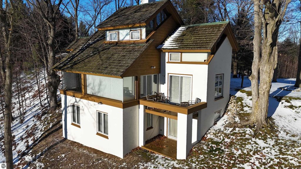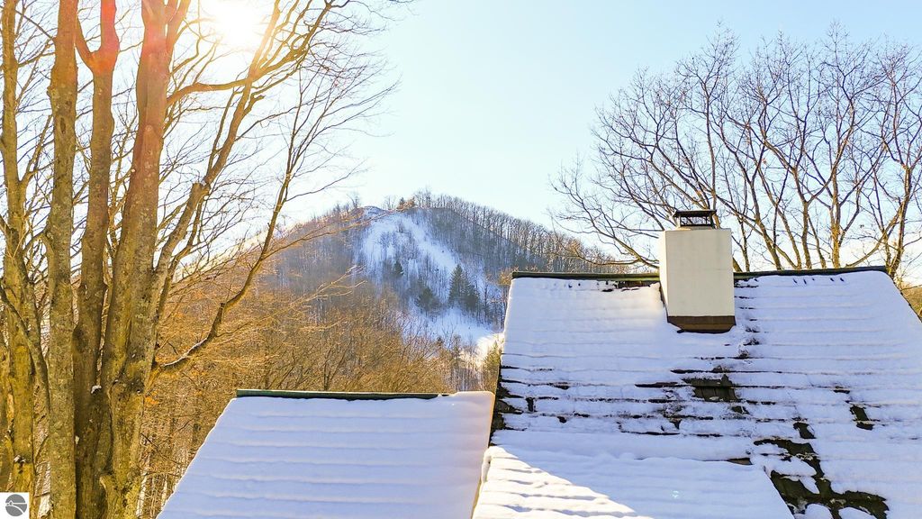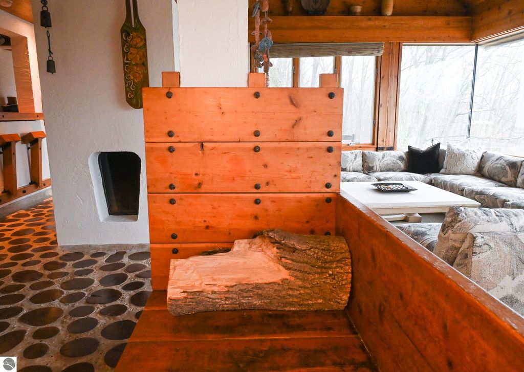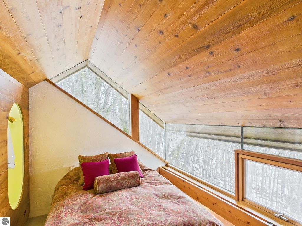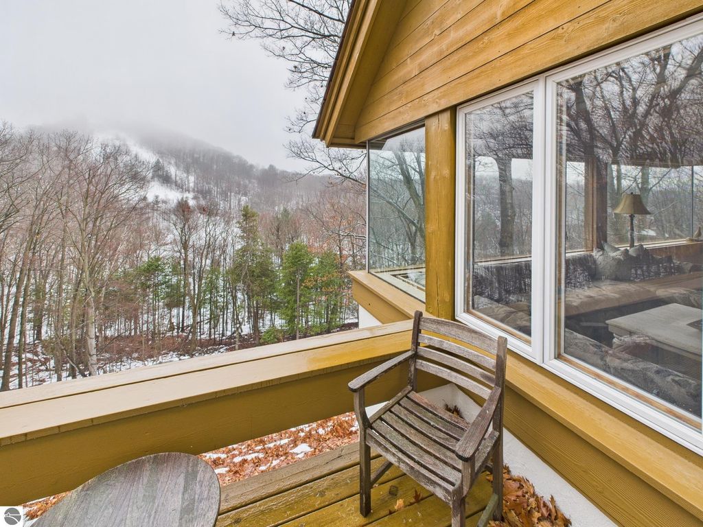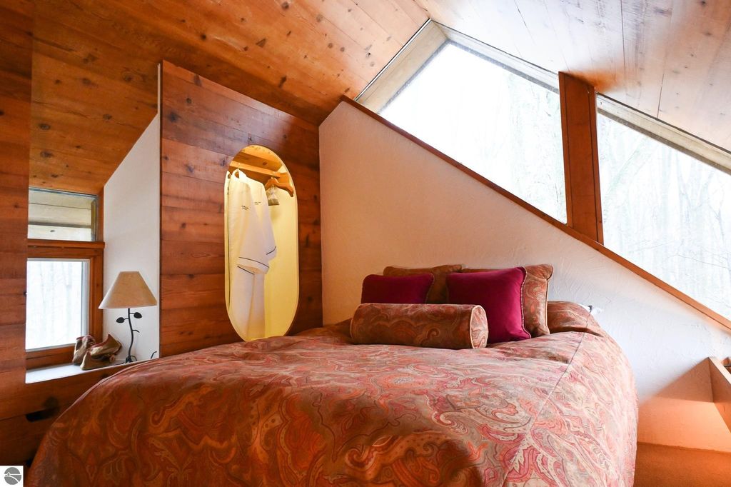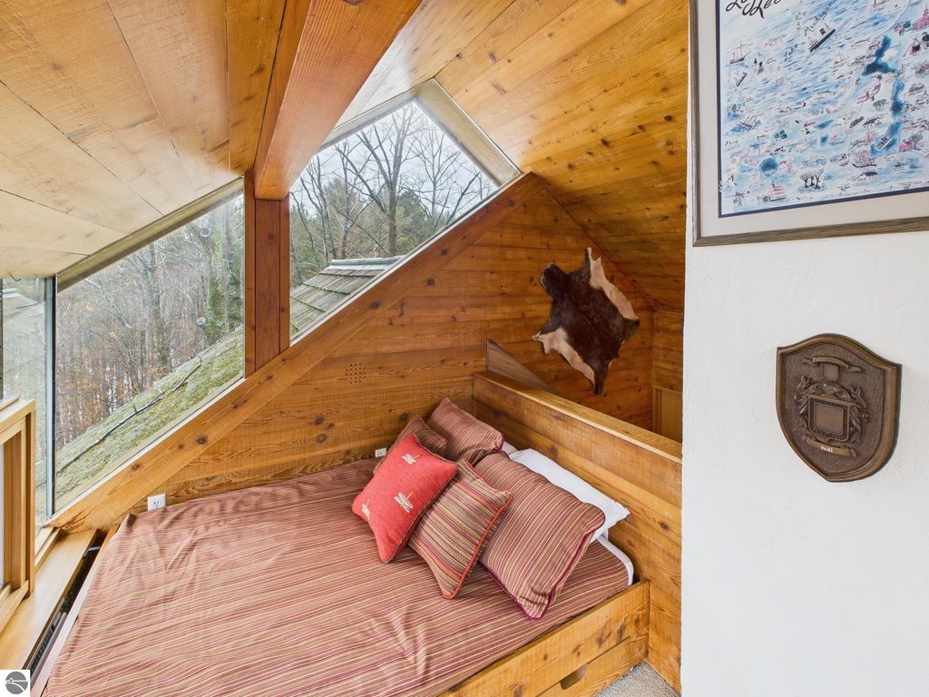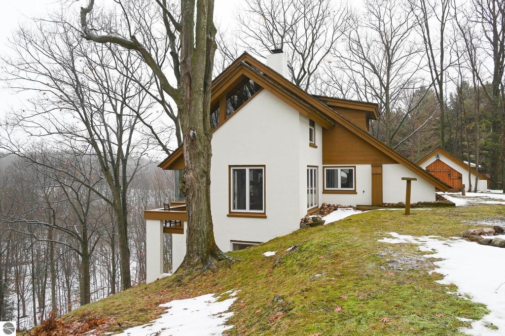This distinctive hillside home was designed by celebrated Northern Michigan architect Roger Hummel during the formative years of Sugar Loaf, when modern architecture and outdoor recreation converged in a way rarely replicated today. Purpose-built for its setting, the home remains largely original and clearly reflective of its era. The design unfolds vertically, with multiple levels connected by sculptural stairways and intimate moments of discovery, including built-in seating, child-scale details, and unexpected vantage points throughout the home. A centrally located fireplace anchors the main living space, while original finishes and handcrafted elements preserve the character and craftsmanship of the period. The lower level includes a private entrance, kitchenette, full bath, and bedrooms, allowing for guest separation while still functioning as a single residence. A sauna, outdoor terraces, and hillside views further enhance the experience. The property directly abuts the former Sugar Loaf ski resort lands, now permanently protected and under active revitalization by the Leelanau Conservancy. The Conservancy has secured full funding to transform the 285-acre site into a year-round public natural area featuring extensive trail networks for hiking, biking, snowshoeing, and cross-country skiing, along with summit access, gathering pavilions, sledding areas, nature play spaces, and ecological restoration initiatives. This protected landscape ensures long-term continuity of open space, recreation, and viewshed immediately adjacent to the home. Short-term rental use has occurred in the surrounding area; buyers should independently verify current regulations and eligibility. This home was never intended to be generic. It offers a strong architectural foundation for thoughtful evolution while preserving an important chapter of Northern Michigan's architectural and recreational history.