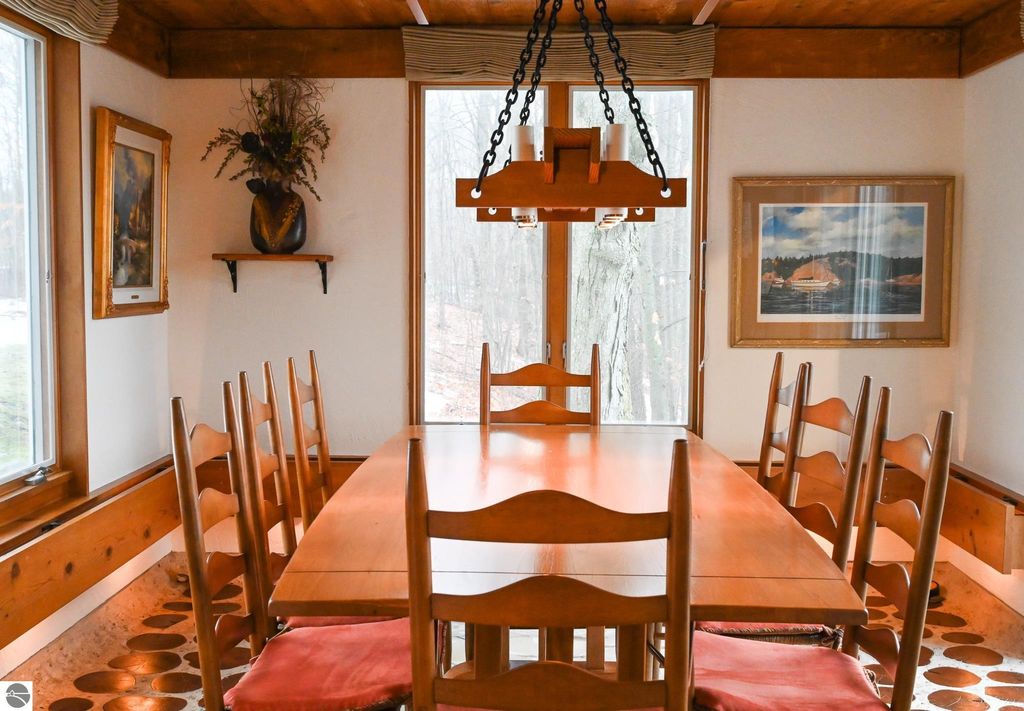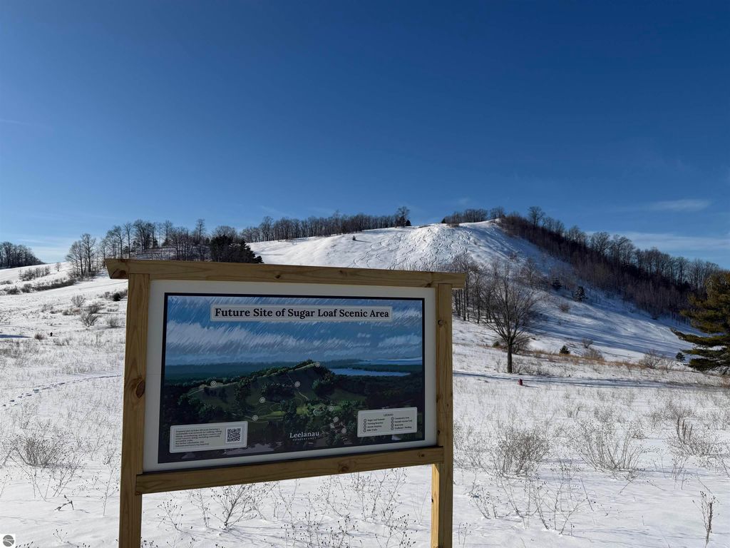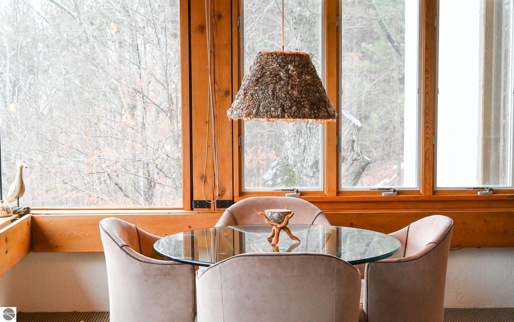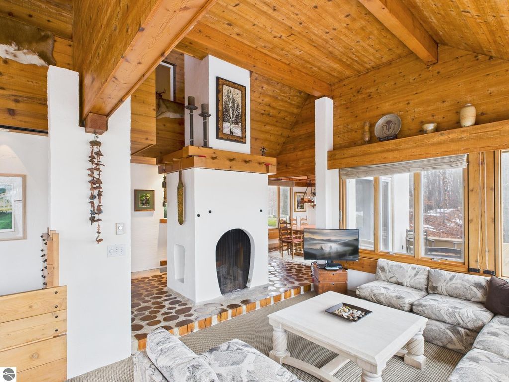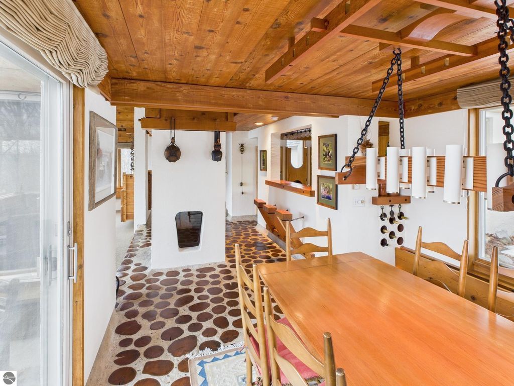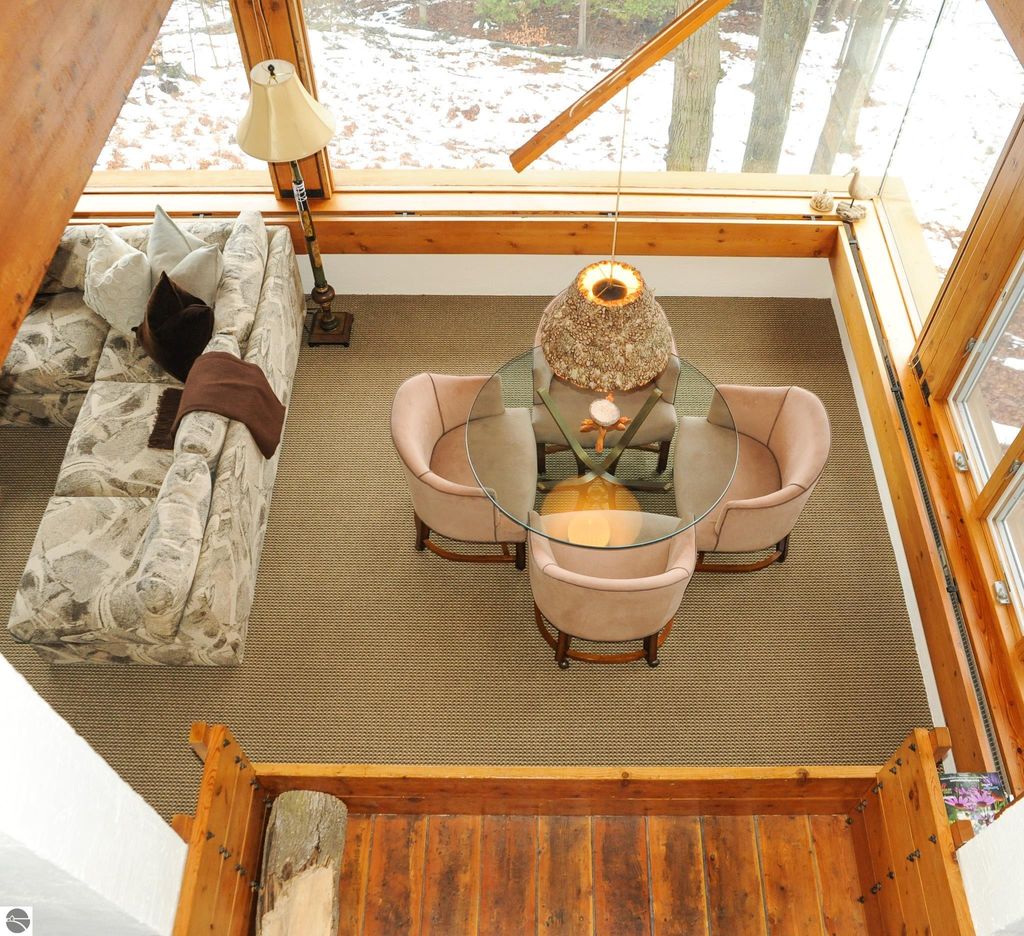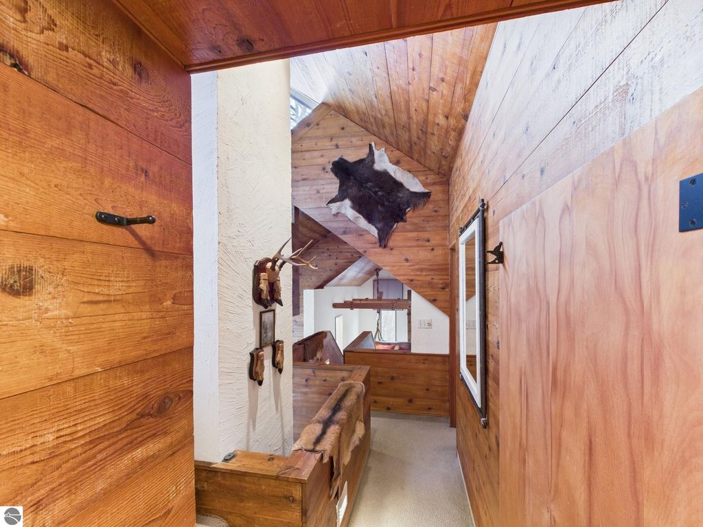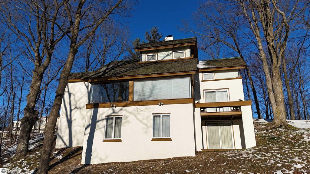 This distinctive hillside home was designed by celebrated Northern Michigan architect Roger Hummel during the formative years of Sugar Loaf, when modern architecture and outdoor recreation converged in a way rarely replicated today. Purpose-built for its setting, the home remains largely original and clearly reflective of its era. The design unfolds vertically, with multiple levels connected by sculptural stairways and intimate moments of discovery, including built-in seating, child-scale details, and unexpected vantage points throughout the home. A centrally located fireplace anchors the main living space, while original finishes and handcrafted elements preserve the character and craftsmanship of the period. The lower level includes a private entrance, kitchenette, full bath, and bedrooms, allowing for guest separation while still functioning as a single residence. A sauna, outdoor terraces, and hillside views further enhance the experience. The property directly abuts the former Sugar Loaf ski resort lands, now permanently protected and under active revitalization by the Leelanau Conservancy. The Conservancy has secured full funding to transform the 285-acre site into a year-round public natural area featuring extensive trail networks for hiking, biking, snowshoeing, and cross-country skiing, along with summit access, gathering pavilions, sledding areas, nature play spaces, and ecological restoration initiatives. This protected landscape ensures long-term continuity of open space, recreation, and viewshed immediately adjacent to the home. Short-term rental use has occurred in the surrounding area; buyers should independently verify current regulations and eligibility. This home was never intended to be generic. It offers a strong architectural foundation for thoughtful evolution while preserving an important chapter of Northern Michigan's architectural and recreational history.