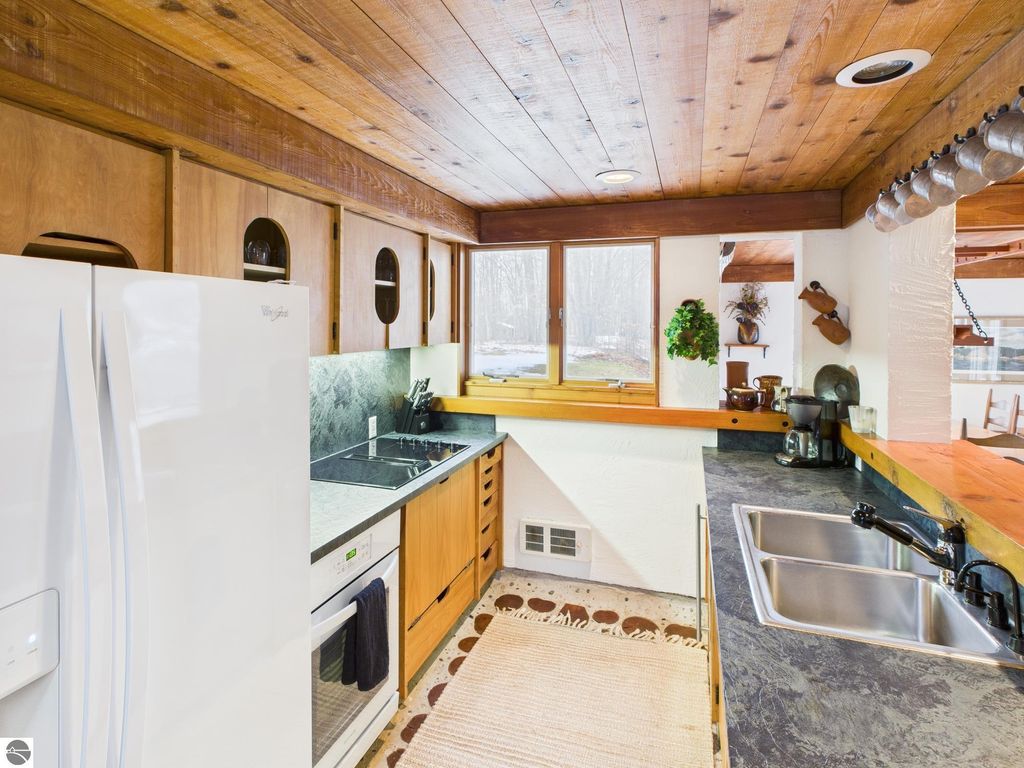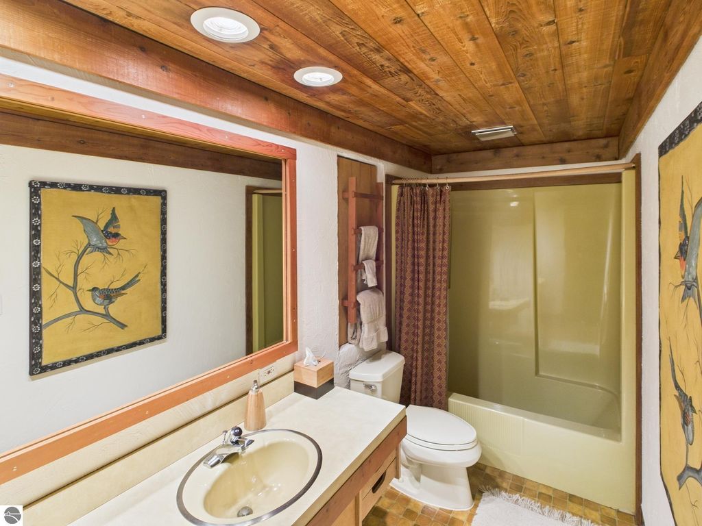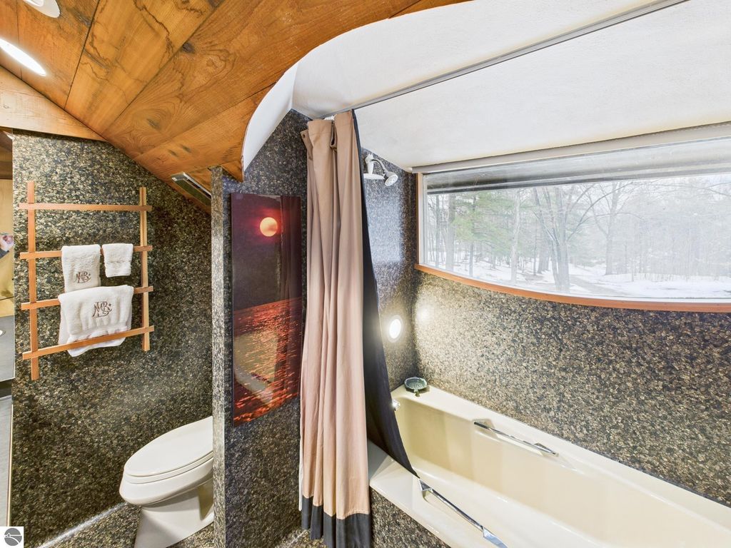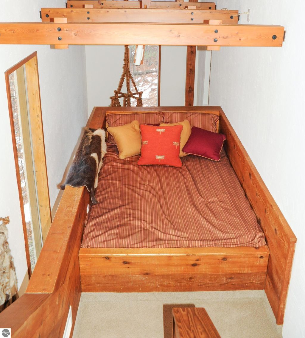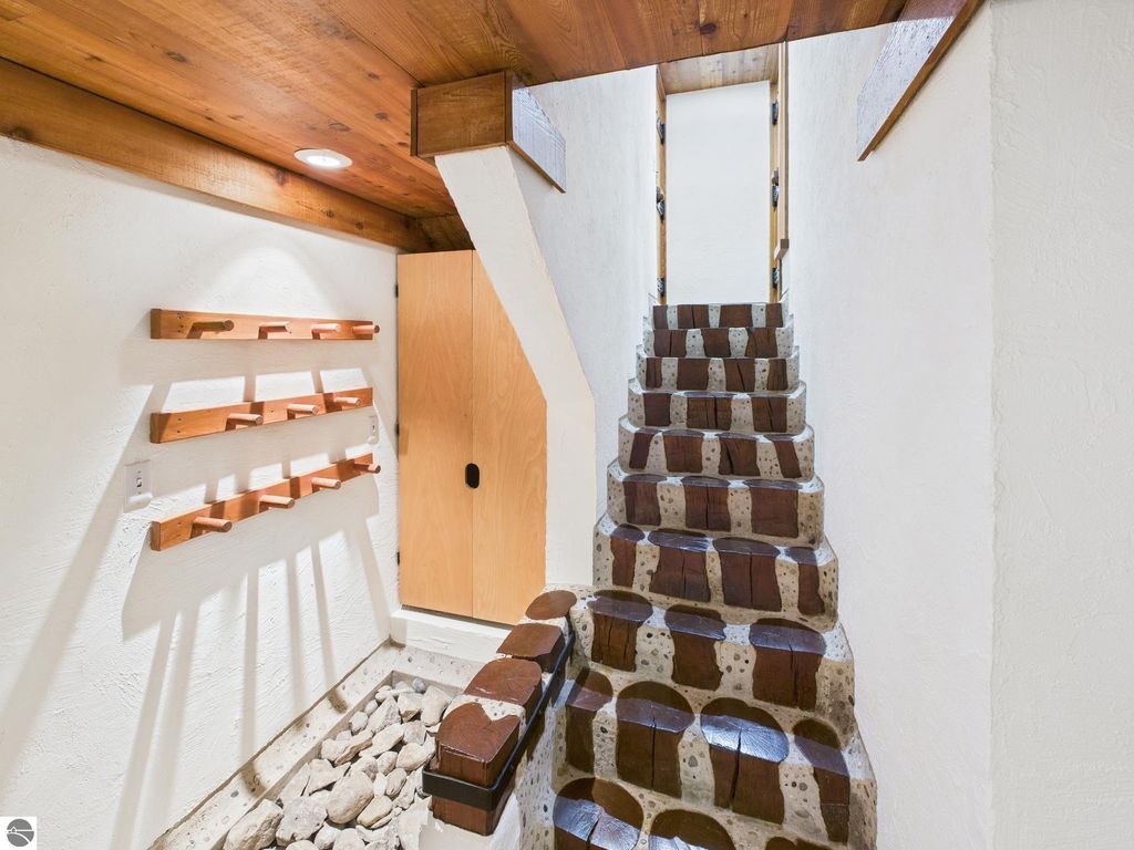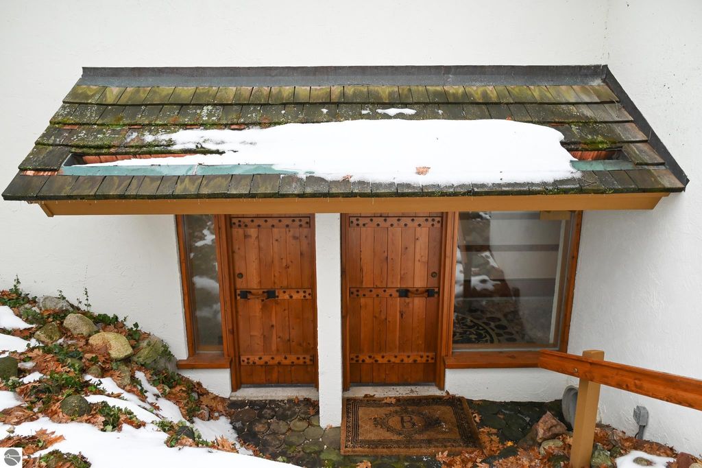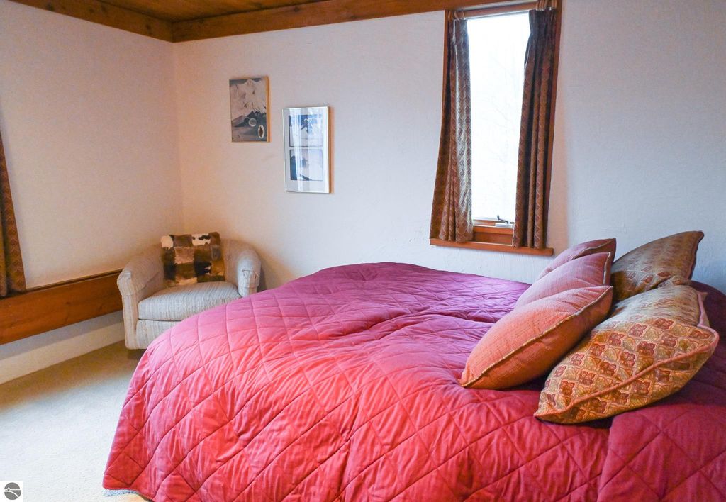This distinctive hillside home was designed by celebrated Northern Michigan architect Roger Hummel during the formative years of Sugar Loaf, when modern architecture and outdoor recreation converged in a way rarely replicated today. Purpose-built for its setting, the home remains largely original and clearly reflective of its era. The design unfolds vertically, with multiple levels connected by sculptural stairways and intimate moments of discovery, including built-in seating, child-scale details, and unexpected vantage points throughout the home. A centrally located fireplace anchors the main living space, while original finishes and handcrafted elements preserve the character and craftsmanship of the period. The lower level includes a private entrance, kitchenette, full bath, and bedrooms, allowing for guest separation while still functioning as a single residence. A sauna, outdoor terraces, and hillside views further enhance the experience. The property directly abuts the former Sugar Loaf ski resort lands, now permanently protected and under active revitalization by the Leelanau Conservancy. The Conservancy has secured full funding to transform the 285-acre site into a year-round public natural area featuring extensive trail networks for hiking, biking, snowshoeing, and cross-country skiing, along with summit access, gathering pavilions, sledding areas, nature play spaces, and ecological restoration initiatives. This protected landscape ensures long-term continuity of open space, recreation, and viewshed immediately adjacent to the home. Short-term rental use has occurred in the surrounding area; buyers should independently verify current regulations and eligibility. This home was never intended to be generic. It offers a strong architectural foundation for thoughtful evolution while preserving an important chapter of Northern Michigan's architectural and recreational history.