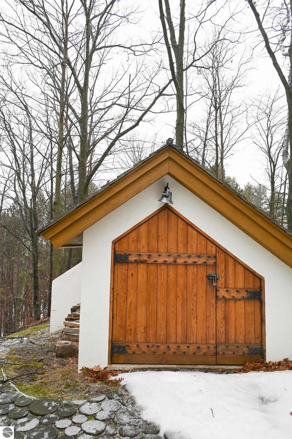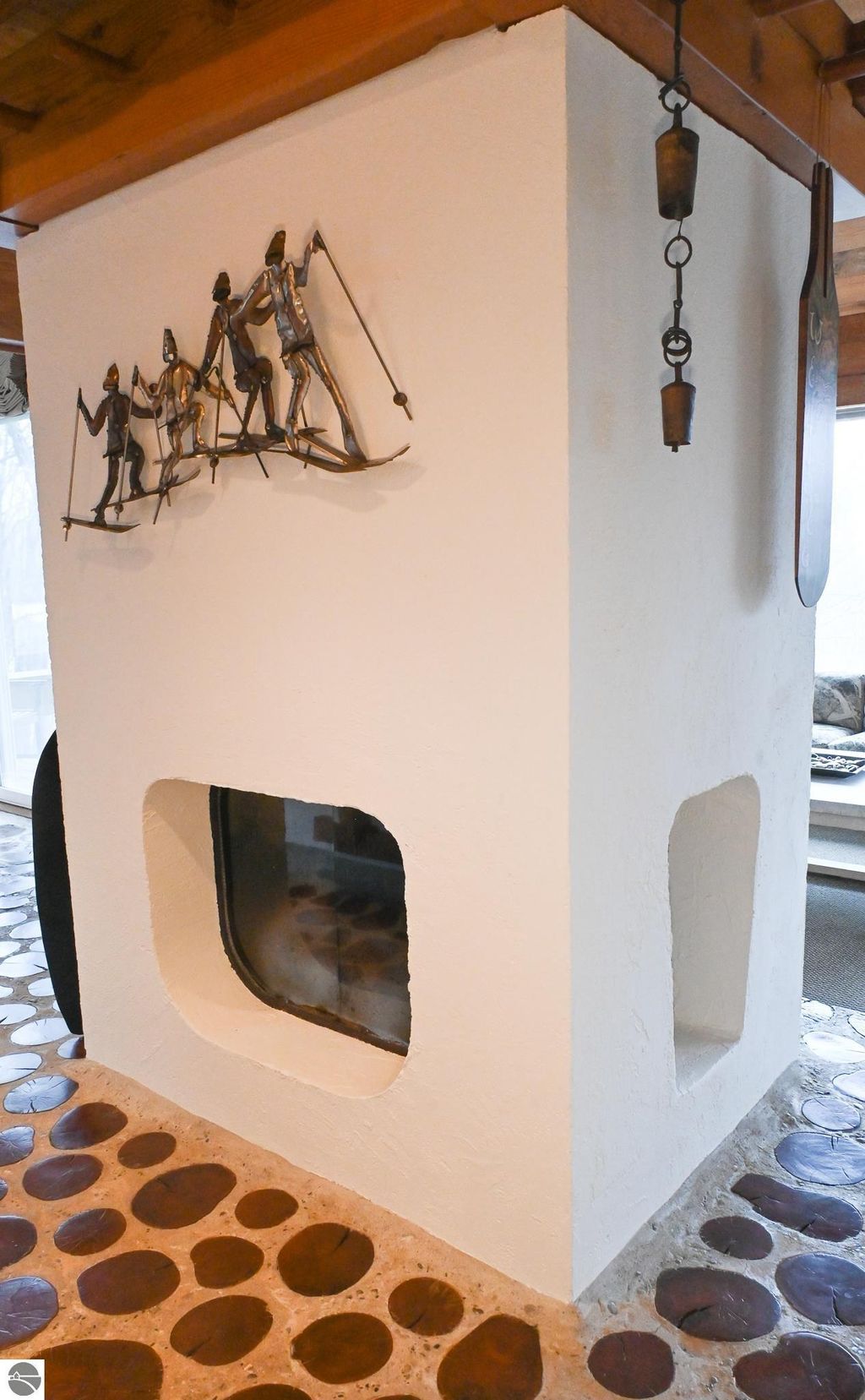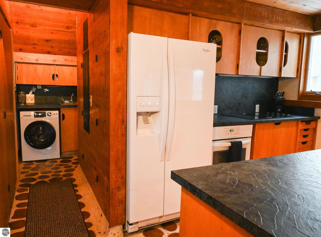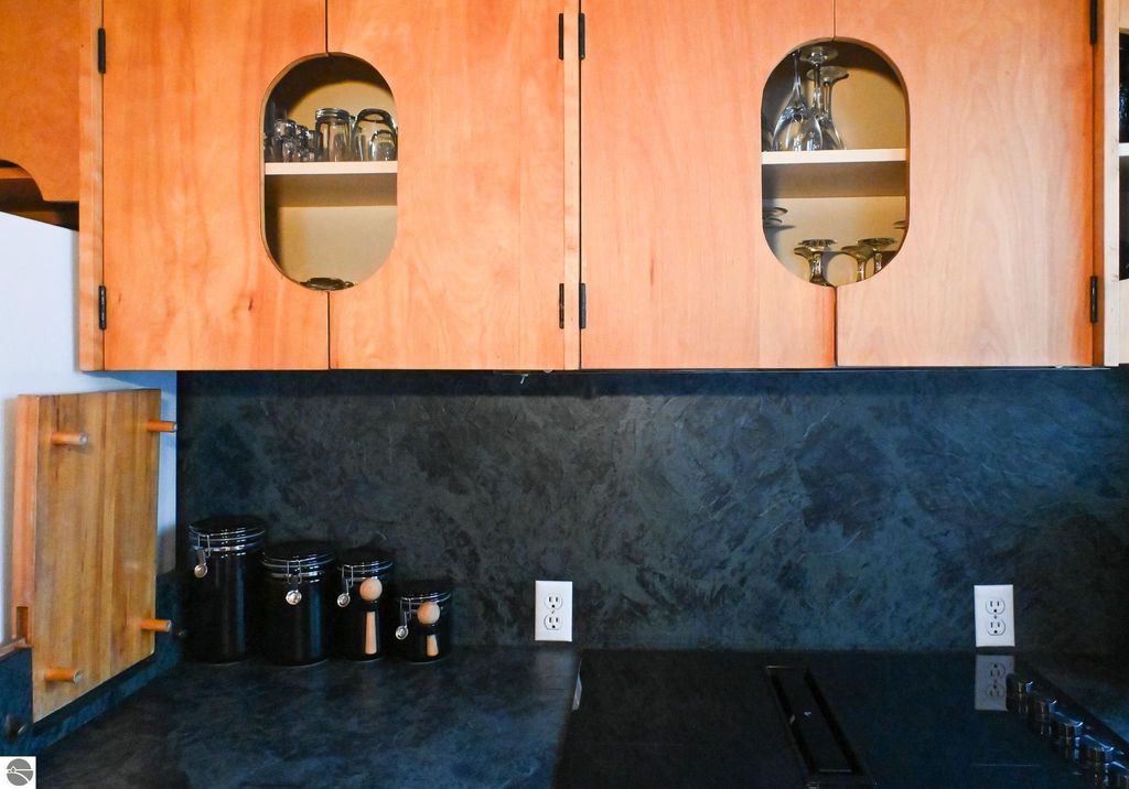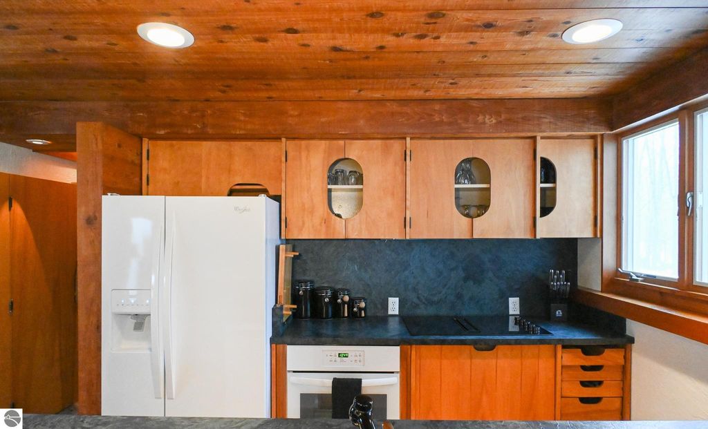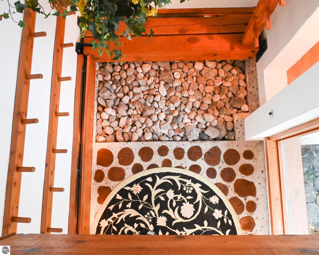 This distinctive hillside home was designed by celebrated Northern Michigan architect Roger Hummel during the formative years of Sugar Loaf, when modern architecture and outdoor recreation converged in a way rarely replicated today. Purpose-built for its setting, the home remains largely original and clearly reflective of its era. The design unfolds vertically, with multiple levels connected by sculptural stairways and intimate moments of discovery, including built-in seating, child-scale details, and unexpected vantage points throughout the home. A centrally located fireplace anchors the main living space, while original finishes and handcrafted elements preserve the character and craftsmanship of the period. The lower level includes a private entrance, kitchenette, full bath, and bedrooms, allowing for guest separation while still functioning as a single residence. A sauna, outdoor terraces, and hillside views further enhance the experience. The property directly abuts the former Sugar Loaf ski resort lands, now permanently protected and under active revitalization by the Leelanau Conservancy. The Conservancy has secured full funding to transform the 285-acre site into a year-round public natural area featuring extensive trail networks for hiking, biking, snowshoeing, and cross-country skiing, along with summit access, gathering pavilions, sledding areas, nature play spaces, and ecological restoration initiatives. This protected landscape ensures long-term continuity of open space, recreation, and viewshed immediately adjacent to the home. Short-term rental use has occurred in the surrounding area; buyers should independently verify current regulations and eligibility. This home was never intended to be generic. It offers a strong architectural foundation for thoughtful evolution while preserving an important chapter of Northern Michigan's architectural and recreational history.