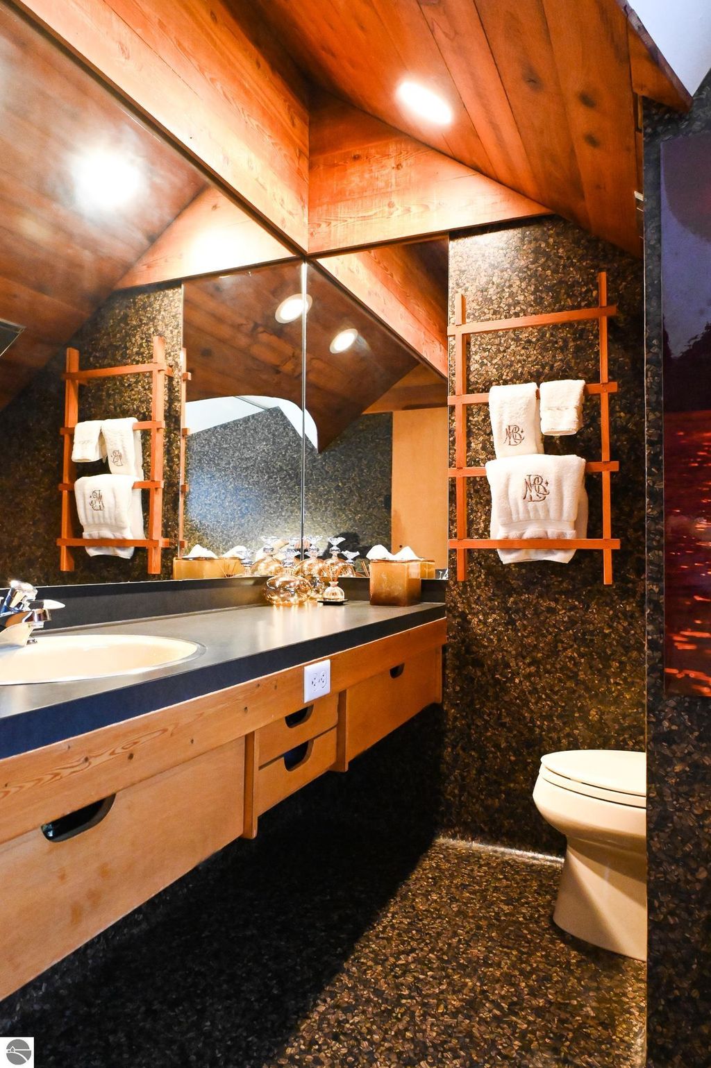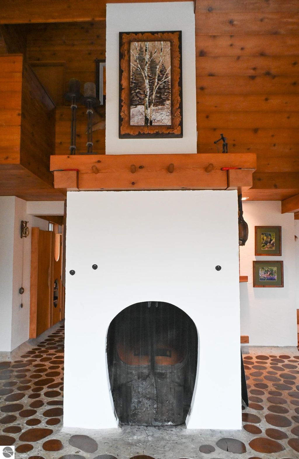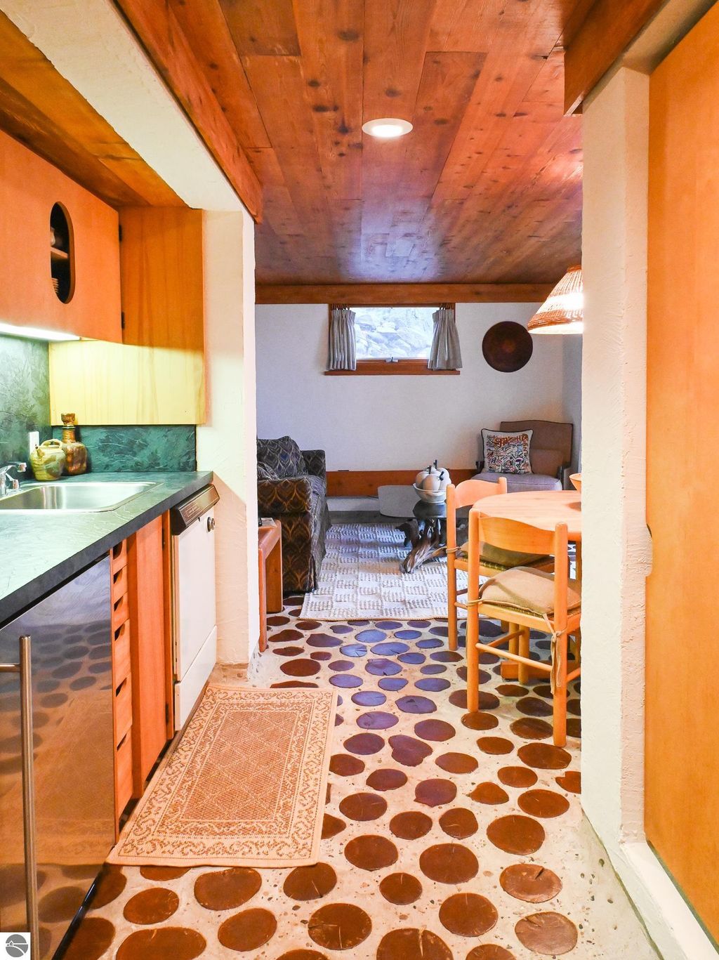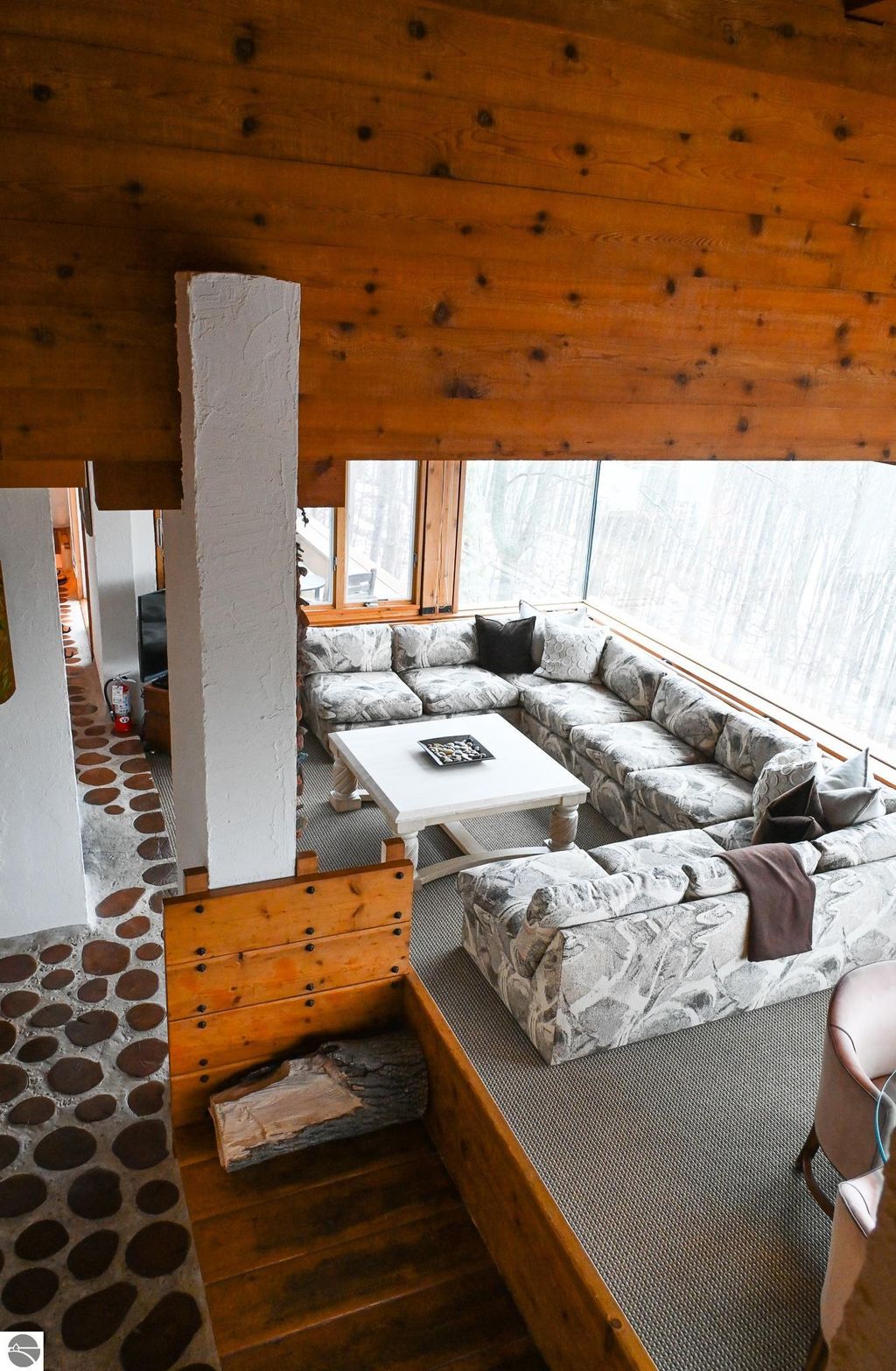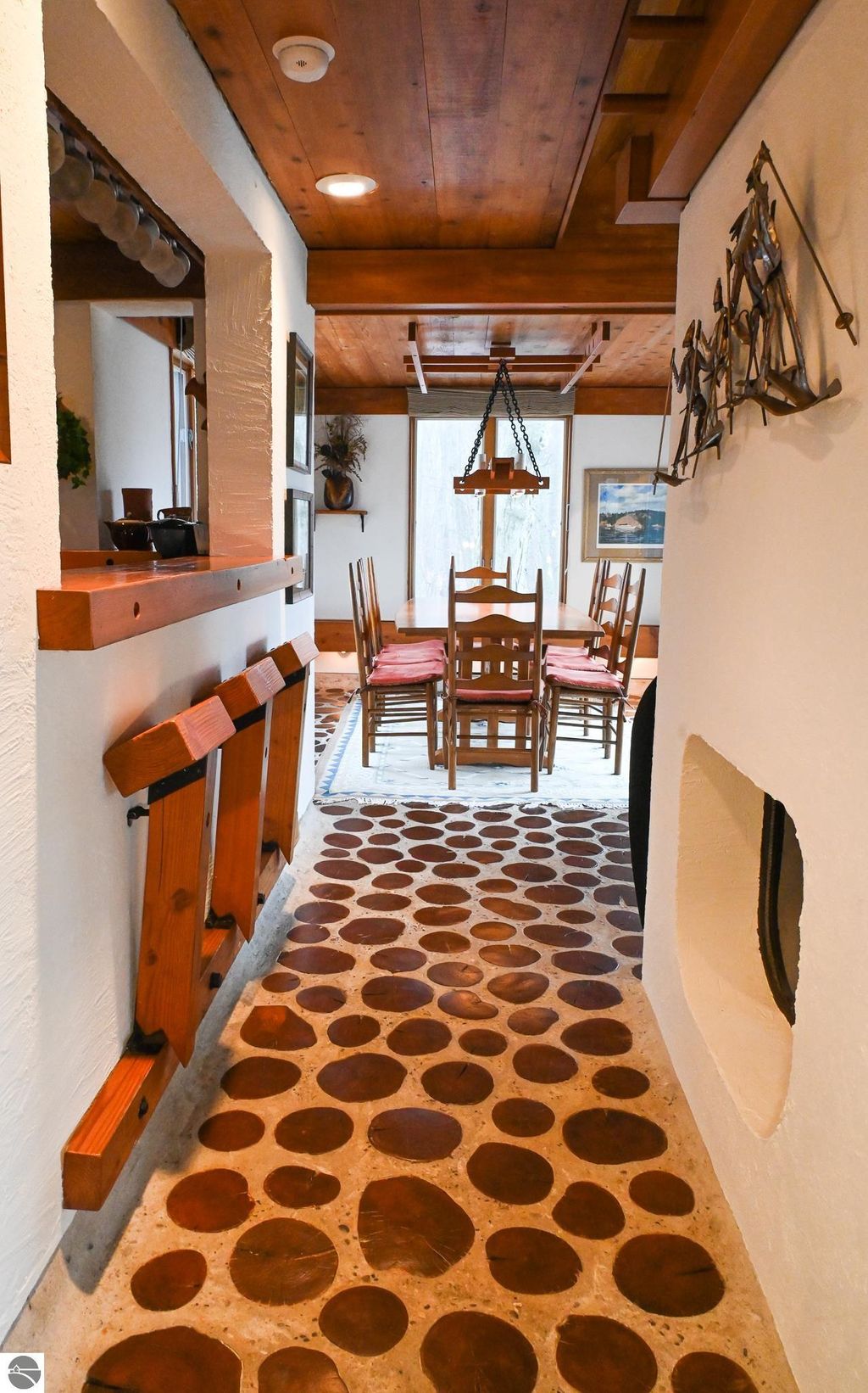 This distinctive hillside home was designed by celebrated Northern Michigan architect Roger Hummel during the formative years of Sugar Loaf, when modern architecture and outdoor recreation converged in a way rarely replicated today. Purpose-built for its setting, the home remains largely original and clearly reflective of its era. The design unfolds vertically, with multiple levels connected by sculptural stairways and intimate moments of discovery, including built-in seating, child-scale details, and unexpected vantage points throughout the home. A centrally located fireplace anchors the main living space, while original finishes and handcrafted elements preserve the character and craftsmanship of the period. The lower level includes a private entrance, kitchenette, full bath, and bedrooms, allowing for guest separation while still functioning as a single residence. A sauna, outdoor terraces, and hillside views further enhance the experience. The property directly abuts the former Sugar Loaf ski resort lands, now permanently protected and under active revitalization by the Leelanau Conservancy. The Conservancy has secured full funding to transform the 285-acre site into a year-round public natural area featuring extensive trail networks for hiking, biking, snowshoeing, and cross-country skiing, along with summit access, gathering pavilions, sledding areas, nature play spaces, and ecological restoration initiatives. This protected landscape ensures long-term continuity of open space, recreation, and viewshed immediately adjacent to the home. Short-term rental use has occurred in the surrounding area; buyers should independently verify current regulations and eligibility. This home was never intended to be generic. It offers a strong architectural foundation for thoughtful evolution while preserving an important chapter of Northern Michigan's architectural and recreational history.