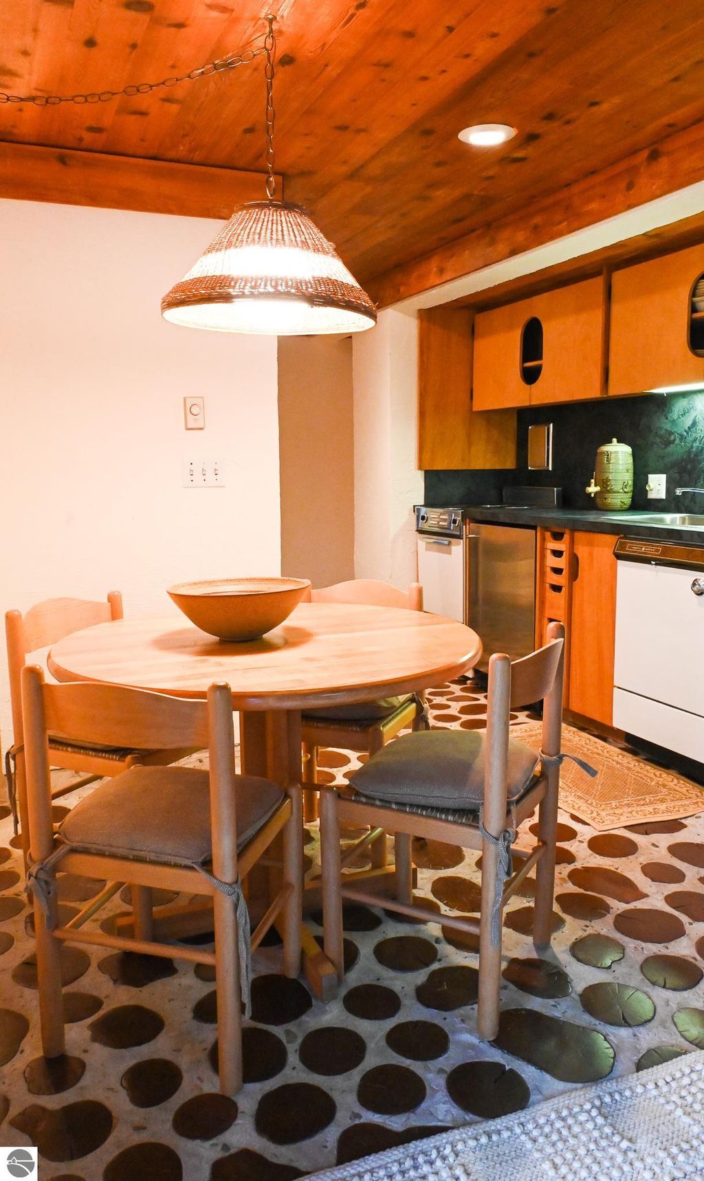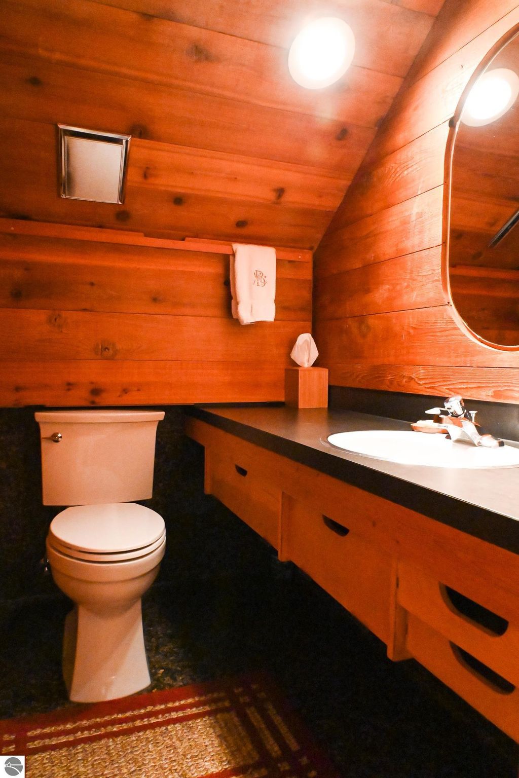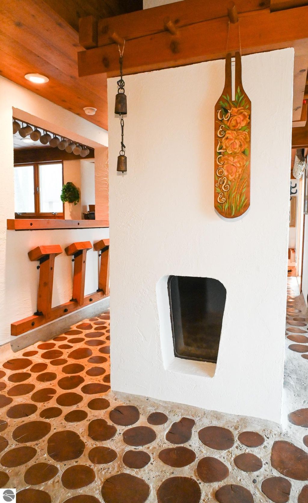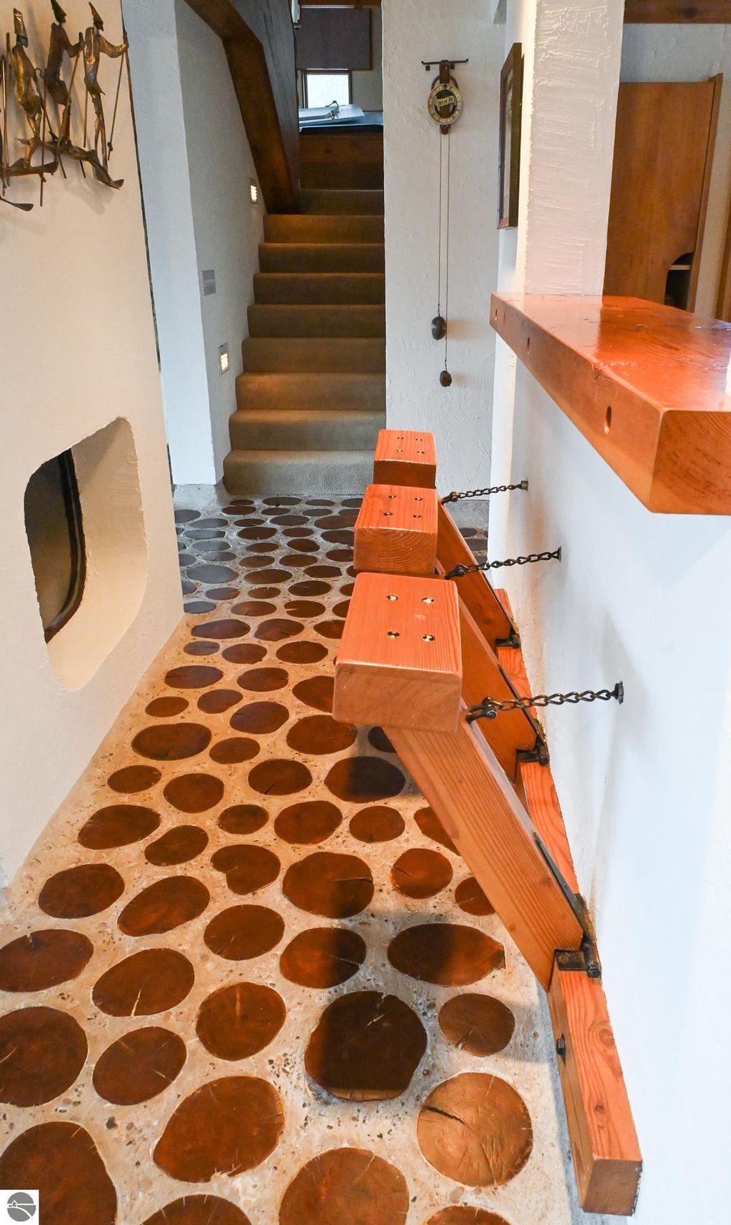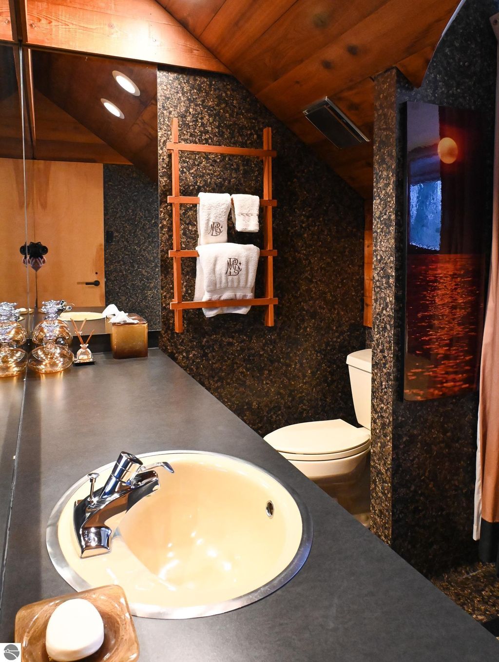 This distinctive hillside home was designed by celebrated Northern Michigan architect Roger Hummel during the formative years of Sugar Loaf, when modern architecture and outdoor recreation converged in a way rarely replicated today. Purpose-built for its setting, the home remains largely original and clearly reflective of its era. The design unfolds vertically, with multiple levels connected by sculptural stairways and intimate moments of discovery, including built-in seating, child-scale details, and unexpected vantage points throughout the home. A centrally located fireplace anchors the main living space, while original finishes and handcrafted elements preserve the character and craftsmanship of the period. The lower level includes a private entrance, kitchenette, full bath, and bedrooms, allowing for guest separation while still functioning as a single residence. A sauna, outdoor terraces, and hillside views further enhance the experience. The property directly abuts the former Sugar Loaf ski resort lands, now permanently protected and under active revitalization by the Leelanau Conservancy. The Conservancy has secured full funding to transform the 285-acre site into a year-round public natural area featuring extensive trail networks for hiking, biking, snowshoeing, and cross-country skiing, along with summit access, gathering pavilions, sledding areas, nature play spaces, and ecological restoration initiatives. This protected landscape ensures long-term continuity of open space, recreation, and viewshed immediately adjacent to the home. Short-term rental use has occurred in the surrounding area; buyers should independently verify current regulations and eligibility. This home was never intended to be generic. It offers a strong architectural foundation for thoughtful evolution while preserving an important chapter of Northern Michigan's architectural and recreational history.