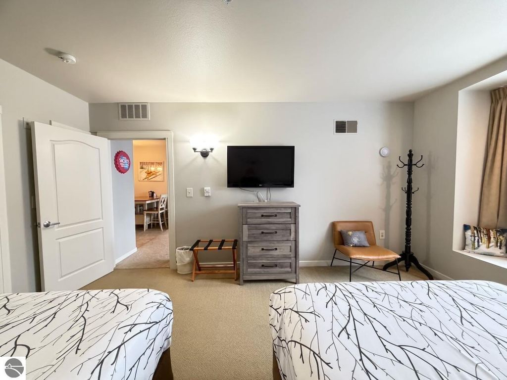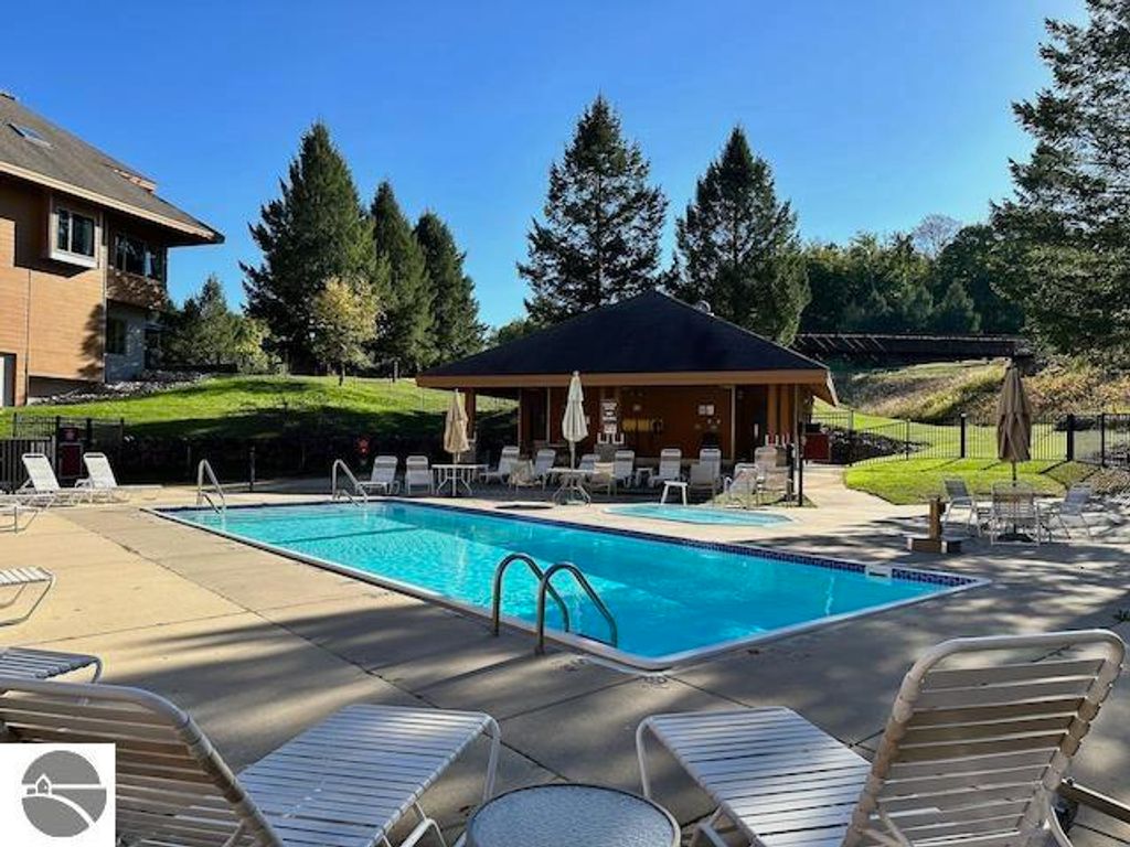 Enjoy views of the 18th hole and pond at the Lodge at Cedar River Village. This updated 1 bedroom ground floor suite enjoys lovely views and convenient access to the pool, hot tub, pro shop, ski check-in & the River Bistro, with pool tables, golf simulator, & games to entertain everyone. This will be a great getaway when you come north for golf, skiing, boating or just for relaxation! The updates include the kitchenette cabinets, dishwasher and beautiful stone surrounding the fireplace. This unit even has a full-size fridge. You will appreciate the private patio, high ceilings, & fireplace. This unit is designed to be mostly barrier free, with a low threshold shower as well as a separate bathtub with shower wand. Because of the bathroom design, there is a separate water closet at the opposite end of the room. The condo is being sold fully furnished, down to the utensils in the kitchen, so just bring your golf clubs or skis and enjoy the year-round activities offered at Shanty Creek Resort. The area offers numerous locations for dining, entertainment, shopping, watersports and more. Enjoy the resort as much as you can and put the unit in the rental program to offset your costs when you are not able to be here. This unit has a strong rental history. Dues cover all utilities, including heat, electricity, cable, internet, wifi, water, & sewer/ The only expenses you'll have are except contents insurance, taxes and housekeeping after you have stayed in the unit(when on the rental program). This will soon be your favorite getaway. Come enjoy the best of Shanty Creek Resort and northern Michigan!