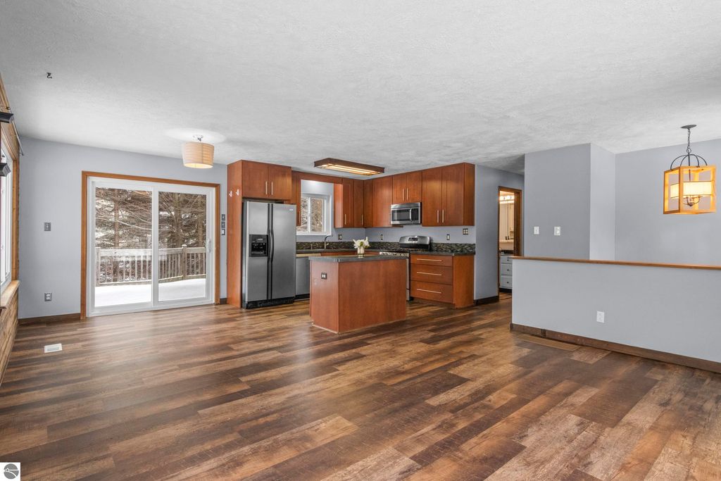 Bi-level home in a popular subdivision with shared access to a Torch Lake park. This 3-bedroom, 2-bath home features an open main-level floor plan with an open kitchen and island, dining area, and living room filled with natural light from large newer windows. The dining area opens to a deck, while the lower level offers a spacious family room with a newer slider leading to a covered patio. Additional features include a large 2-car garage with workbench, garden/storage shed, landscaped corner lot with underground sprinklers, and a paved circular driveway.