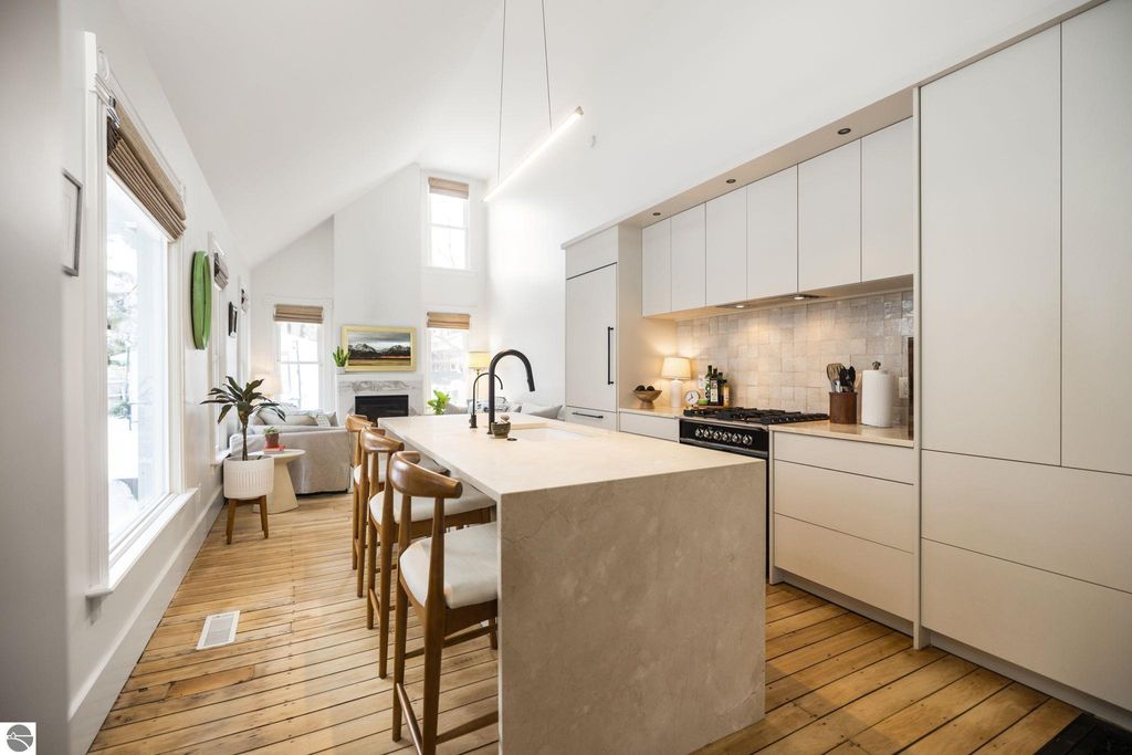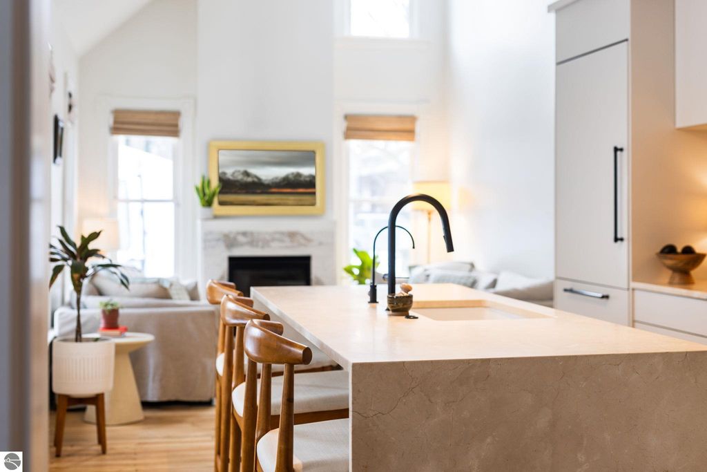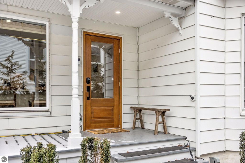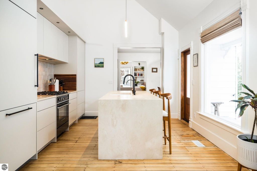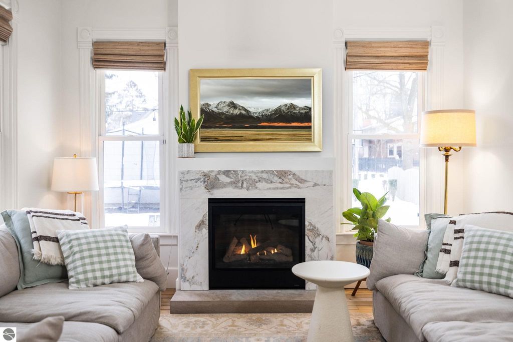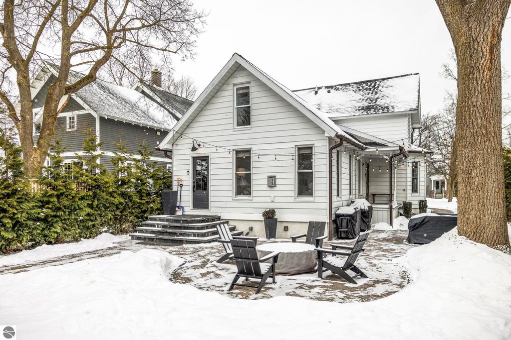 A rare offering in the Central Neighborhood, 507 Fifth Street combines period character with the confidence of a full, down-to-the-studs renovation completed in 2021. Set on a tree-lined block in one of Traverse City's most walkable and architecturally rich areas, this 4-bedroom, 2.5-bath Modern Victorian delivers historic charm alongside modern amenities. Originally configured as a duplex, the home was thoughtfully restructured to restore true single-family flow, including a main-floor primary suite and a vaulted, open kitchen and living area filled with natural light and a gas fireplace. Original wide-plank pine floors were restored, historic millwork and hardware preserved, and high-end finishes selected throughout, including designer light fixtures, marble counter tops, Fisher & Paykel appliances, and custom built-ins. The exterior has also been fully reimagined with redesigned hardscape and landscaping, featuring a herringbone paver patio, cedar fencing, copper gutters, mature arborvitae plantings for privacy, and built-in gas lines supplying an outdoor fireplace and grill area. A recently replaced roof enhances both curb appeal and durability, offering added value for years to come. Significant investment has also been made in the home's long-term health and reliability. Updates include modern mechanical systems such as a new furnace, A/C, whole-house water filtration with reverse osmosis, and a proactive maintenance approach with regularly cleaned HVAC vents and routine sewer lateral servicing. With flexible living areas, including a bonus playroom, and a location just blocks from downtown, West End Beach, local schools, parks, and the Boardman Lake Trail, 507 Fifth Street offers a rare opportunity to own a truly turn-key home in one of Traverse City's most established neighborhoods.