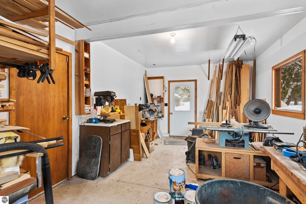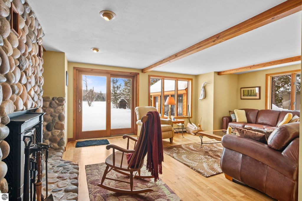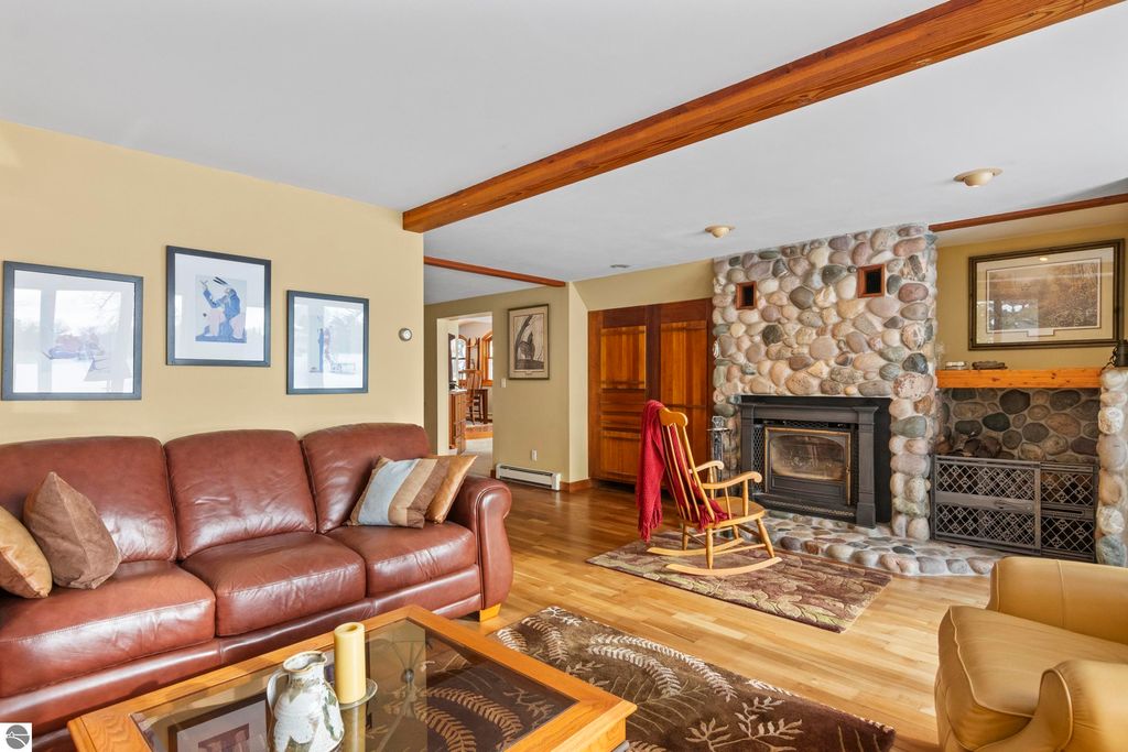 Enjoy no-wake lakefront living on Bellows Lake in this well-maintained 3-bedroom, 2-bath home showcasing quality craftsmanship throughout. Features include an updated eat-in kitchen with island, spacious living and family rooms with stone fireplace, walk-in closets, and built-in speakers in the living room, plus a new roof (2022) for added peace of mind. Outdoor living includes a screened-in porch and deck overlooking the water. Property highlights include an oversized insulated garage with workshop, upper-level overflow room with ceiling fan, 8'x10' lakeside storage shed, additional outbuildings"”all with electricity"”and a private dock. The home sits on .43 acres and is combined with additional parcels totaling approximately 2 acres with 64 feet of private lake frontage, accessed by a well-maintained gravel road, making it ideal as a year-round residence or an Up North retreat.