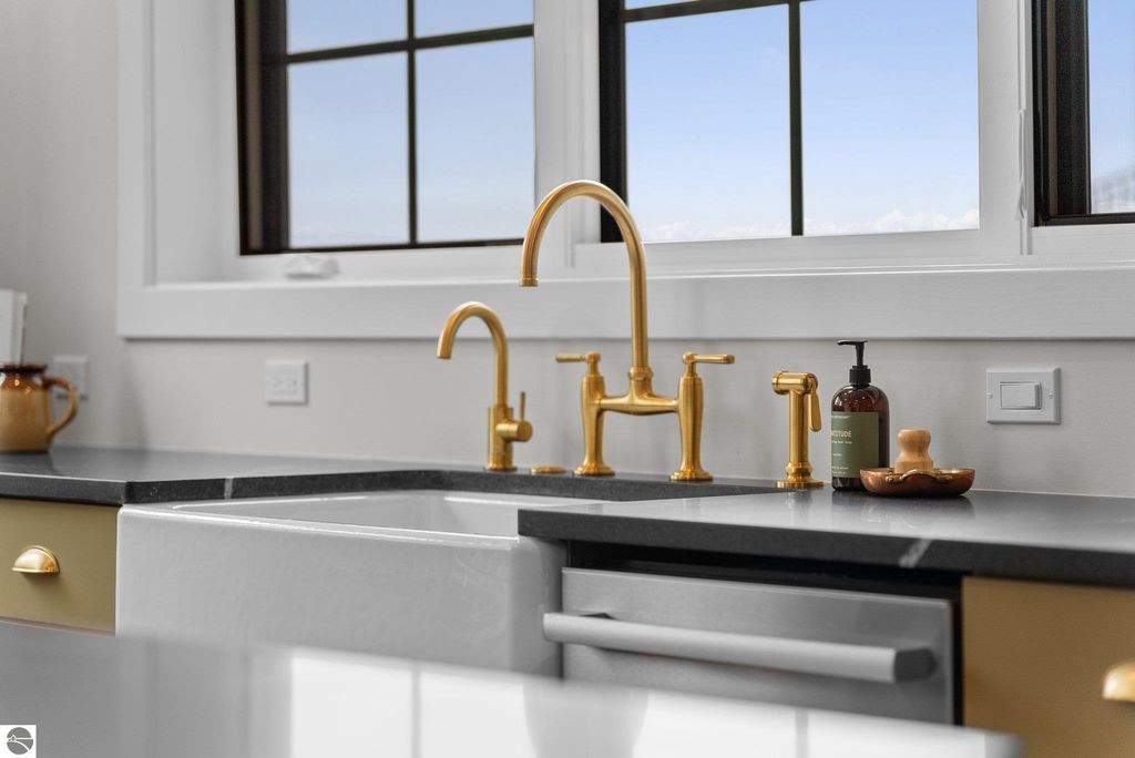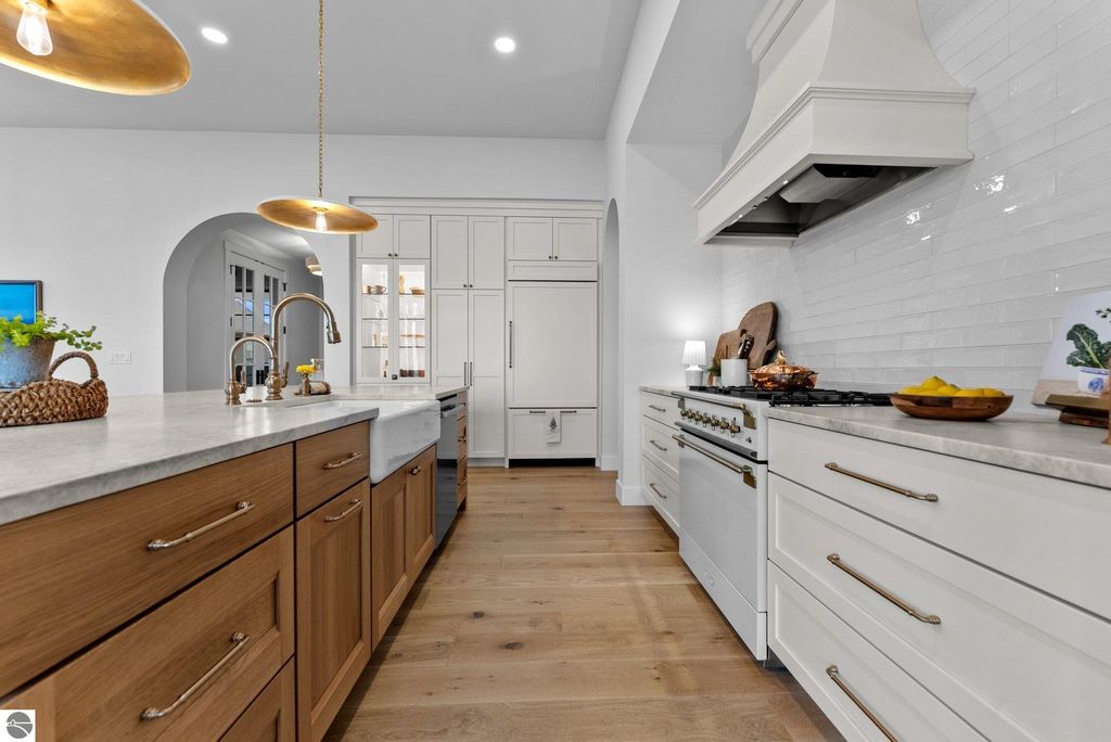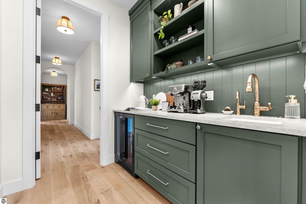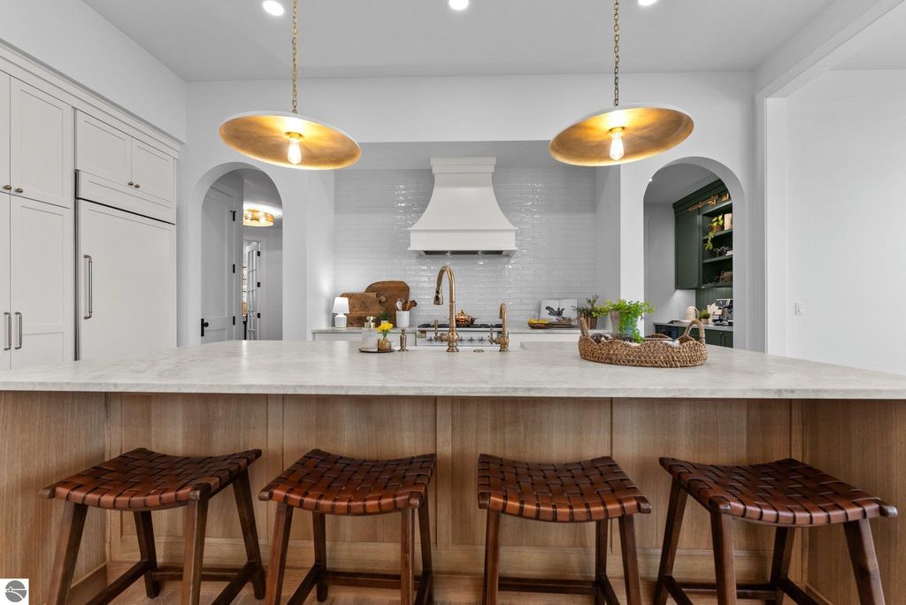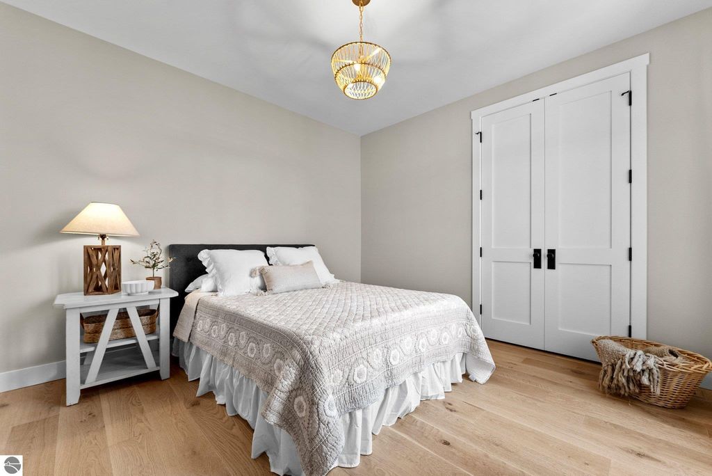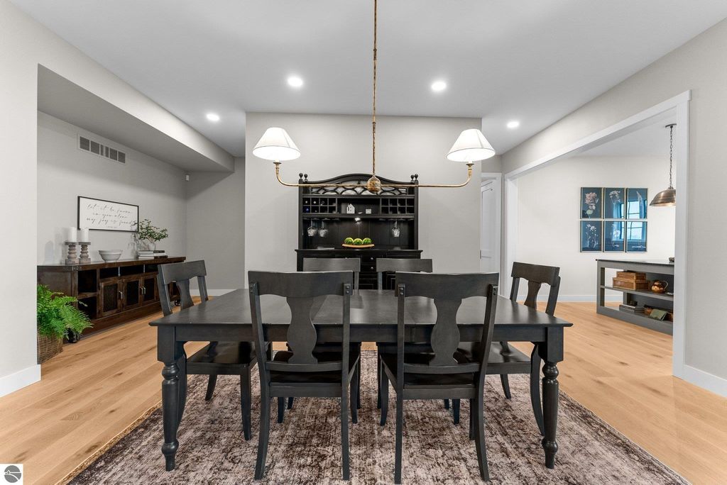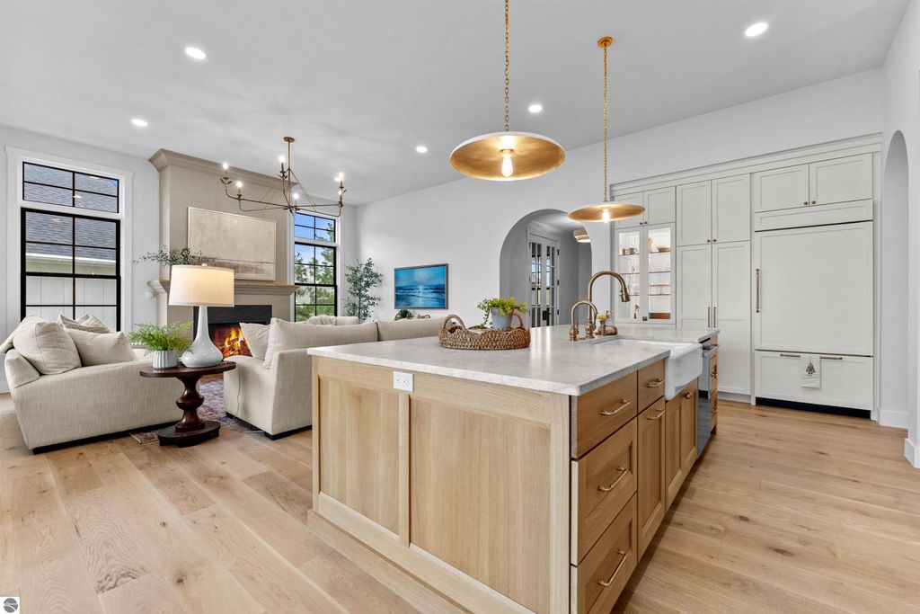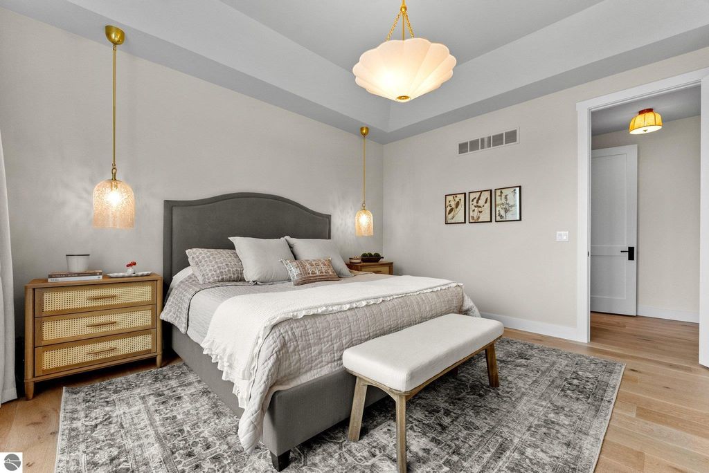 Welcome to this exquisite custom-built home in the heart of Traverse City, where exceptional craftsmanship meets breathtaking beauty. Spanning over 4700 square feet, this 5-bedroom, 4-bathroom home is a masterpiece of incredible design and detail. Every area that could be unique and custom has been touched with this custom build. From the moment you enter, you will be captivated by the attention to detail with arched entryways and hallways, rich solid wood floors, and thoughtfully designed living spaces. The sitting room off of the front foyer with a magical fireplace and sitting area are sure to be a favorite for a new family. Enjoy the ease of elegance with 2 full kitchens-one on the main level and another one on the lower level-ideal and specifically designed for entertaining or multigenerational living space. The custom cabinetry, coffee bar, and butlers pantry provide both style and function. High ceilings and designer plumbing fixtures elevate the home's luxurious feel, while three fireplaces add to the warmth and charm. Step outside to take in the sweeping views of West Bay-from the Wednesday night sailboat races to the air shows and fireworks, every season offers a spectacular show. Relax on the covered deck, gather around the fire-pit or the lower level patio and simply enjoy the serene location. The path to the TART trail is steps away and makes getting to the water easy from this home. This is truly a rare find-beautiful, functional, and crafted with meticulous attention to detail. Experience the magic of Northern Michigan living in a home that's nothing short of extraordinary.