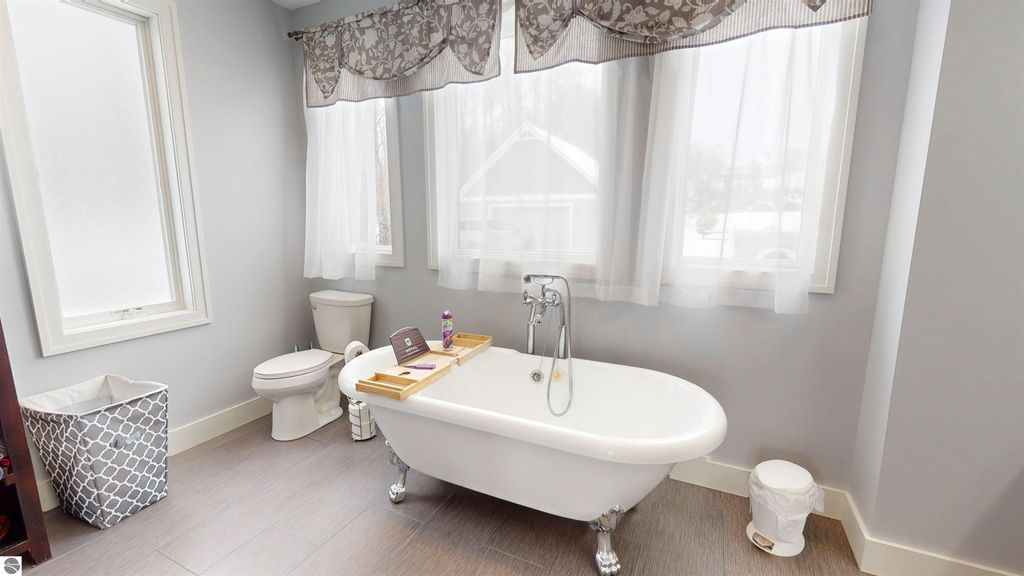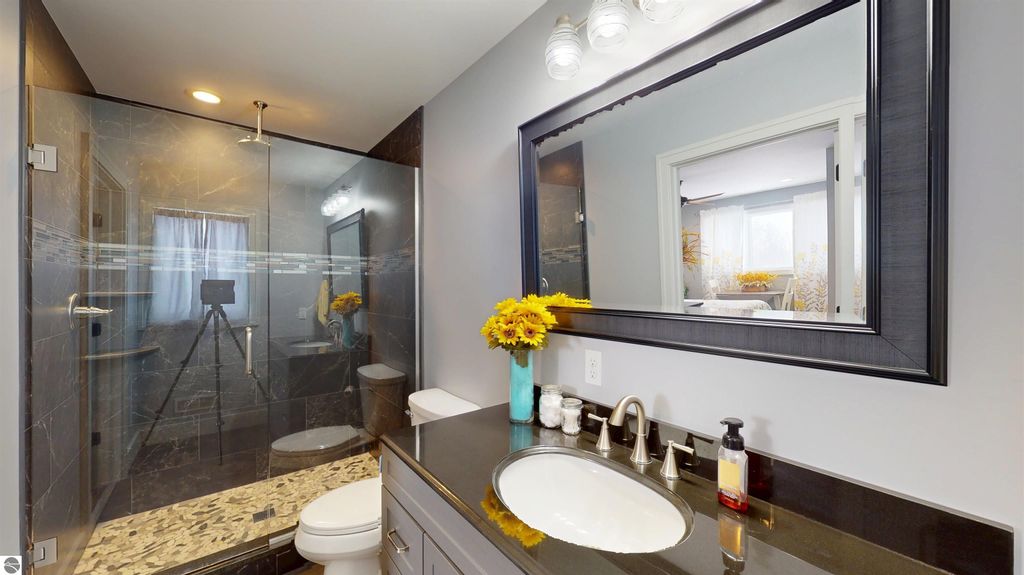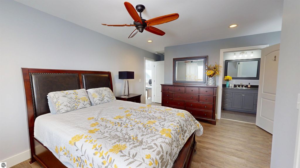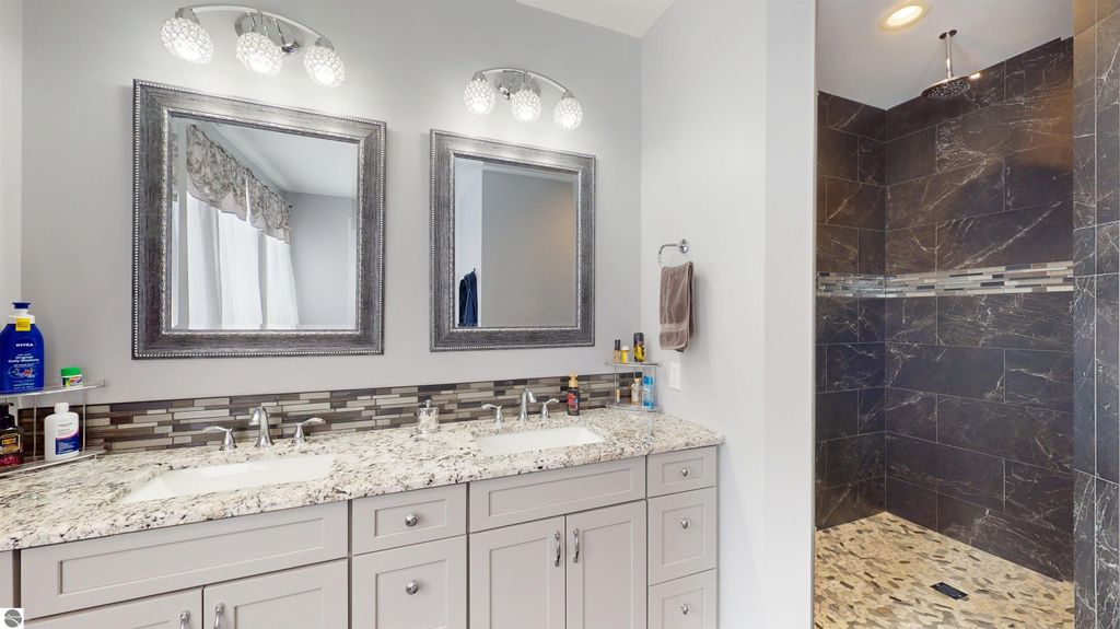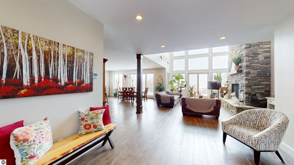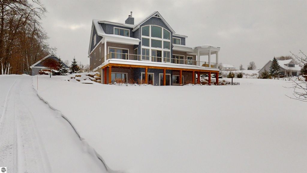 Experience unparalleled luxury in this custom built masterpiece that includes 100' of Lake Charlevoix frontage. Designed for entertaining, this home boasts 4 private ensuites and a sophisticated, open-concept layout. Anchored by the natural stone fireplace, the main level features soaring ceilings and expansive windows that frame breathtaking views. Gourmet main kitchen offers high-end appliances, walk-in pantry and snack bar seating. Enjoy dining or relaxing on the oversized deck, accessible from every room. Lower level oasis has a full kitchen, living room with fireplace, family room and private ensuite. Massive 3 car attached garage plus detached garage allow for plenty of storage. Enjoy the best of Northern Michigan living in this exceptional custom home with Lake Charlevoix frontage!