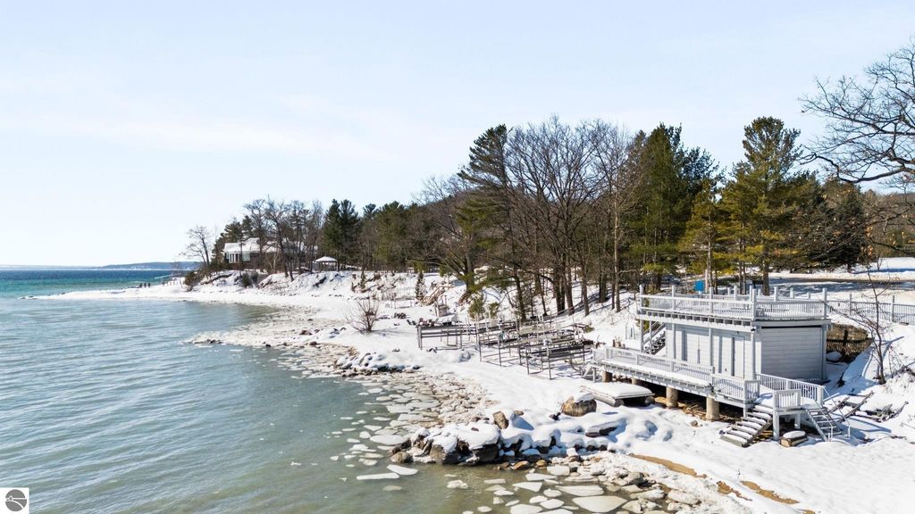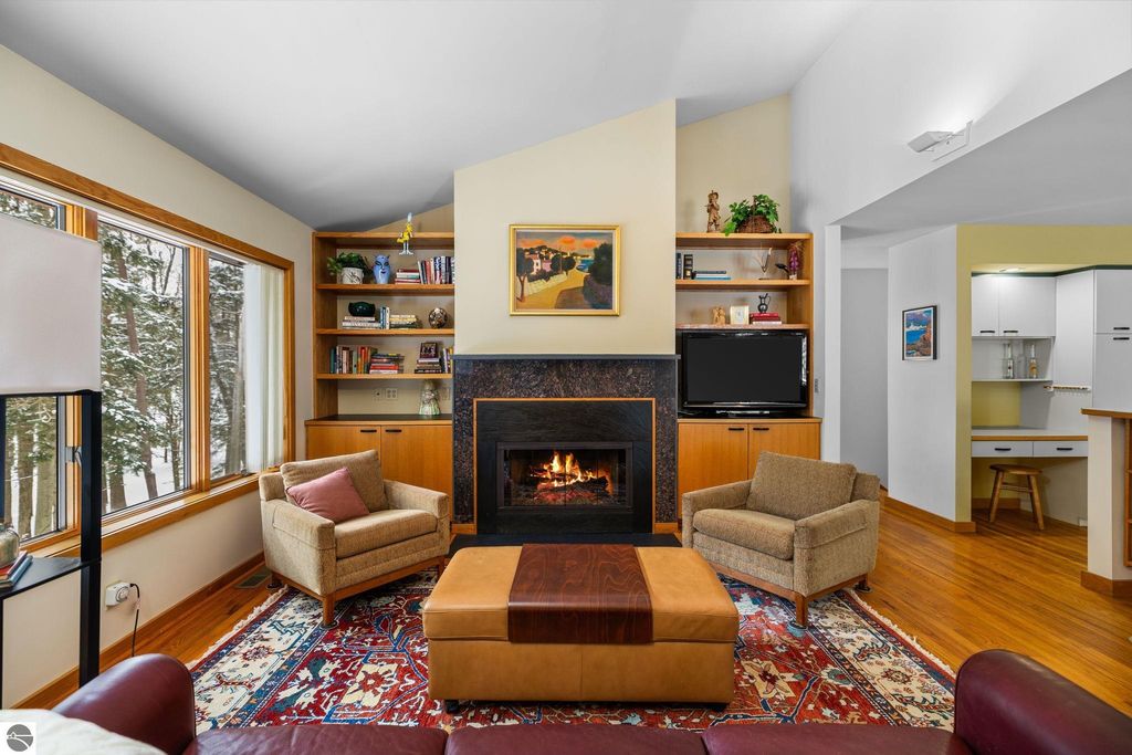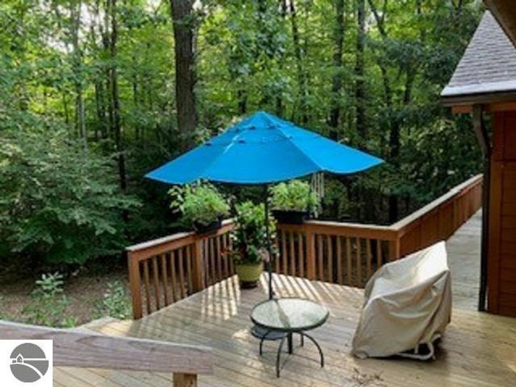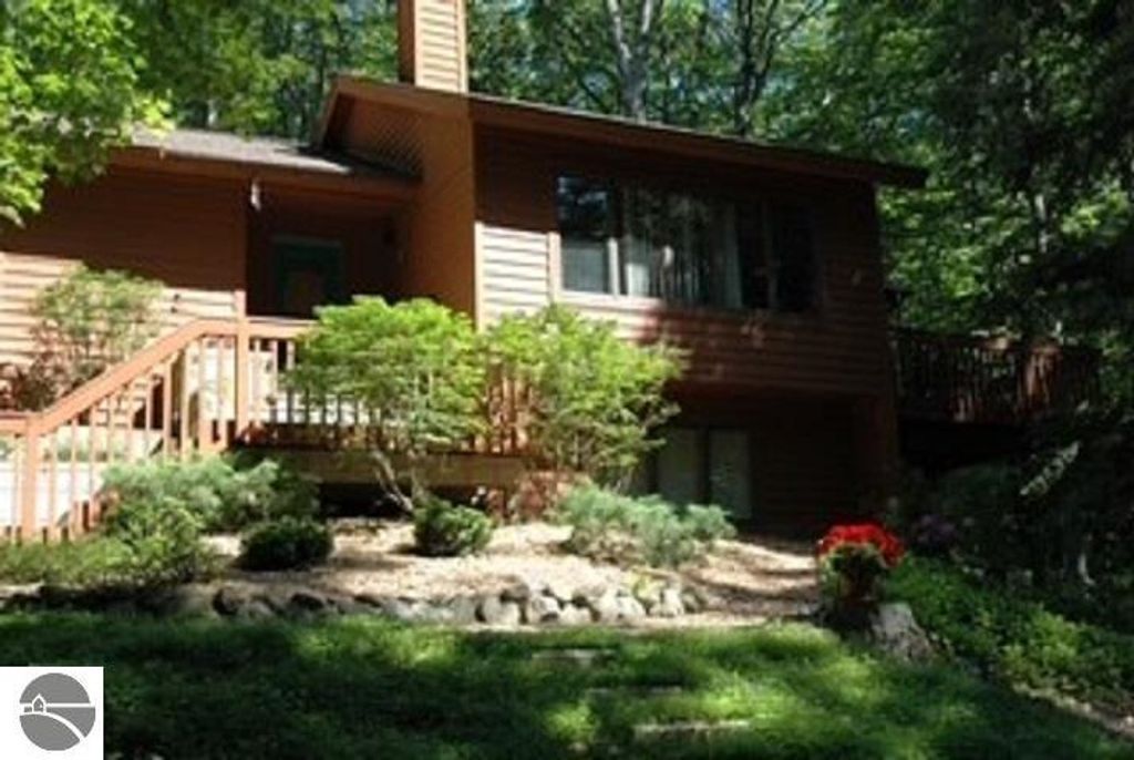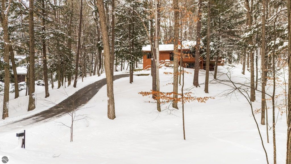Designed by renowned architect Brad Wheeler, this thoughtfully crafted home is quietly tucked within The Bluffs, one of the most sought-after neighborhoods on the Old Mission Peninsula. Set on over an acre of private, wooded land, the home offers a rare blend of architectural integrity, natural beauty, and access to East Grand Traverse Bay. The main level is welcoming and expansive, featuring a light-filled living room with vaulted ceilings, hardwood floors, a gas fireplace, and oversized picture windows that frame the private landscape. Two bedrooms and two bathrooms on the main floor allow for comfortable main floor living, while the lower level provides a third bedroom, full bath, and a generous family room - ideal for guests, recreation, or a home office. Residents of The Bluffs enjoy approximately 1000 feet of shared frontage on East Grand Traverse Bay, with a community dock, the ability to have a boat on a lift, along with access to tennis and pickleball courts, private walking trails, and a neighborhood playground. All of this is just minutes from downtown Traverse City, and surrounded by wineries, beaches, and scenic charm that define the Old Mission Peninsula lifestyle. This is a timeless Northern Michigan home - architecturally significant, peacefully private, and exceptionally well located. The home was recently appraised at $817,000.