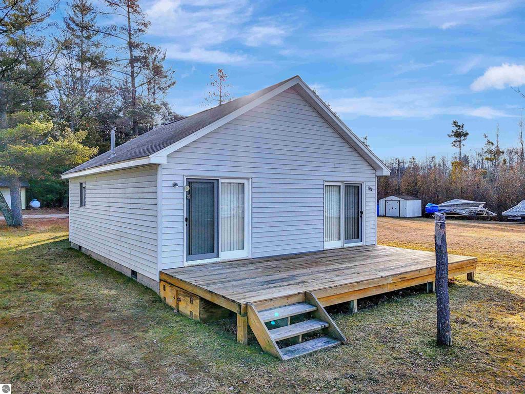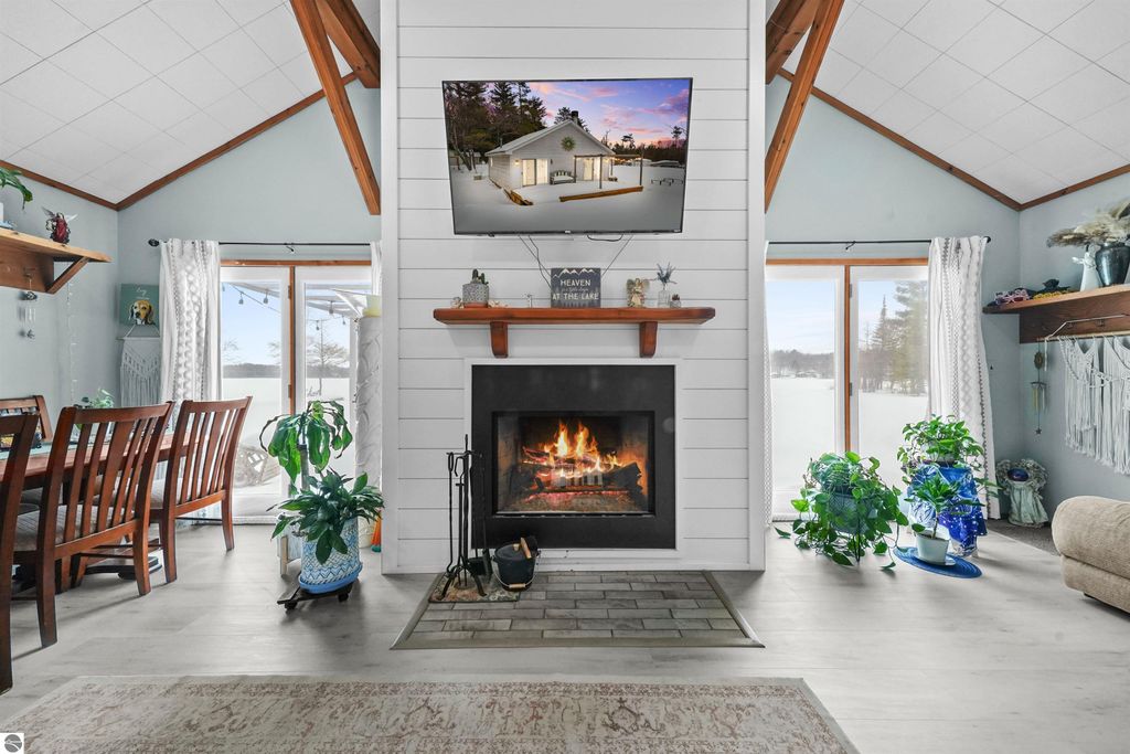 Set along the peaceful shores of Dyer Lake, this charming three-bedroom, one-bath cottage offers a relaxing lakeside retreat on a 125-acre private all-sports lake. Enjoy 43 feet of sandy-bottom frontage with beautiful views and direct access for swimming, fishing, and boating. Recent updates include Generac whole house generator, a brand-new fireplace, several new windows and flooring, under-crawlspace insulation, electrical panel, garage remoter, and new toilet. The spacious living room features lake views and a cozy layout, while a lofted third non-conforming bedroom adds extra charm and flexibility. An attached one-car garage provides convenient storage for lake gear or a small boat. Located at the end of a well-maintained private road, this property offers privacy, year-round access, and the perfect up-north lake escape.