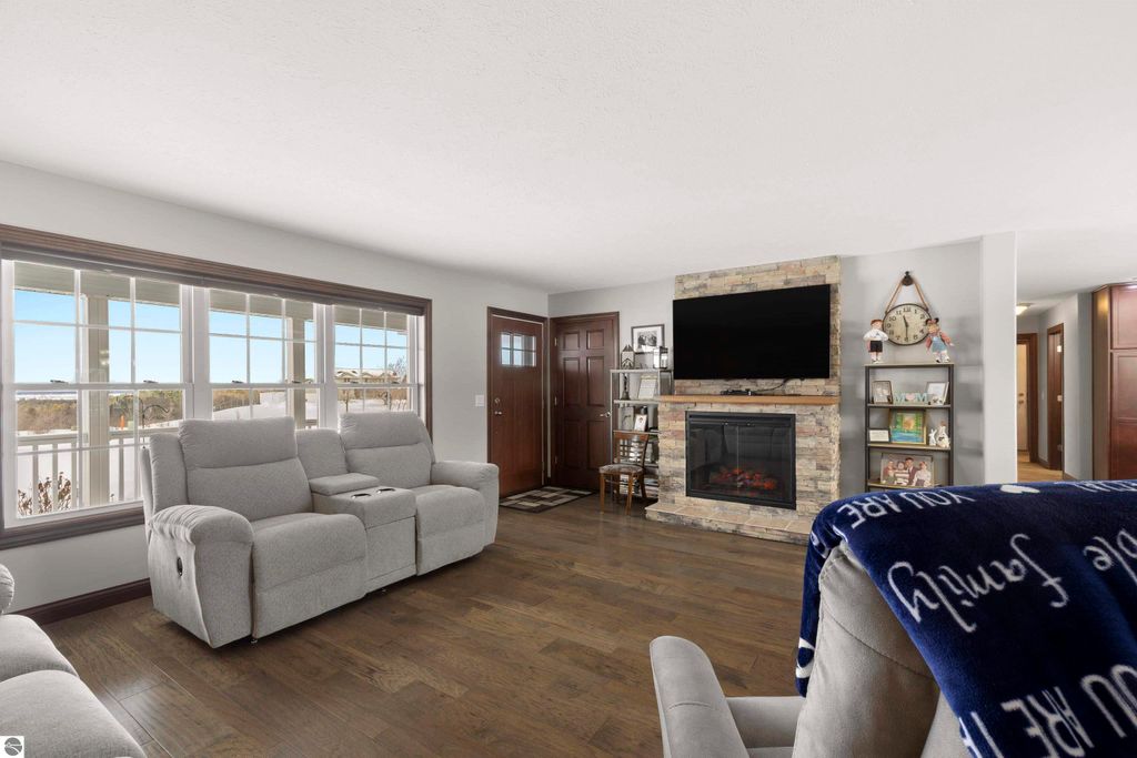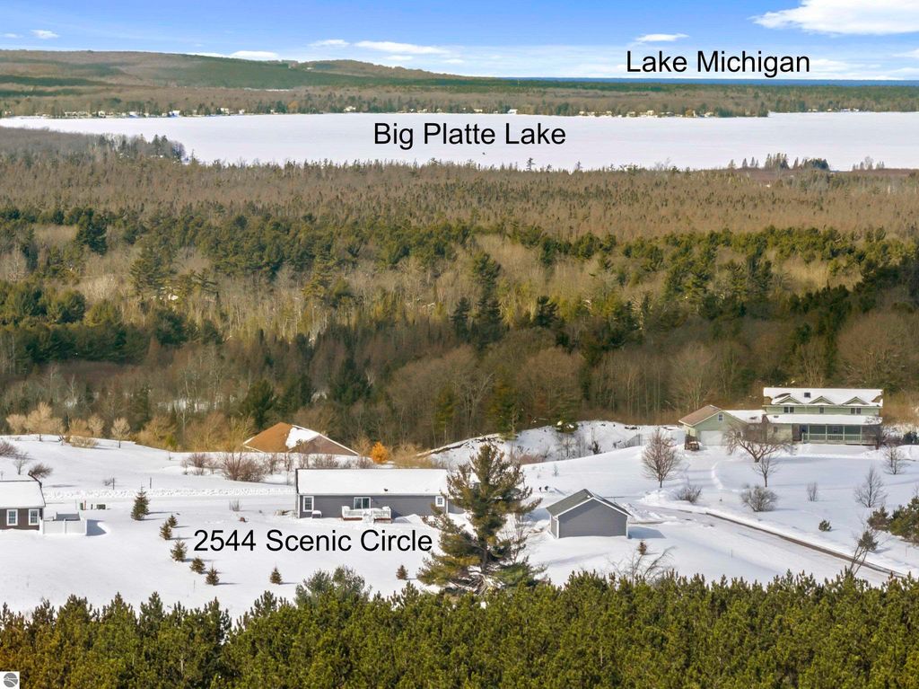 Overlooking Big and Little Platte Lakes, this home is part of the development known as Honor Highlands. A quaint and private setting that is close to local rivers, lakes, Sleeping Bear Dunes, golf courses, skiing and more. 4 bedroom/ 2 bath ranch styled home with large master bedroom, walk in closet, over sized tub and tiled shower with massaging shower heads. Open kitchen and dinning with a 18 x 12 deck off the back for family dining and grilling. Large living room that overlooks the lakes and surrounding area with a covered porch to enjoy during the 3 seasons. Full basement with 26 x 14 family room, large walk in closet, 4th bedroom,14 x 7 finished office and work shop. A second Detached 26 x28 garage with poured concrete driveway for all your toys or treasures. The yard is professionally landscaped with irrigation and a generic generator for back up. Privacy with walking trails on village property but conveniently located. A home that is impeccable and move in ready