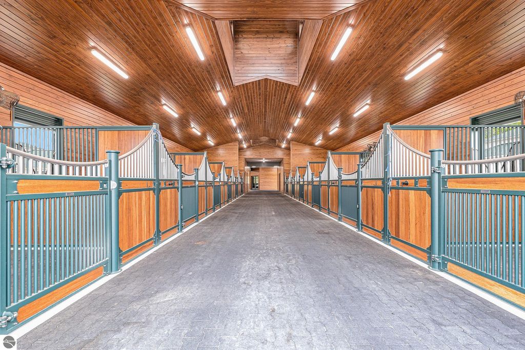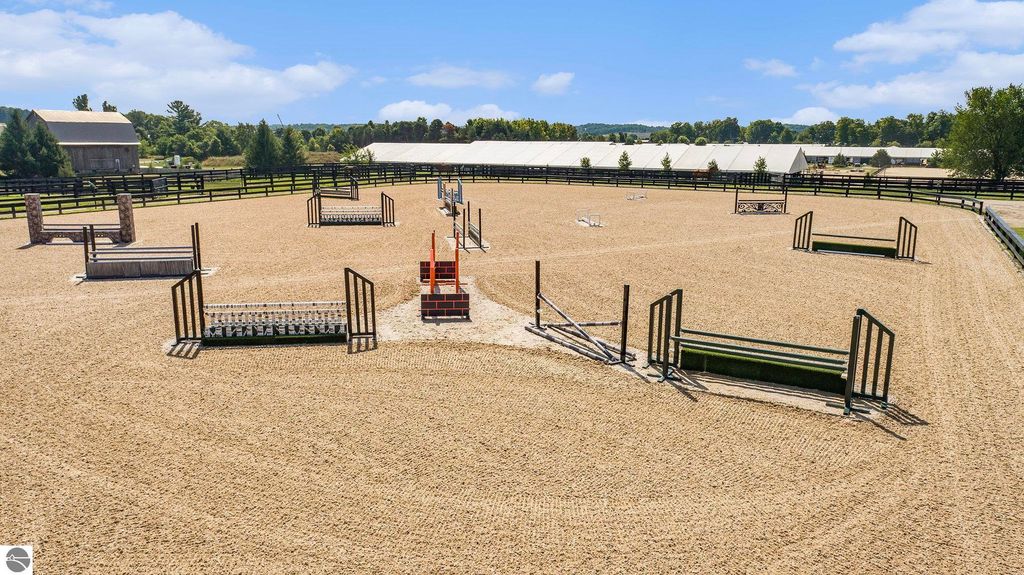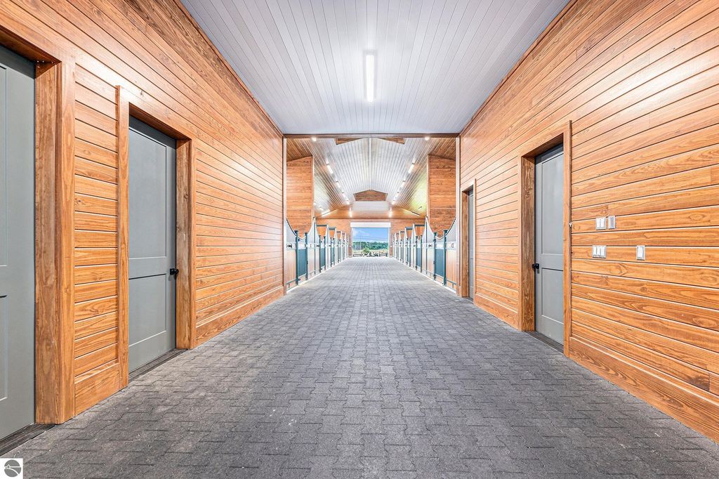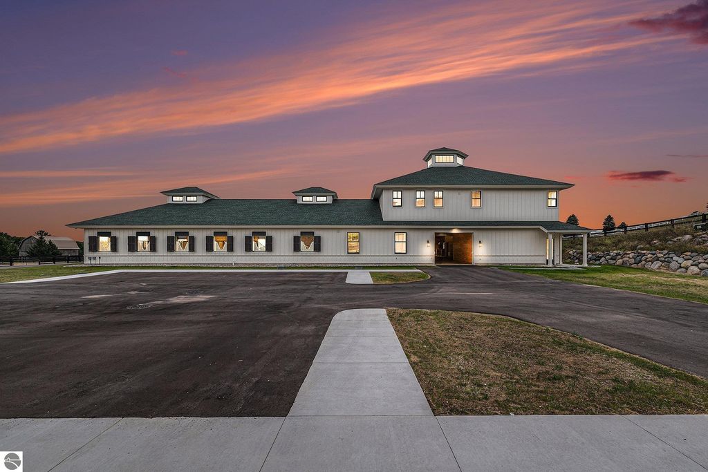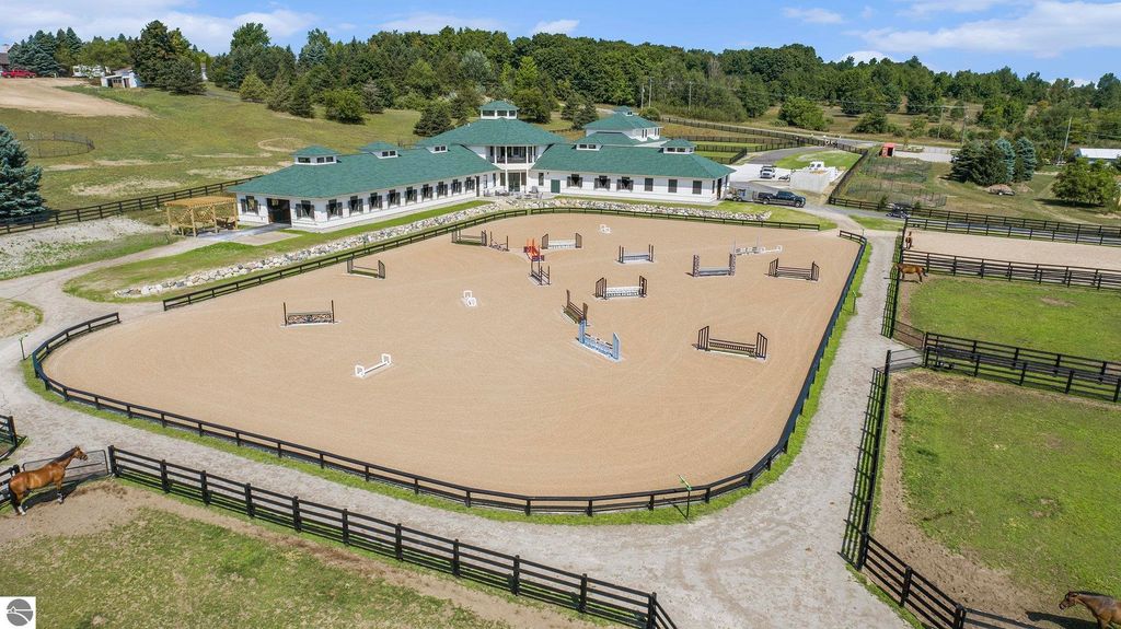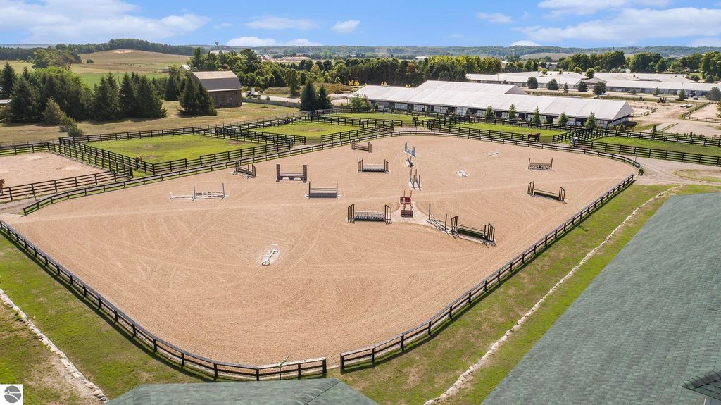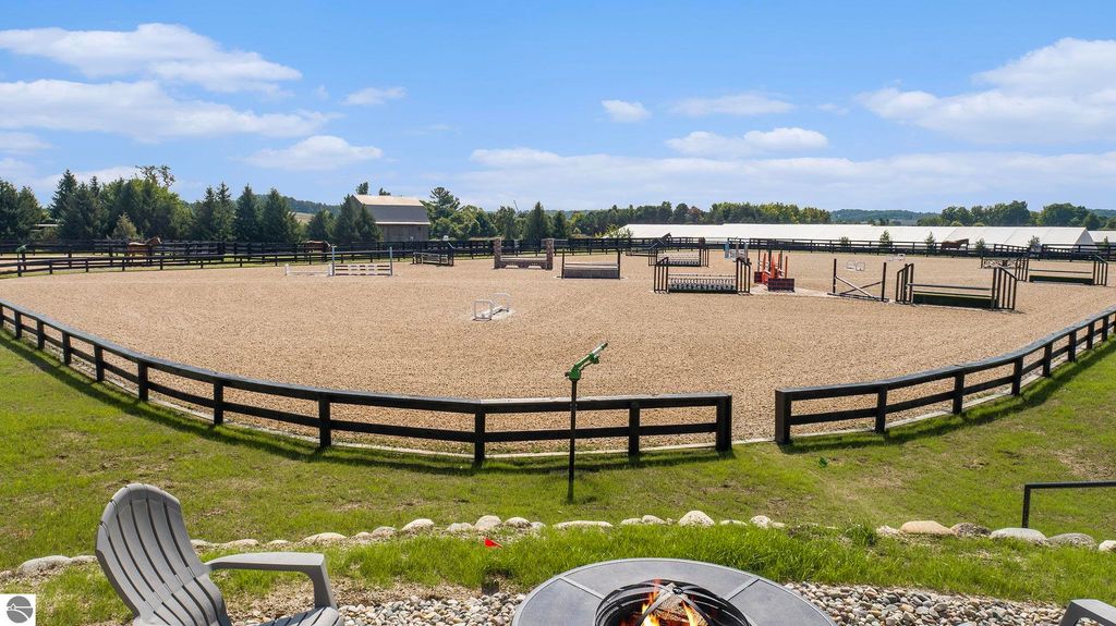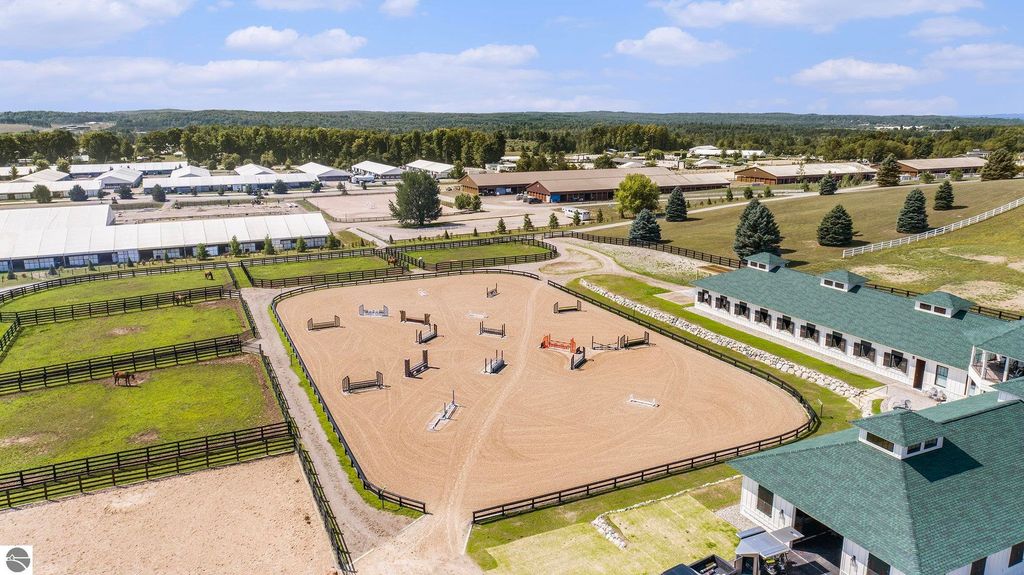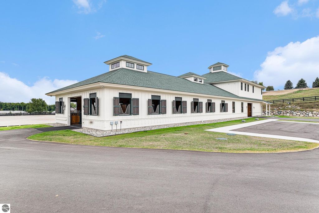 Pinecone Farm is a luxurious 6-acre gated equestrian estate located adjacent to Flintfields Horse Park, home of the Traverse City Horse Shows. Completed in 2024 with no expense spared, the property was nationally recognized in the Best in American Living Awards for Best Accessory Dwelling Unit"”highlighting the exceptional quality and thoughtful design throughout. Designed by equestrians for functionality and comfort, the 11,875 sq ft main barn features 24 BarnWalker stalls with bamboo walls, stainless top rails, and individual water fillers. The stalls are divided into two wings, each with its own tack room and storage"”ideal for private use or rental. The barn includes 4 wash stalls, 4 grooming stalls, custom cabinetry, a spacious viewing lounge with half bath, bar area, refrigerator, and covered porch. Additional amenities include a laundry/break room, integrated tack storage, and hay/feed rooms with exterior access. Above the main barn is a private 4-bedroom, 3.5-bath owner's residence with a private elevator and dumbwaiter. Enjoy panoramic views over the riding ring and countryside from the primary suite and covered viewing deck. The auxiliary barn offers 4-bedroom, 2-bath staff accommodations, extra-height garage doors for RVs, a golf cart charging wall, and wiring for temporary stalls. Outside amenities include a 250'x150' GeoFiber riding ring, GeoFiber longeing ring, irrigated paddocks with underground drainage, and 2 RV hookups. The property features two gated entrances from Brackett Road and Arabian Lane, plus an additional gate for horse and golf cart access to the showgrounds. This is a rare opportunity to own a turnkey, award-winning equestrian property in one of the country's top show destinations.