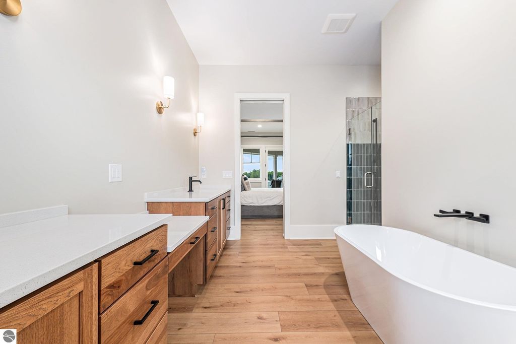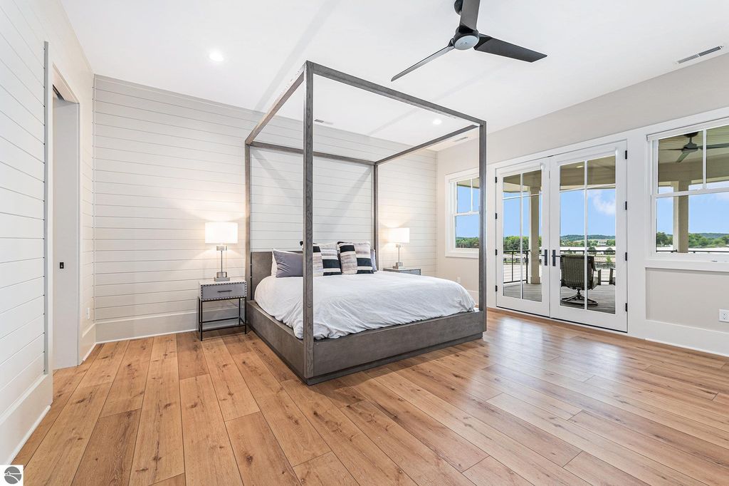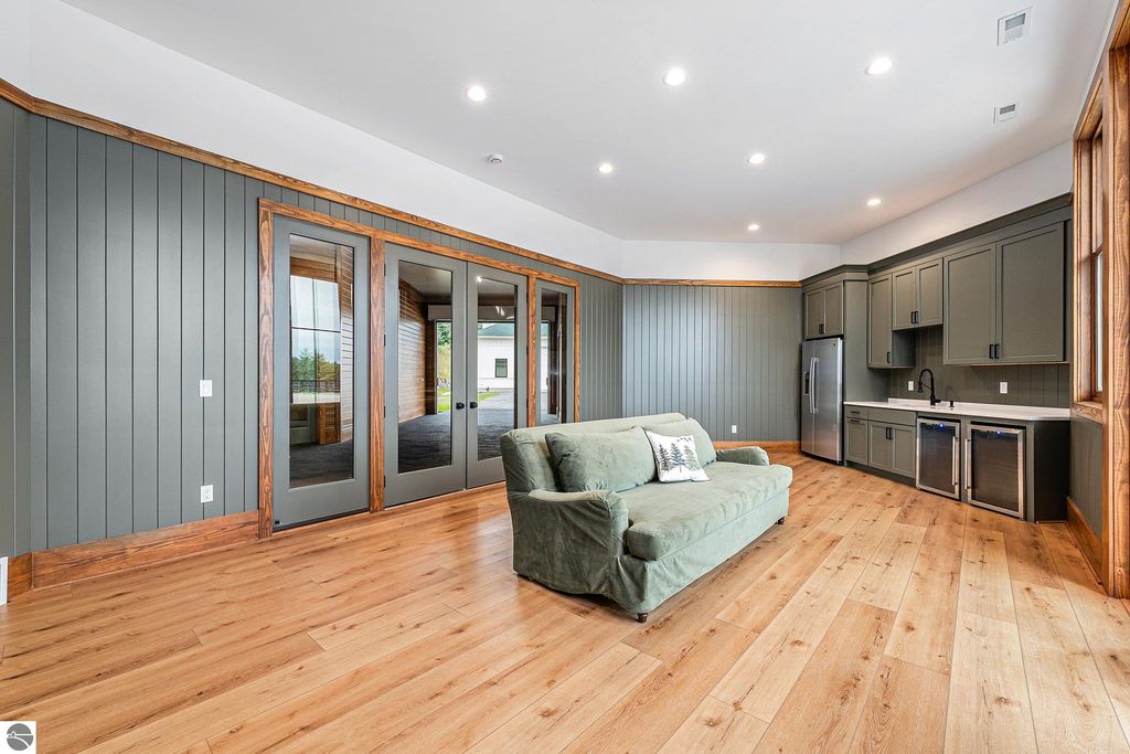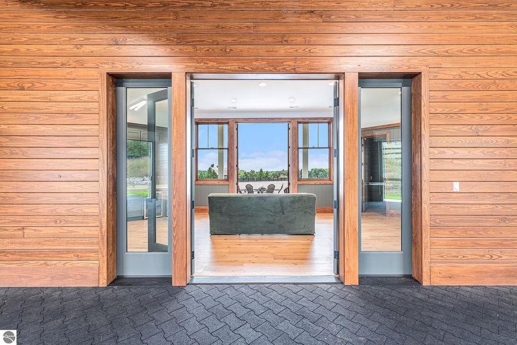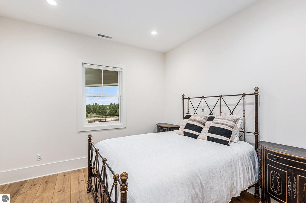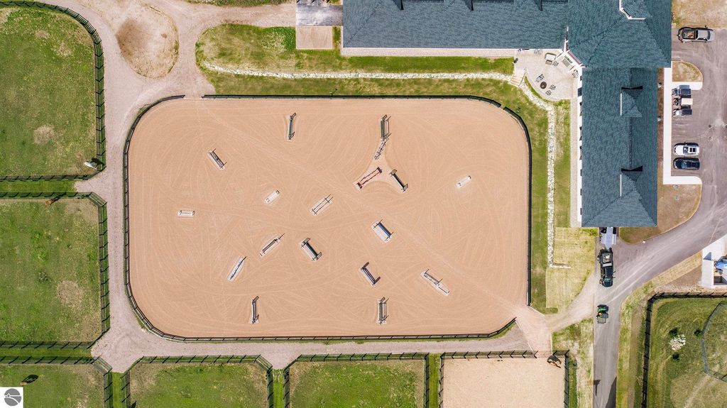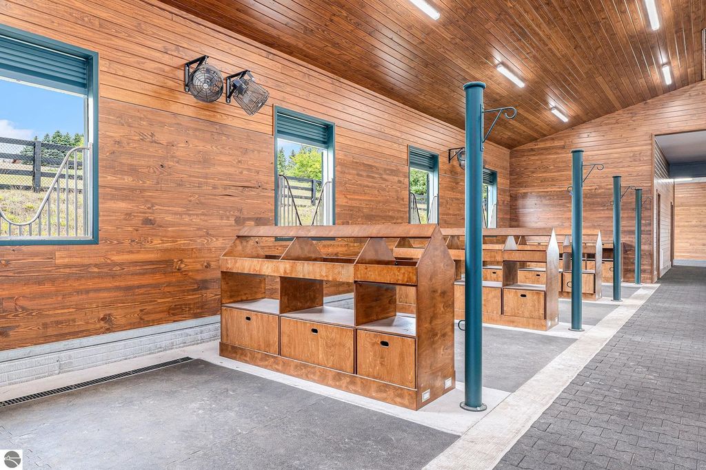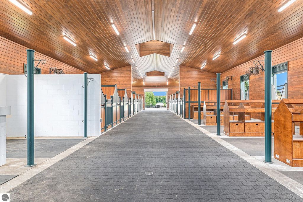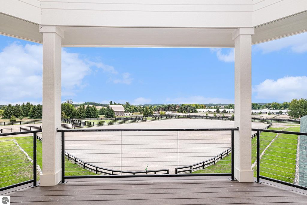 Pinecone Farm is a luxurious 6-acre gated equestrian estate located adjacent to Flintfields Horse Park, home of the Traverse City Horse Shows. Completed in 2024 with no expense spared, the property was nationally recognized in the Best in American Living Awards for Best Accessory Dwelling Unit"”highlighting the exceptional quality and thoughtful design throughout. Designed by equestrians for functionality and comfort, the 11,875 sq ft main barn features 24 BarnWalker stalls with bamboo walls, stainless top rails, and individual water fillers. The stalls are divided into two wings, each with its own tack room and storage"”ideal for private use or rental. The barn includes 4 wash stalls, 4 grooming stalls, custom cabinetry, a spacious viewing lounge with half bath, bar area, refrigerator, and covered porch. Additional amenities include a laundry/break room, integrated tack storage, and hay/feed rooms with exterior access. Above the main barn is a private 4-bedroom, 3.5-bath owner's residence with a private elevator and dumbwaiter. Enjoy panoramic views over the riding ring and countryside from the primary suite and covered viewing deck. The auxiliary barn offers 4-bedroom, 2-bath staff accommodations, extra-height garage doors for RVs, a golf cart charging wall, and wiring for temporary stalls. Outside amenities include a 250'x150' GeoFiber riding ring, GeoFiber longeing ring, irrigated paddocks with underground drainage, and 2 RV hookups. The property features two gated entrances from Brackett Road and Arabian Lane, plus an additional gate for horse and golf cart access to the showgrounds. This is a rare opportunity to own a turnkey, award-winning equestrian property in one of the country's top show destinations.