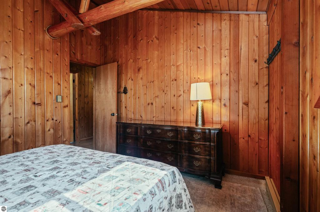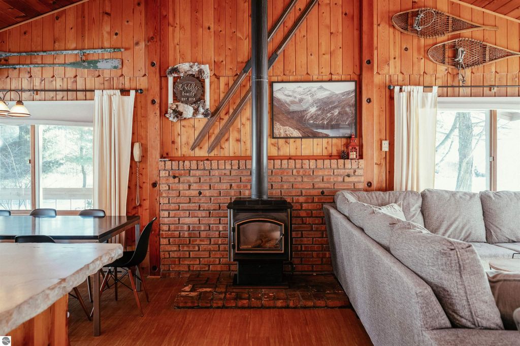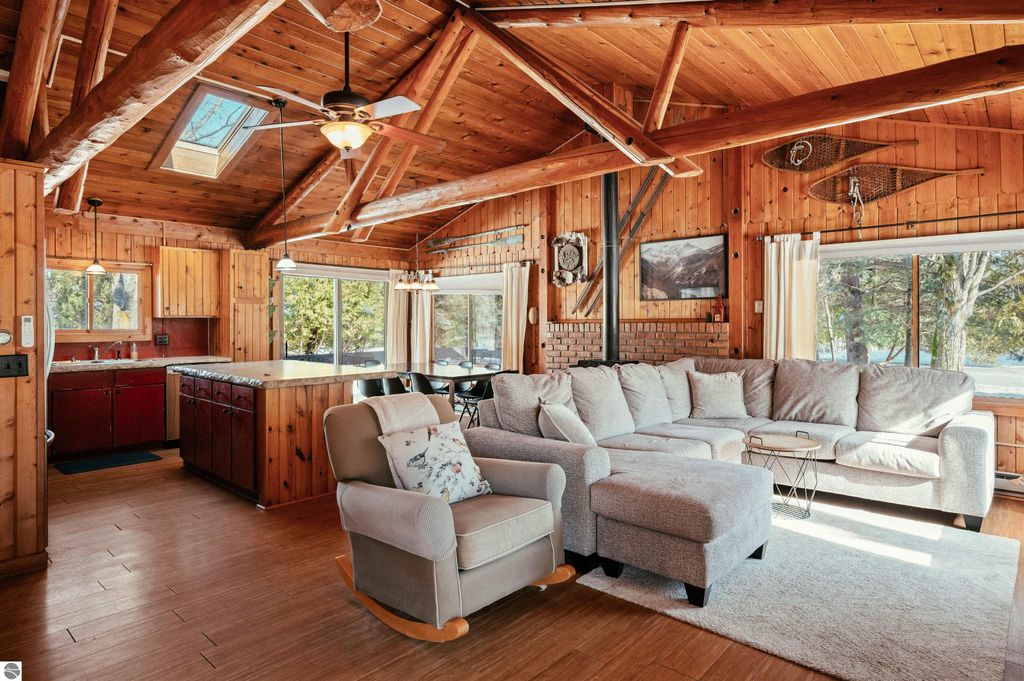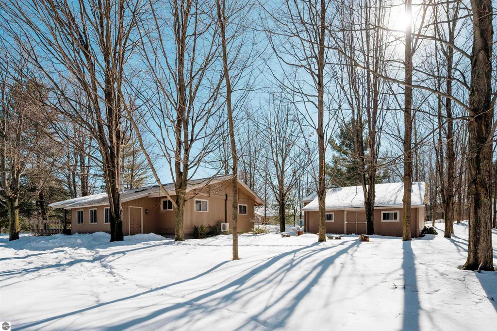 You want the unapologetic, rustic cabin vibe, but you also refuse to have cold feet when you step out of the shower. Welcome home! The interior is defined by solid post-and-beam construction, where soaring wood ceilings and a river stone entry immediately set the tone. Designed for year-round comfort, the home features mini-split heating and air conditioning, heated bathroom floors (because suffering is completely unnecessary), and an inviting electric fireplace, giving you all the Up North ambiance with zero wood-chopping required. Outside, an expansive wraparound deck overlooks the private, wooded backyard and a dedicated bonfire area. The home is equipped with a durable metal roof and a detached, oversized two-car garage, offering the essential utility and storage space needed for Northern Michigan living. The location is fantastic: just a short commute to town, right around the corner from Timberlee for winter snow tubing, association tennis courts, and offering the ultimate amenity, exclusive association beach access to South Lake Leelanau. Enjoy approximately 800 feet of shared sandy frontage, a clubhouse, and kayak/SUP storage. A solid build in a superior location, ready for its next chapter!