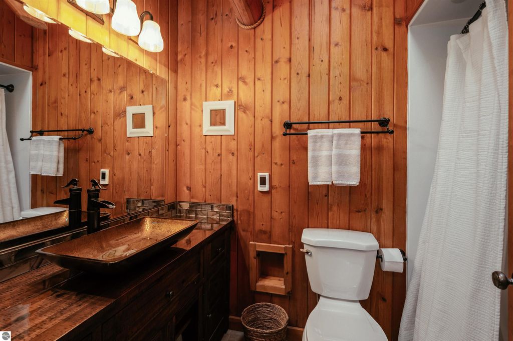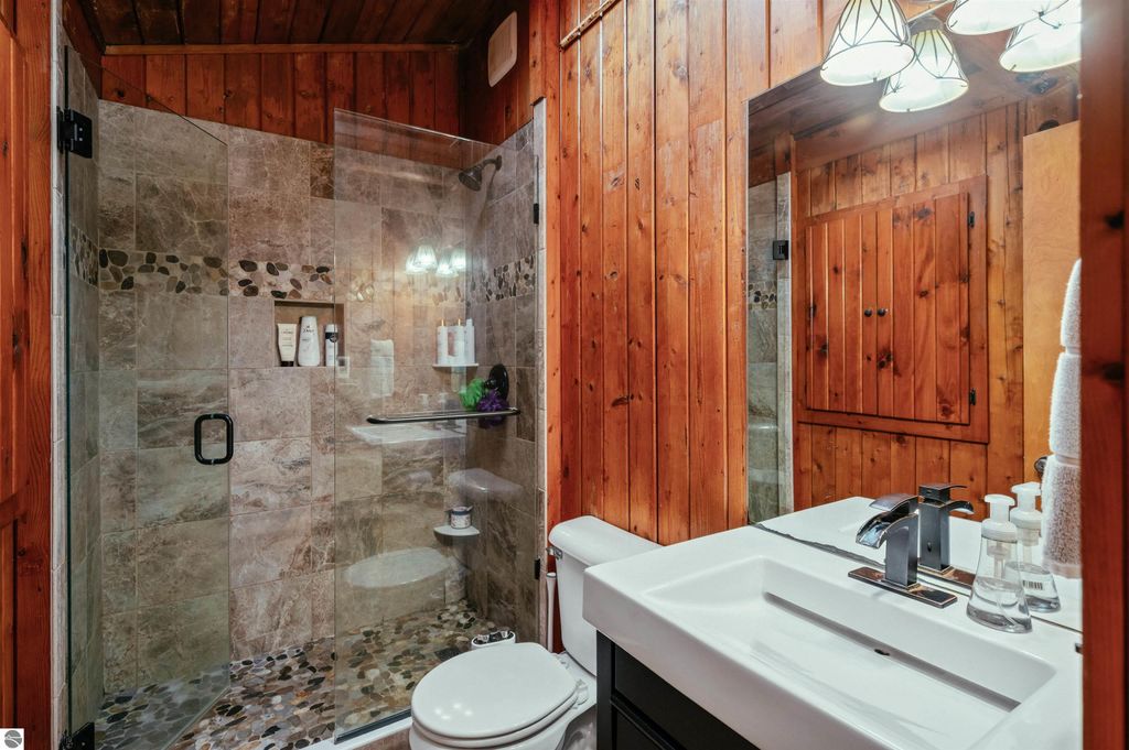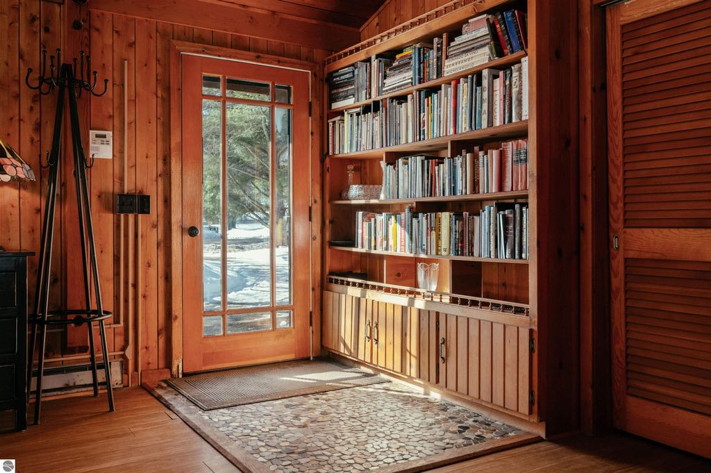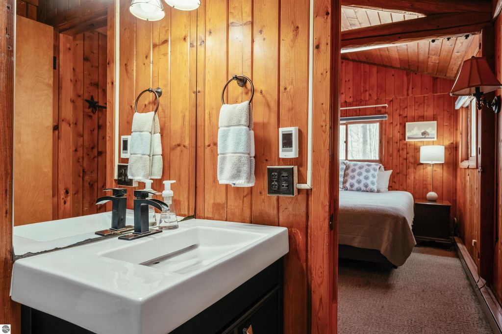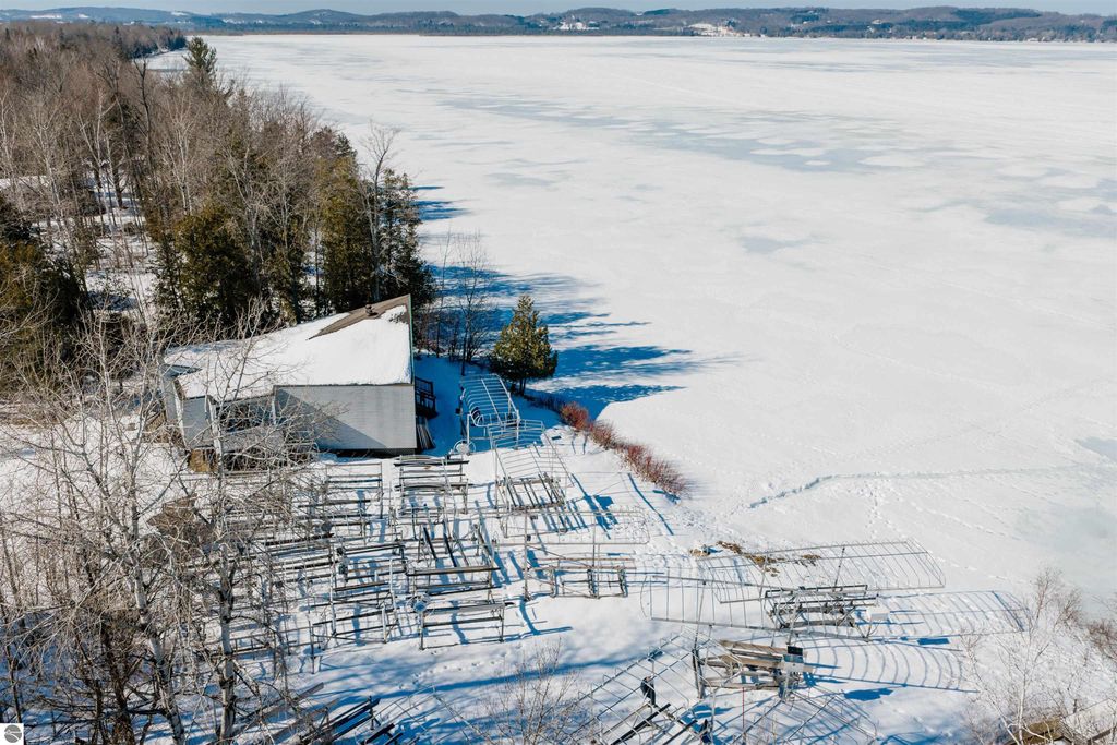 You want the unapologetic, rustic cabin vibe, but you also refuse to have cold feet when you step out of the shower. Welcome home! The interior is defined by solid post-and-beam construction, where soaring wood ceilings and a river stone entry immediately set the tone. Designed for year-round comfort, the home features mini-split heating and air conditioning, heated bathroom floors (because suffering is completely unnecessary), and an inviting electric fireplace, giving you all the Up North ambiance with zero wood-chopping required. Outside, an expansive wraparound deck overlooks the private, wooded backyard and a dedicated bonfire area. The home is equipped with a durable metal roof and a detached, oversized two-car garage, offering the essential utility and storage space needed for Northern Michigan living. The location is fantastic: just a short commute to town, right around the corner from Timberlee for winter snow tubing, association tennis courts, and offering the ultimate amenity, exclusive association beach access to South Lake Leelanau. Enjoy approximately 800 feet of shared sandy frontage, a clubhouse, and kayak/SUP storage. A solid build in a superior location, ready for its next chapter!